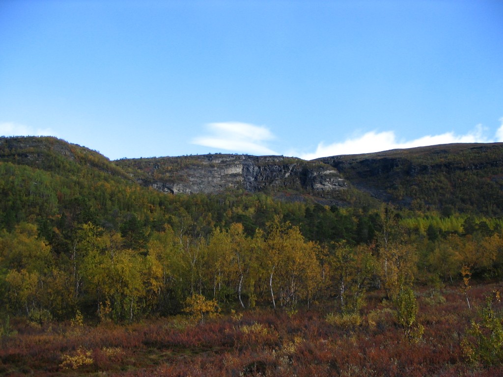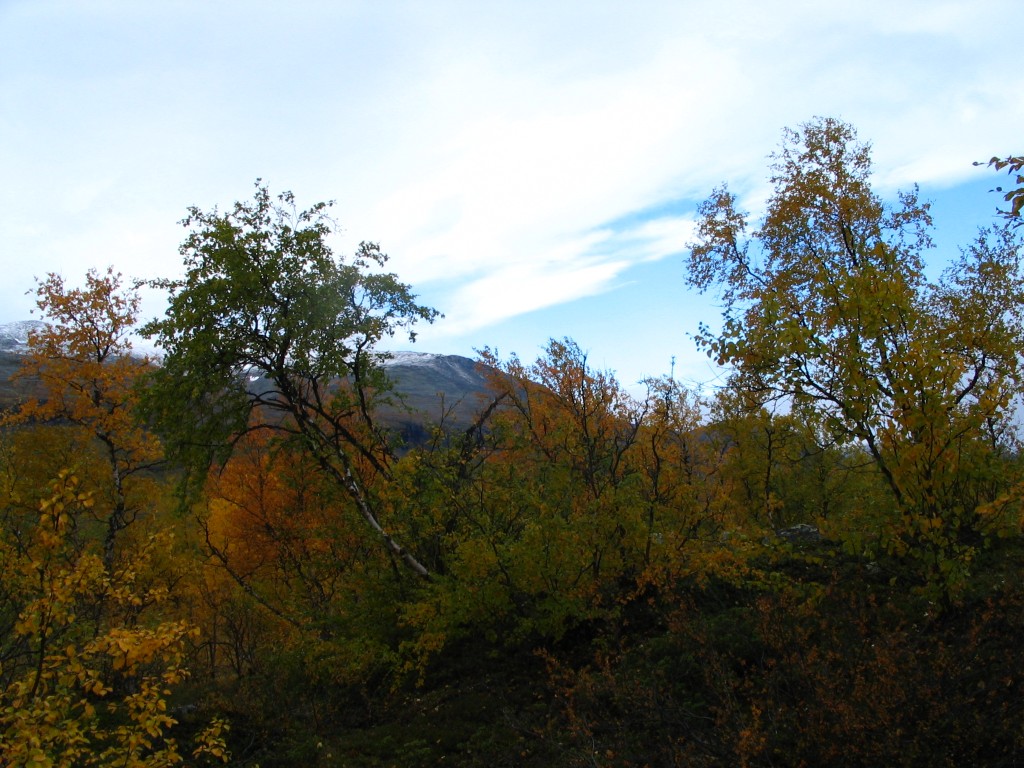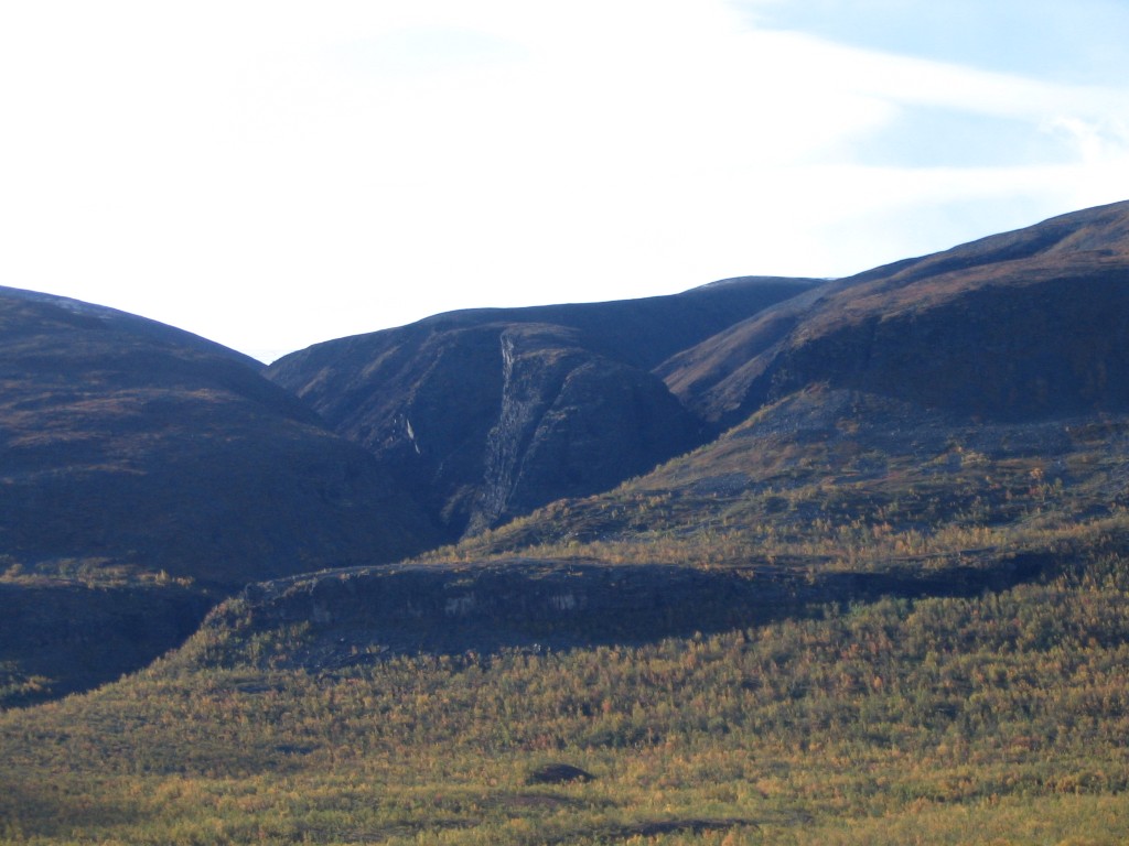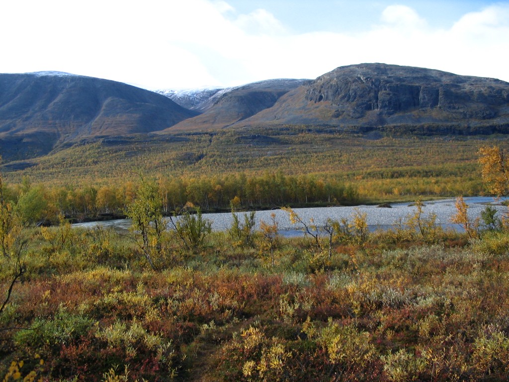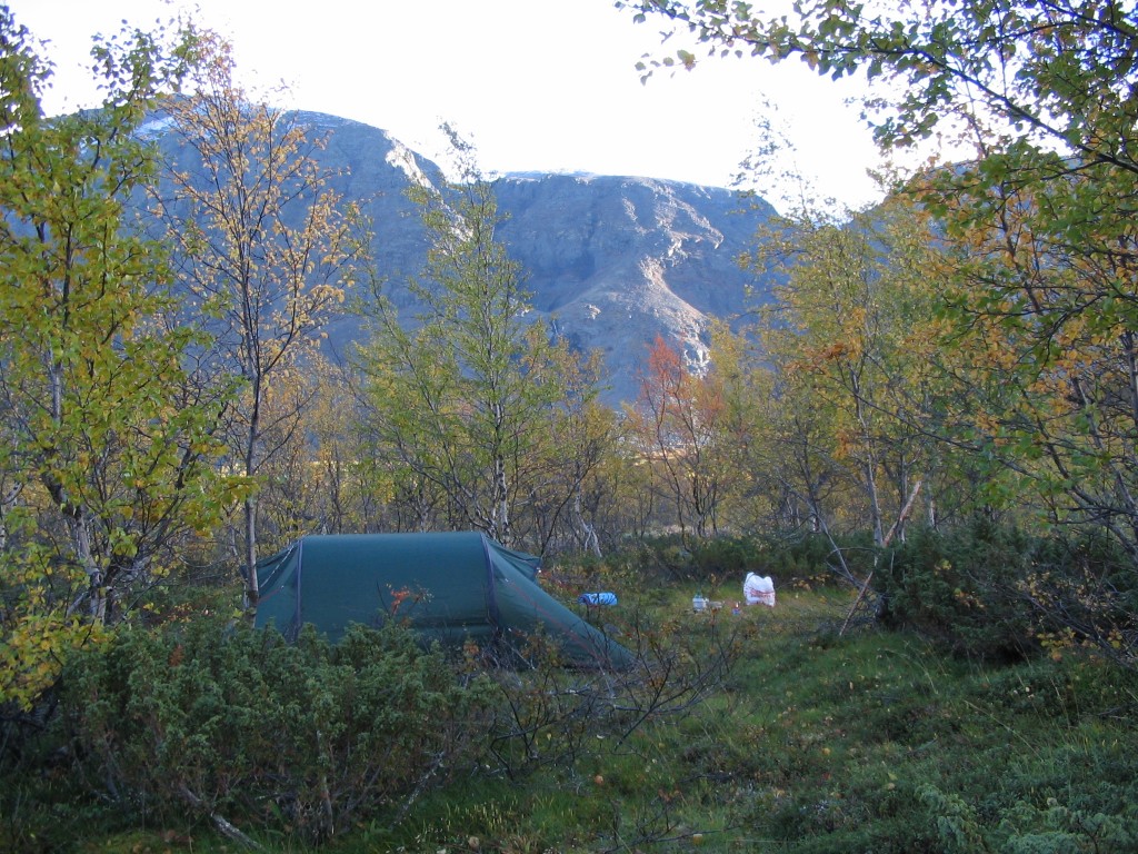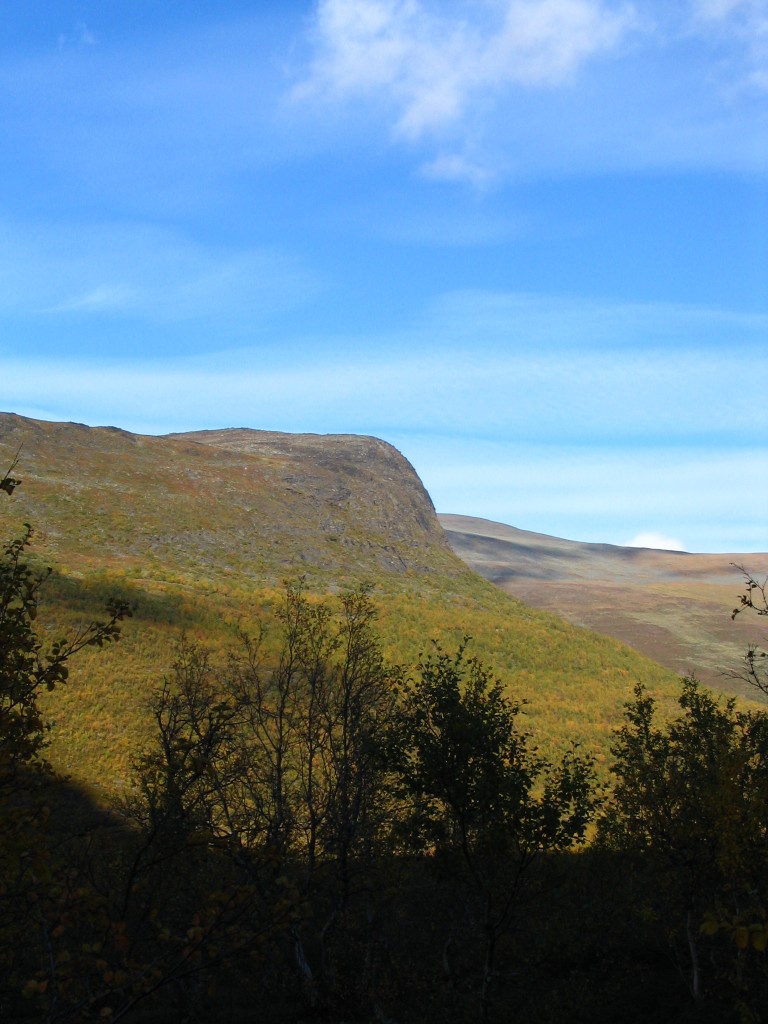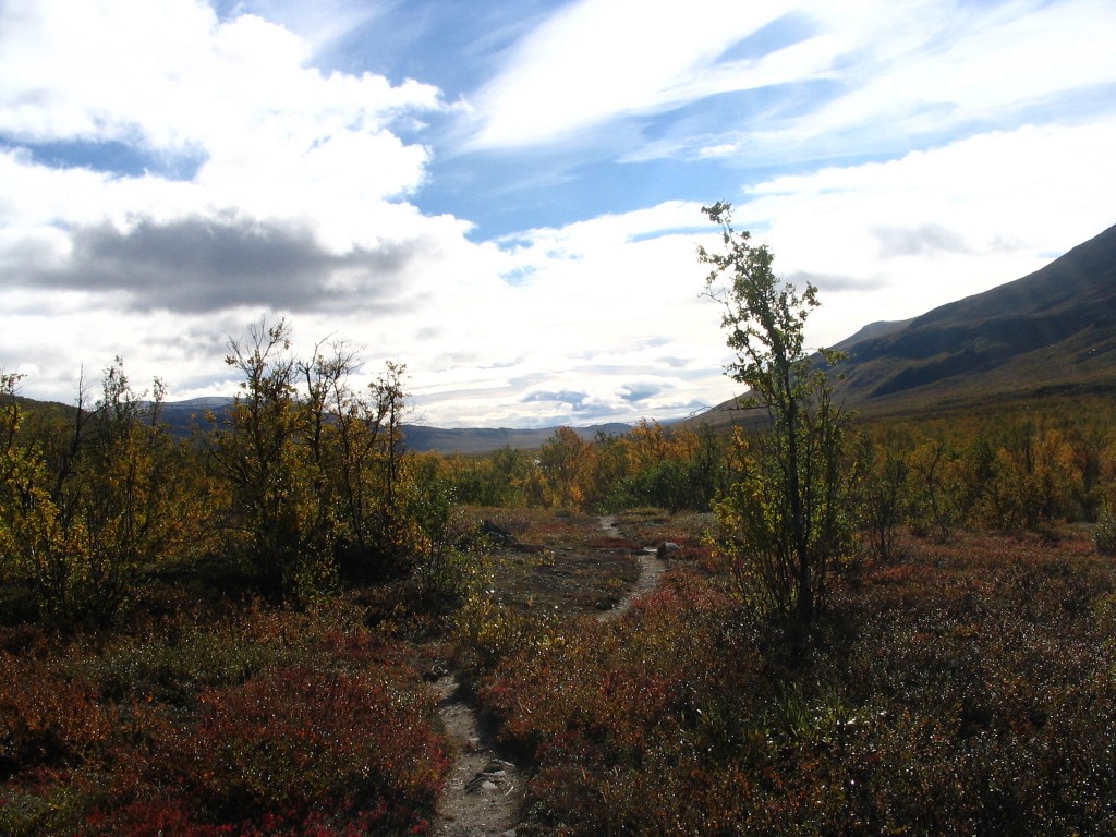 A bit further along the path, I smelt smoke, and the proverbial fire soon came into view. I first thought that perhaps it belonged to the hunter from yesterday, but it was actually three campers and a dog. The sun gradually broke through the clouds as the morning progressed, bringing the colors to full life. I also saw a helicopter over Gaskkasvággi, heading south; I'm not sure what its errand might have been.