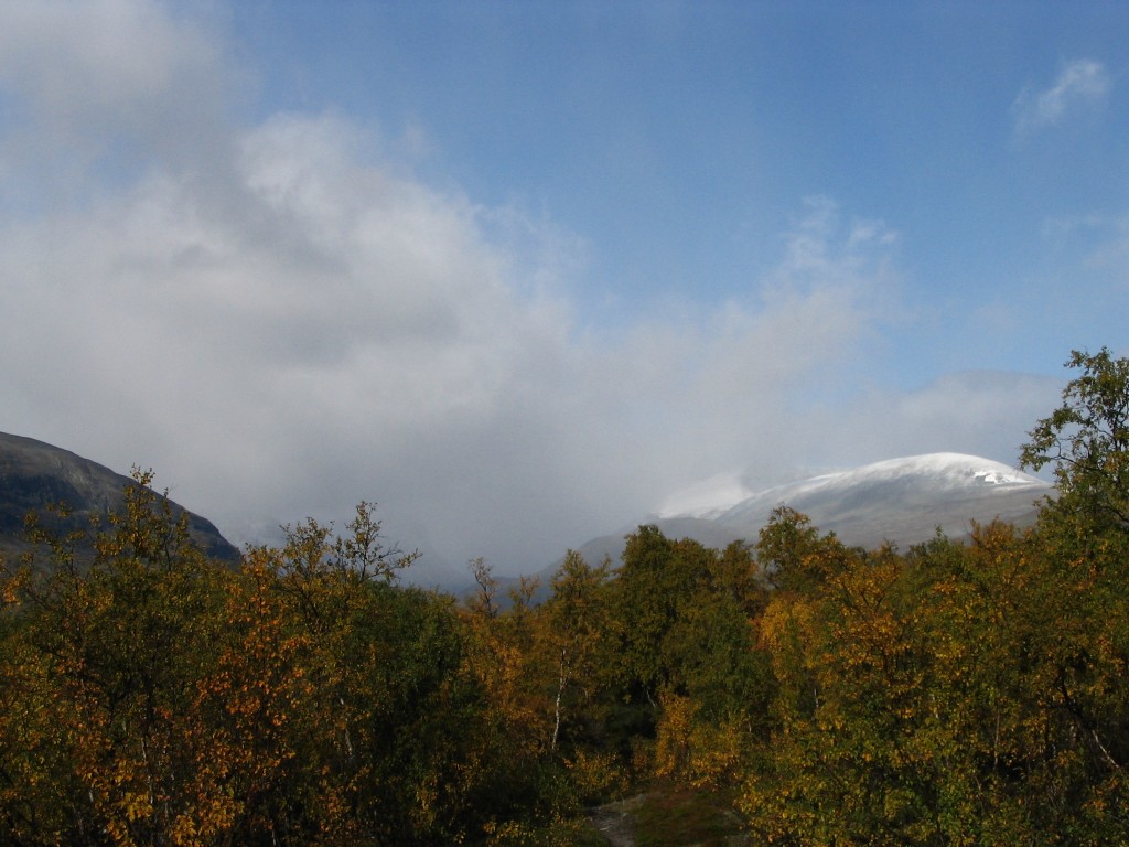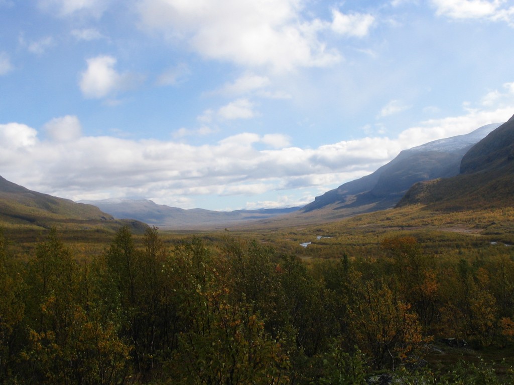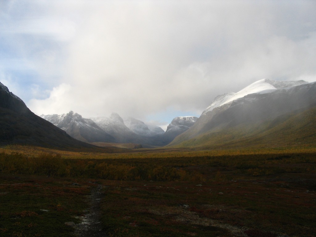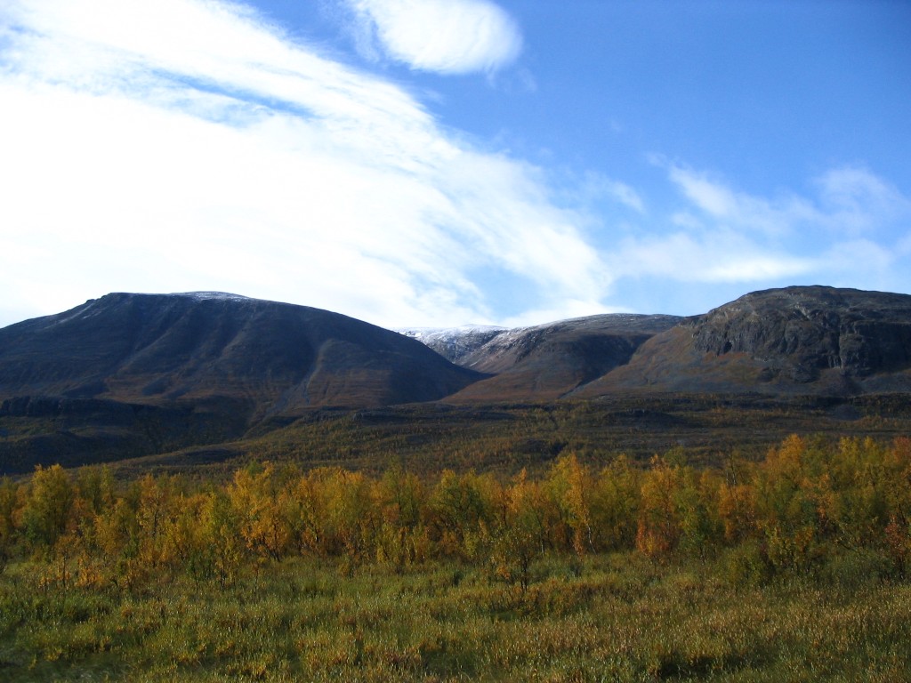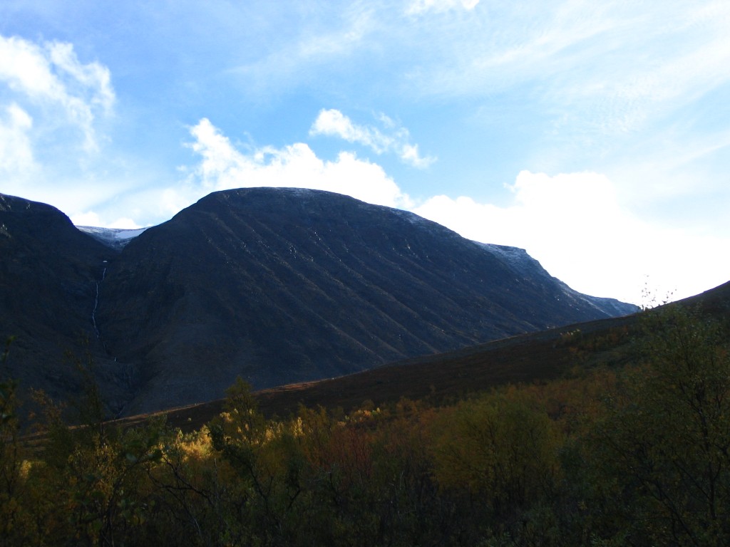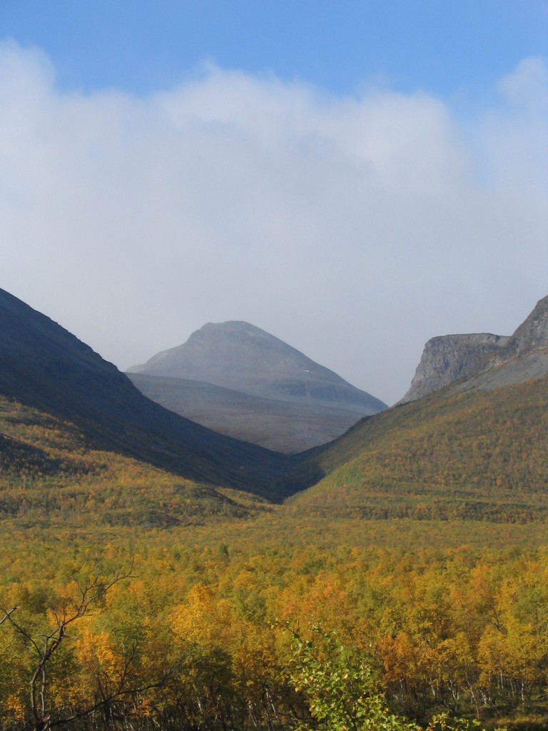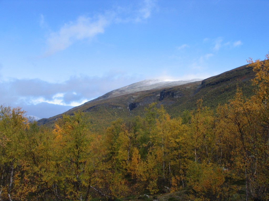 A bit further along the path, I smelt smoke, and the proverbial fire soon came into view. I first thought that perhaps it belonged to the hunter from yesterday, but it was actually three campers and a dog. The sun gradually broke through the clouds as the morning progressed, bringing the colors to full life. I also saw a helicopter over Gaskkasvággi, heading south; I'm not sure what its errand might have been.