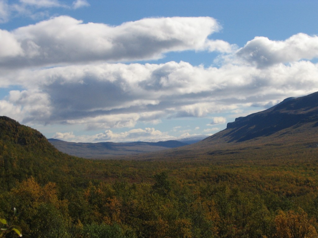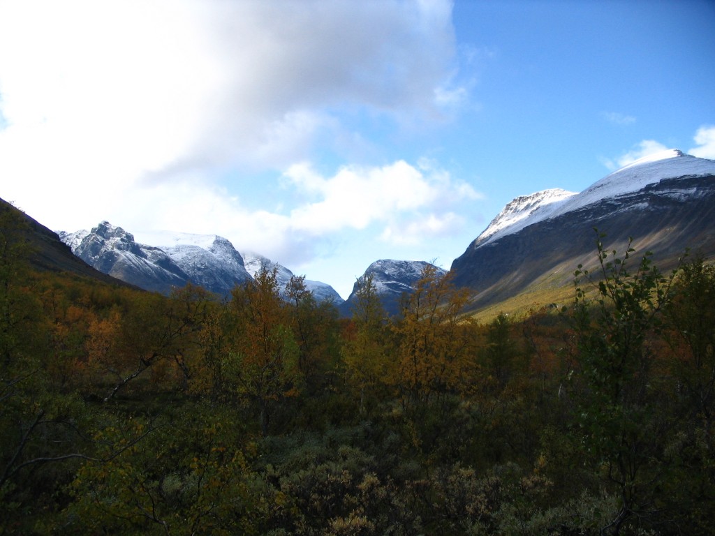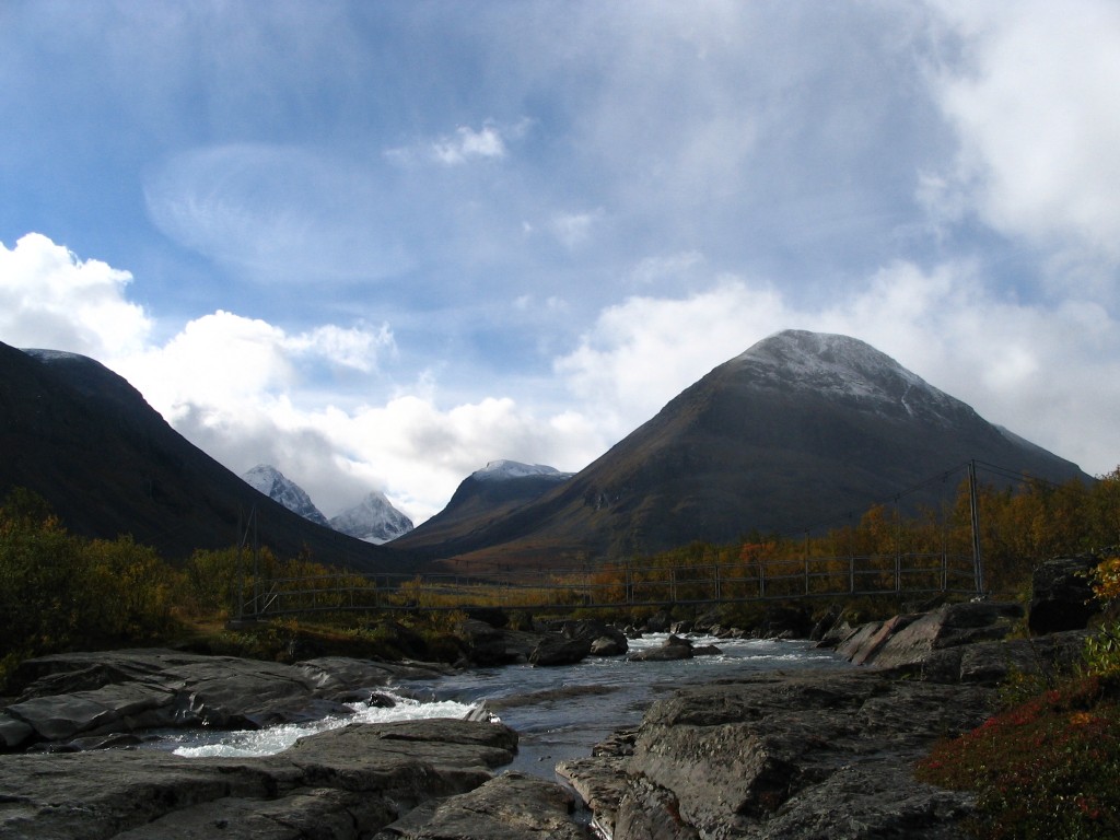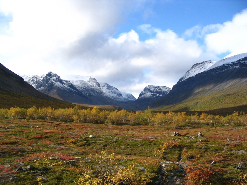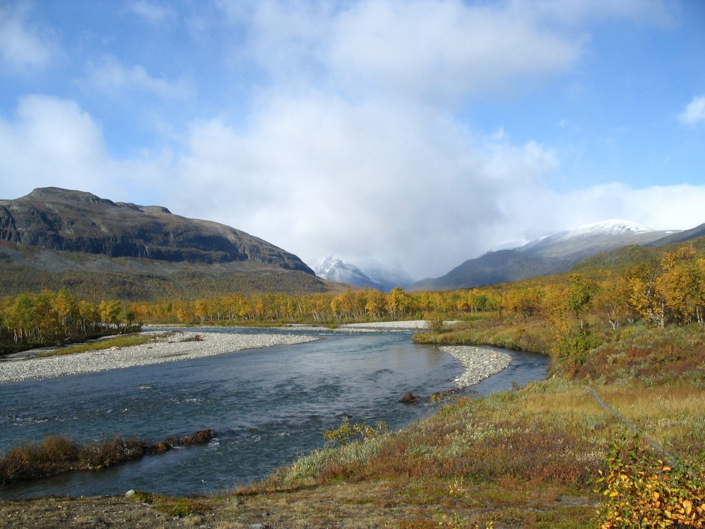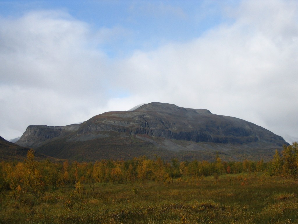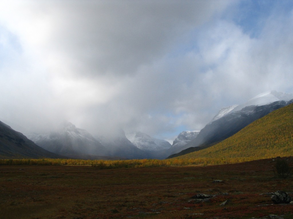 A bit further along the path, I smelt smoke, and the proverbial fire soon came into view. I first thought that perhaps it belonged to the hunter from yesterday, but it was actually three campers and a dog. The sun gradually broke through the clouds as the morning progressed, bringing the colors to full life. I also saw a helicopter over Gaskkasvággi, heading south; I'm not sure what its errand might have been.