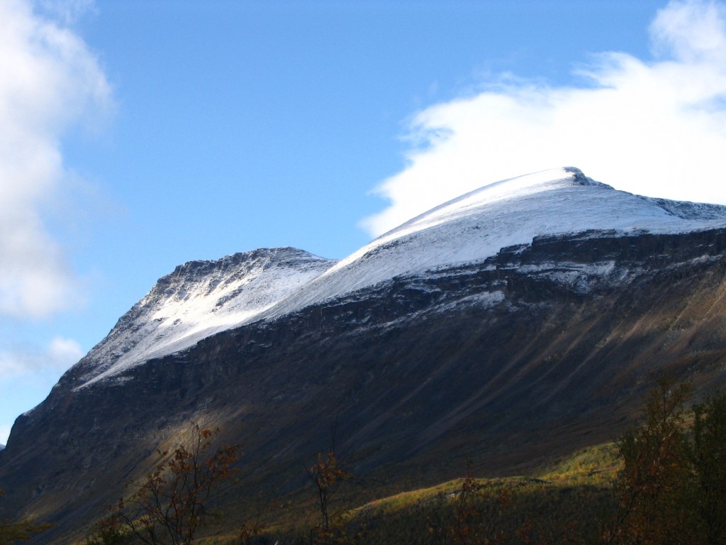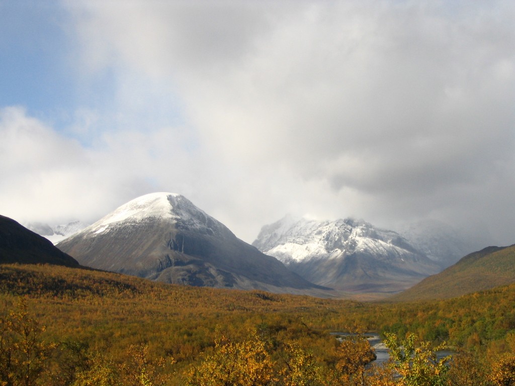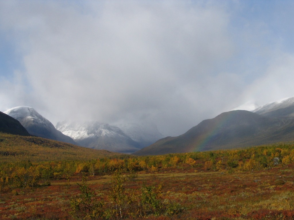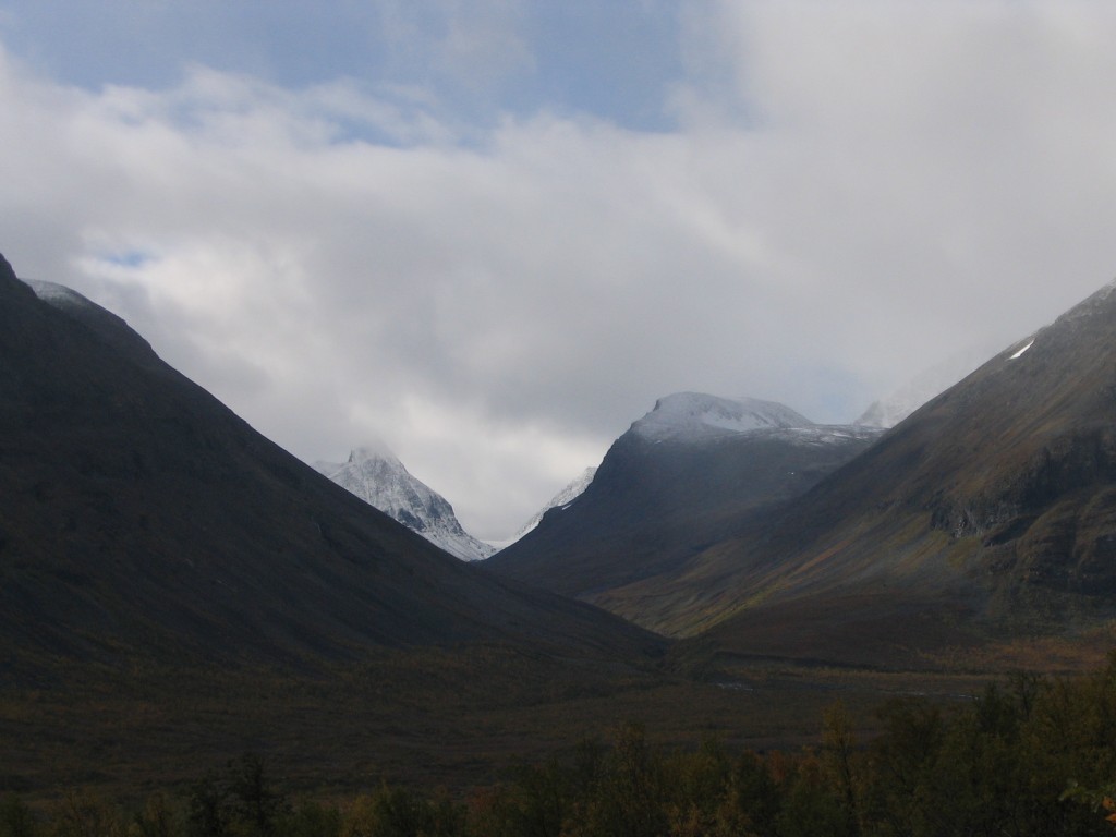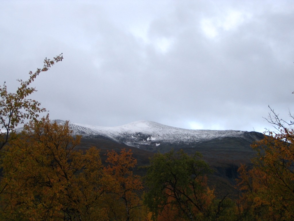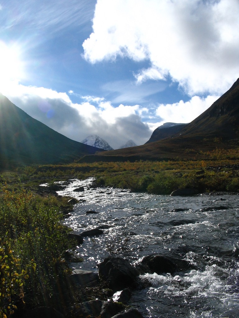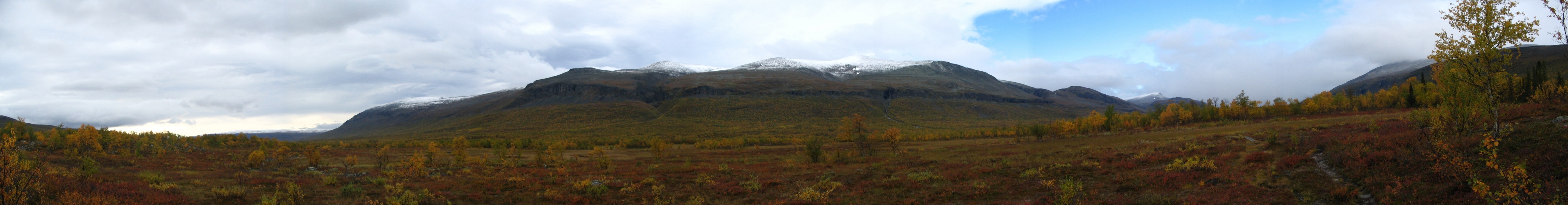 A bit further along the path, I smelt smoke, and the proverbial fire soon came into view. I first thought that perhaps it belonged to the hunter from yesterday, but it was actually three campers and a dog. The sun gradually broke through the clouds as the morning progressed, bringing the colors to full life. I also saw a helicopter over Gaskkasvággi, heading south; I'm not sure what its errand might have been.