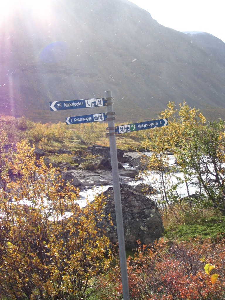 Before leaving, I finally yielded and put on the rain cover. And, naturally, as though ordained by Fate, the rain/hail/snow stopped shortly thereafter. I was soon at the lower bridge over Visttasjohka, where I saw the first distance signs since the main road the day before. It did nothing but add to the confusion – now the distance Nikkaluokta–Vistas is 29 km? (To add insult to injury, the distance in question is also given as 34 km on STF's overview maps.)