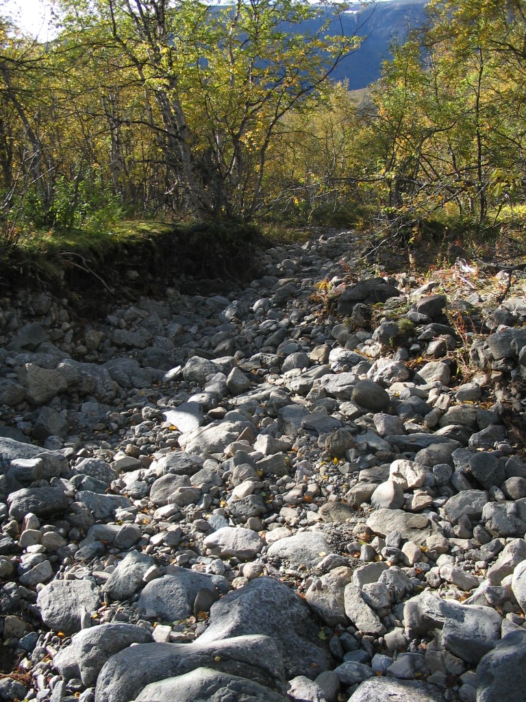 While I was standing at the bridge, there was one last burst of hail, and then nothing for the rest of the day. I followed the trail to the Kaskavagge shelter on the other side until it reached a sign saying, "Bridge, 1 km", where it made a sharp turn to the southeast. There was also an old trail leading off northwestward, which I took; it wound through the forest, growing more and more obscure by the pace before finally degrading to what might well not have been made by humans at all. It wasn't long, however, before I could hear the stream coming from Unna Reaiddávággi, and then I stood on its brink.