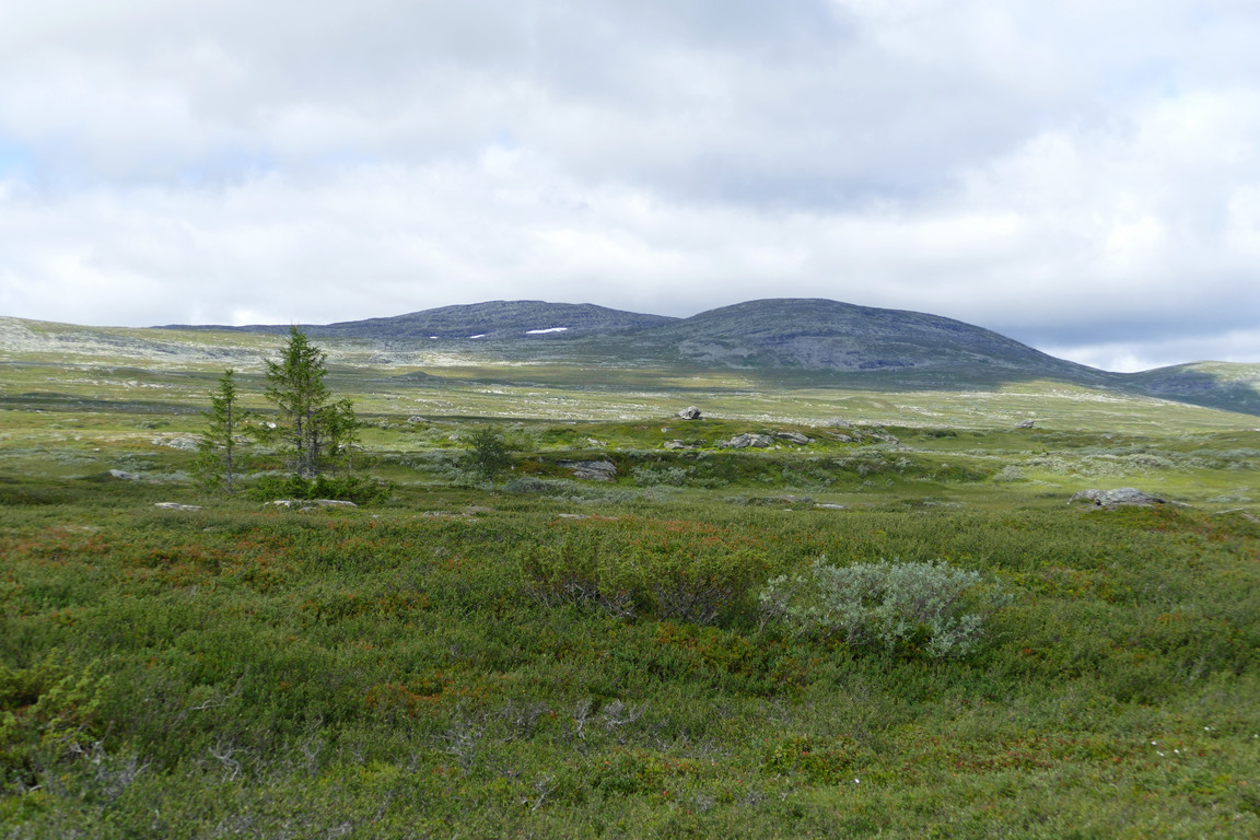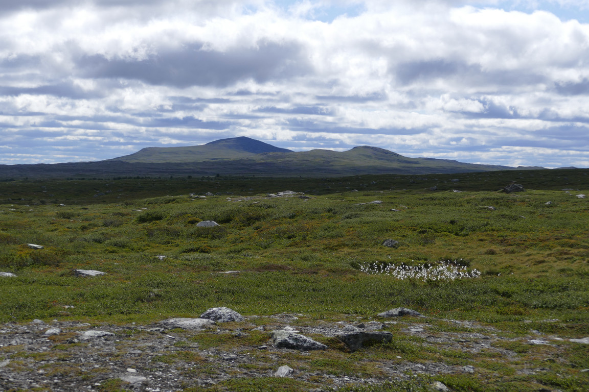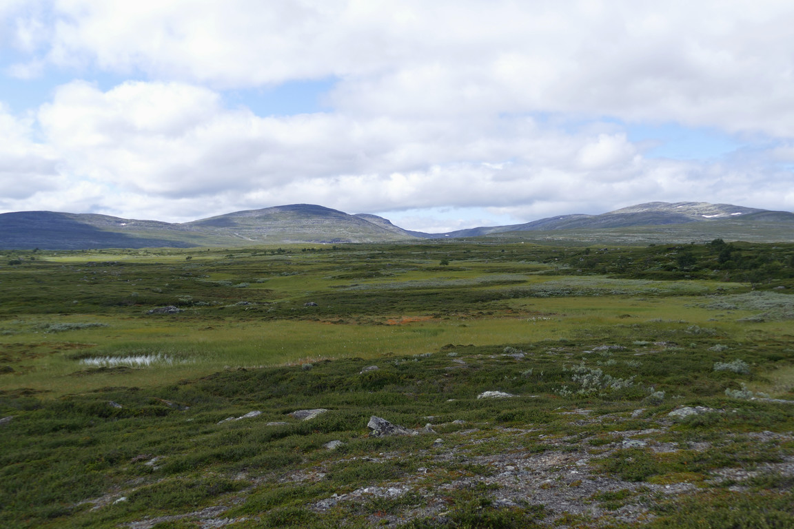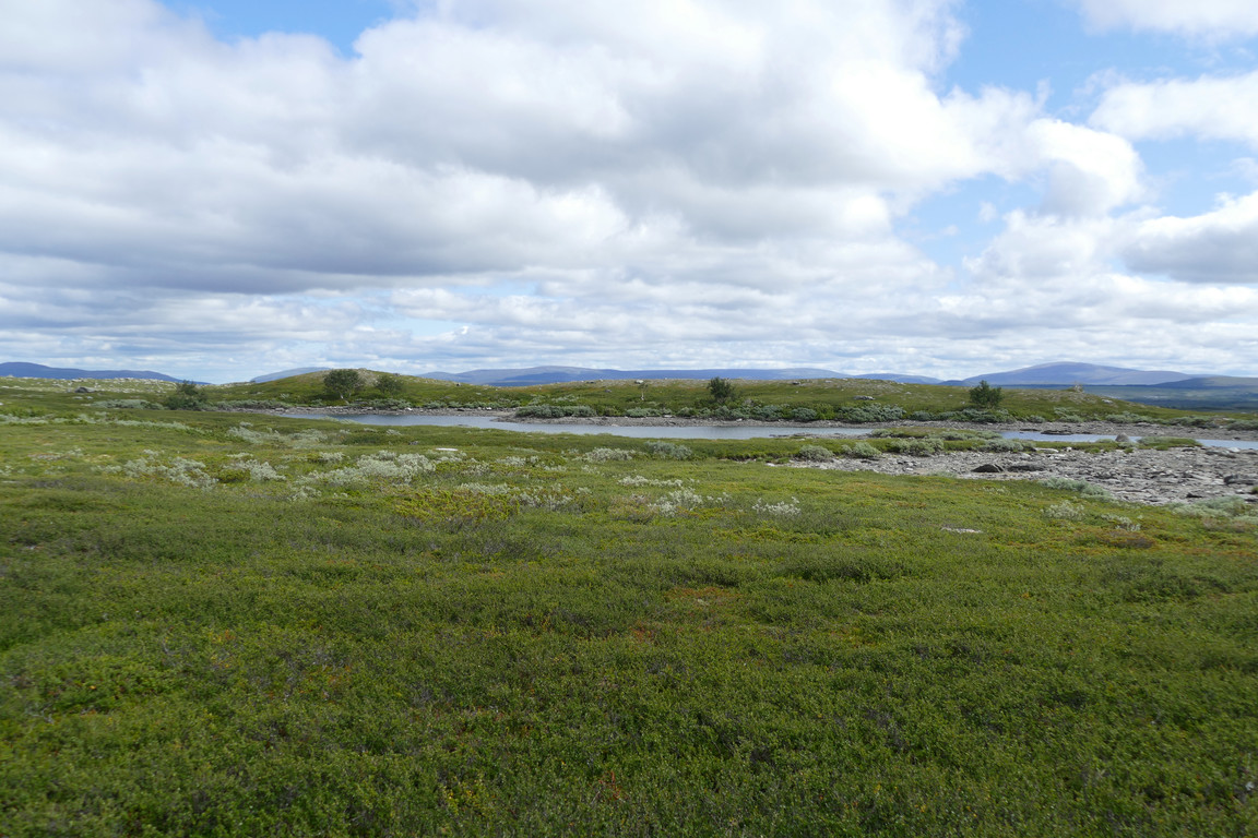 I followed the westbound trail across the outflow from Anarisstugtjärnen and then turned south, walking on a mixture of low shrubs and mireland riddled with blueberries west of the tarn. I passed what I guessed had been the site of the tent I had seen around here the day before, and then crossed the stream from the higher tarn where I was headed first. Before that, however, I continued on towards a scattering of pools and hills straight ahead, which made for a very nice scene.