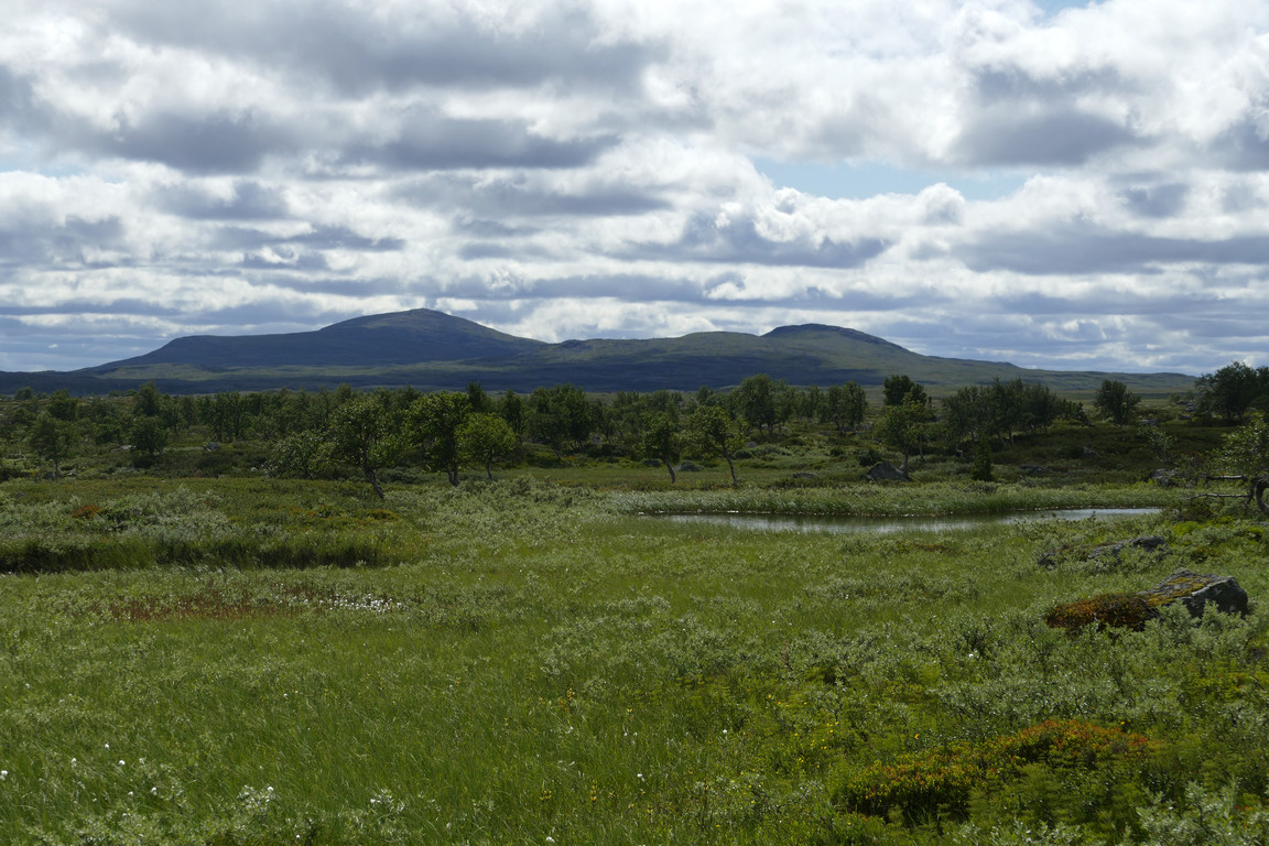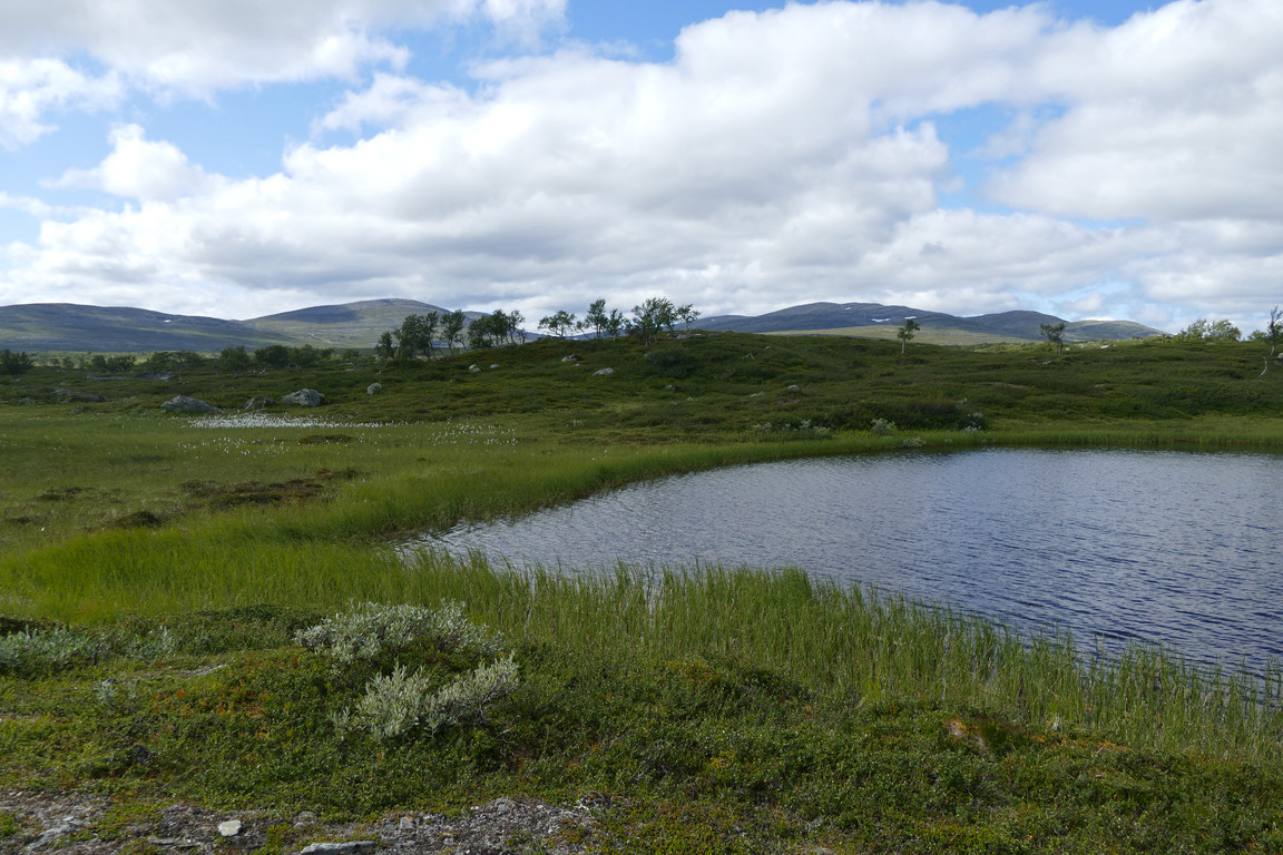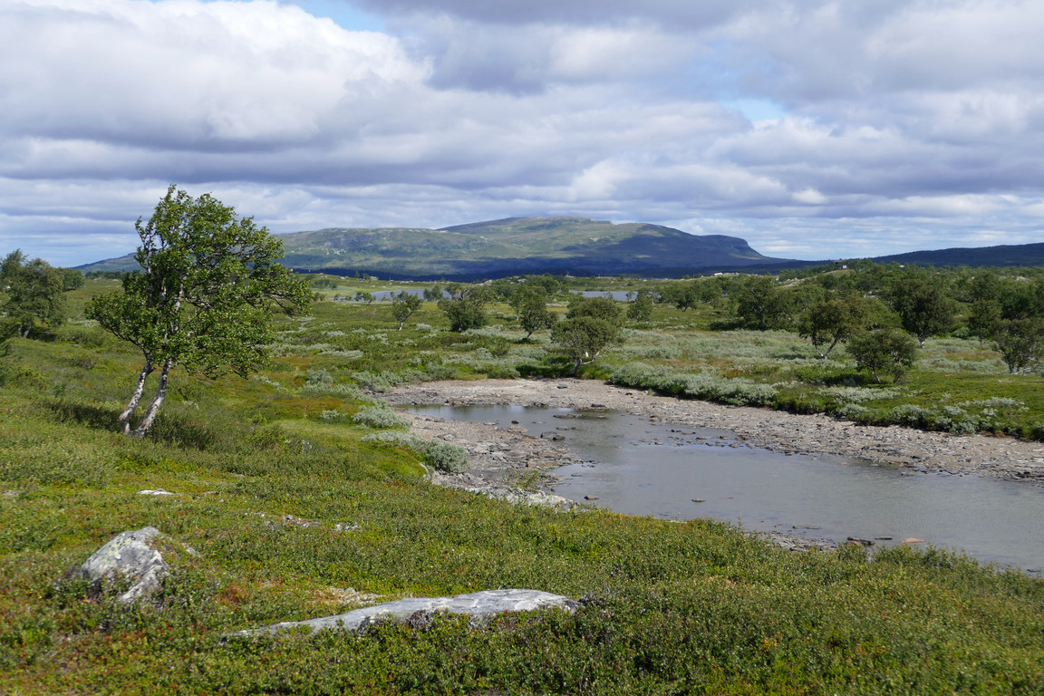 When the sparse trees started amassing into actual woods I turned up the slope, soon reaching the winding stream again, which I followed upwards. This stream was a very pretty one, with a number of small waterfalls with "landing pools", and I made a mental note about a campsite near one such pair with a spectacular view. At a collection of small pools further up I crossed to the western side, and after passing a narrow wet patch I found myself in a sea of cloudberries, so I munched and munched as I progressed towards the larger tarn.