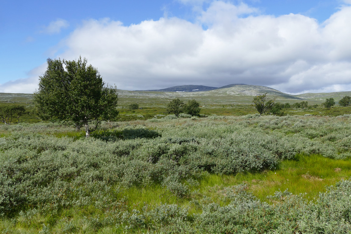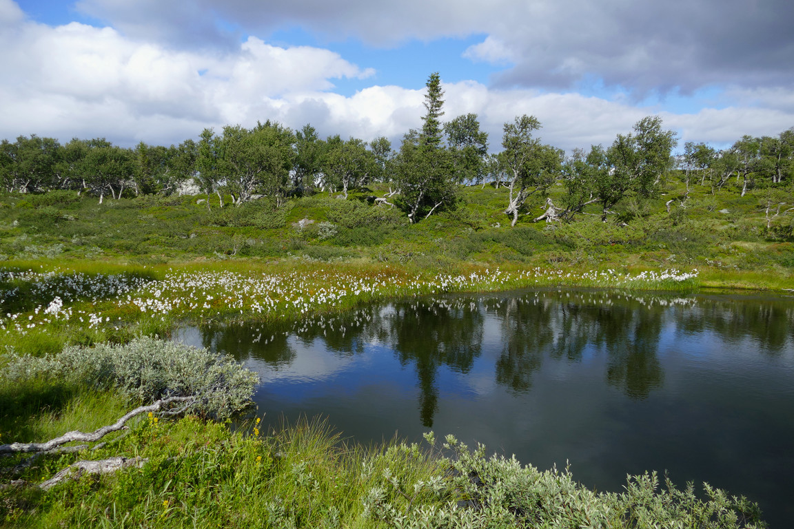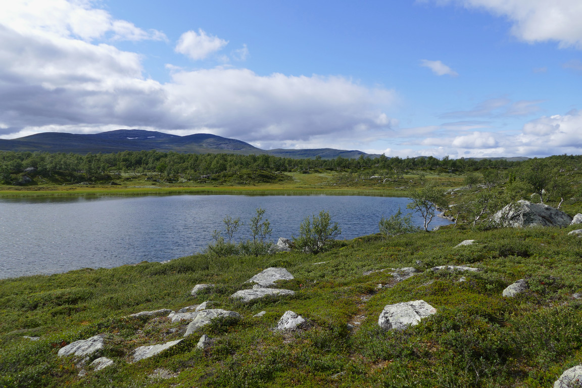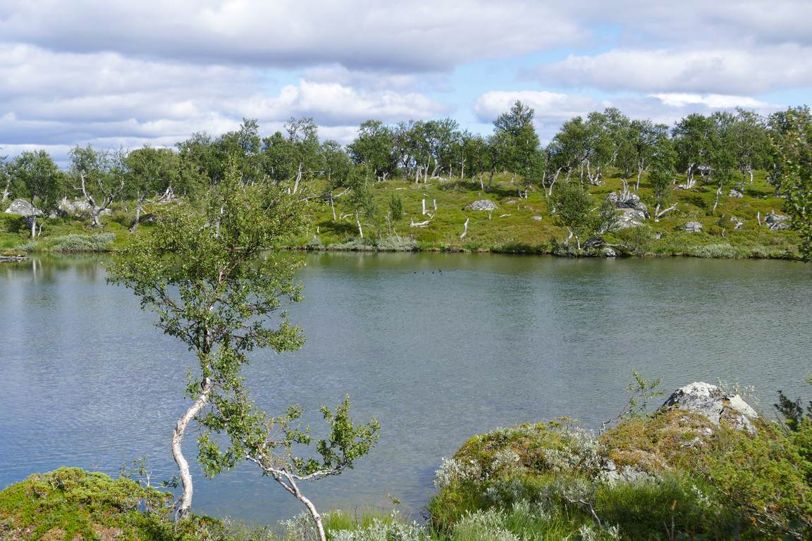 When the sparse trees started amassing into actual woods I turned up the slope, soon reaching the winding stream again, which I followed upwards. This stream was a very pretty one, with a number of small waterfalls with "landing pools", and I made a mental note about a campsite near one such pair with a spectacular view. At a collection of small pools further up I crossed to the western side, and after passing a narrow wet patch I found myself in a sea of cloudberries, so I munched and munched as I progressed towards the larger tarn.