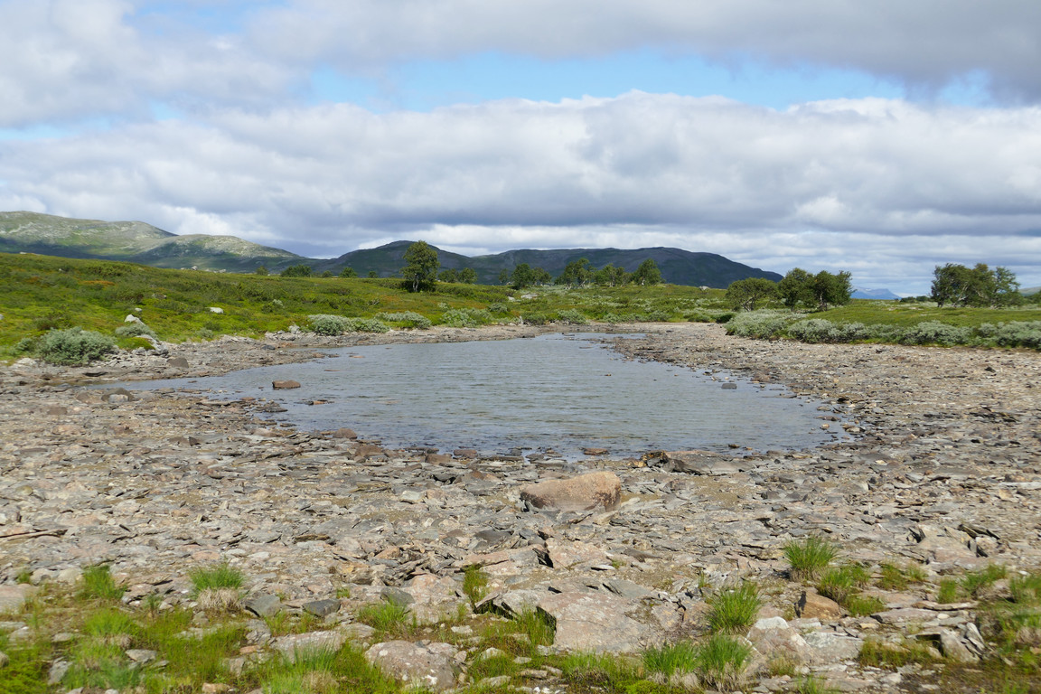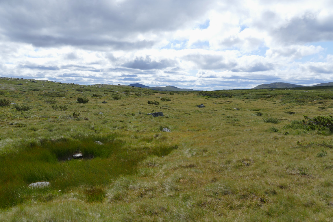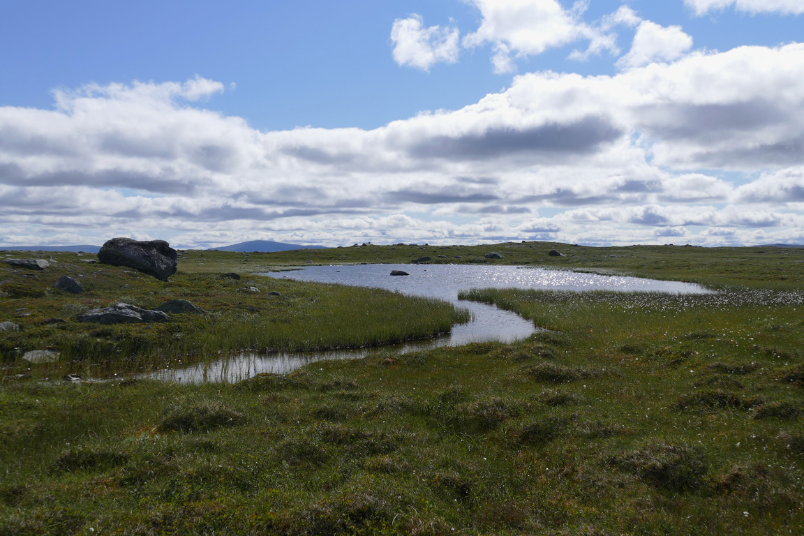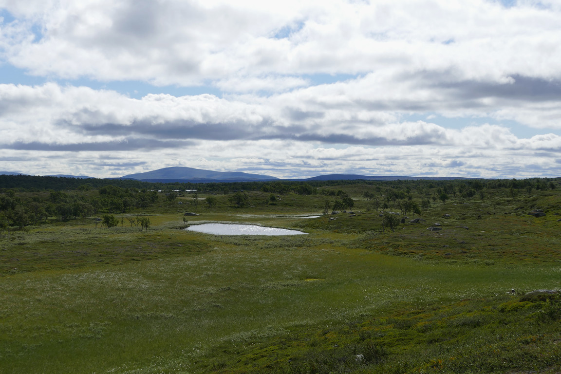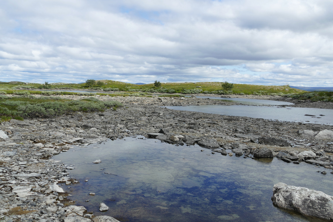 I pulled out my earplugs and started listening to the web radio transmission of the Olympic pole vault finale, where our own Armand Duplantis was almost sure to win the gold. I also put on the down jacket against the wind, which was quite strong, and whenever the sun was clouded (which it often was) it was rather chilly. Apart from a bird or two the only other living soul I saw was a reindeer which lay resting on a nearby crest. When I got going again I followed the continuation of the grassland, which was almost entirely flat, and had no trouble hitting the next group of pools I was aiming for.