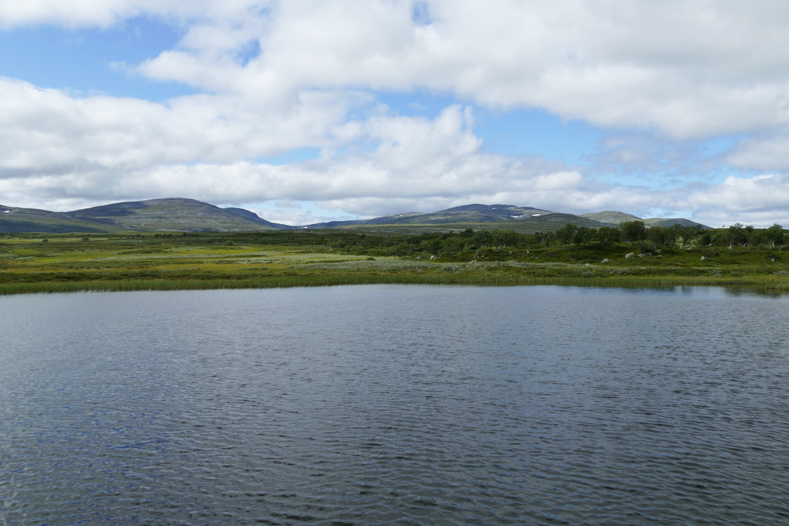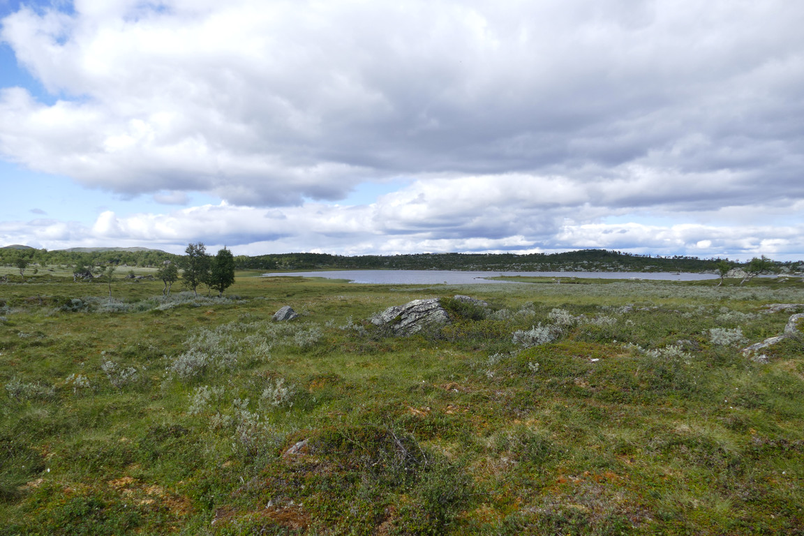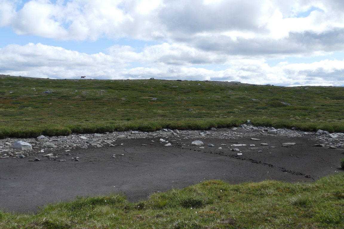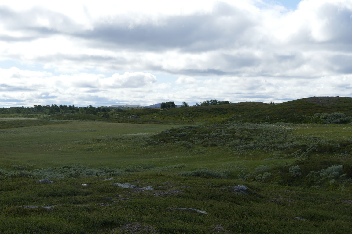 I pulled out my earplugs and started listening to the web radio transmission of the Olympic pole vault finale, where our own Armand Duplantis was almost sure to win the gold. I also put on the down jacket against the wind, which was quite strong, and whenever the sun was clouded (which it often was) it was rather chilly. Apart from a bird or two the only other living soul I saw was a reindeer which lay resting on a nearby crest. When I got going again I followed the continuation of the grassland, which was almost entirely flat, and had no trouble hitting the next group of pools I was aiming for.