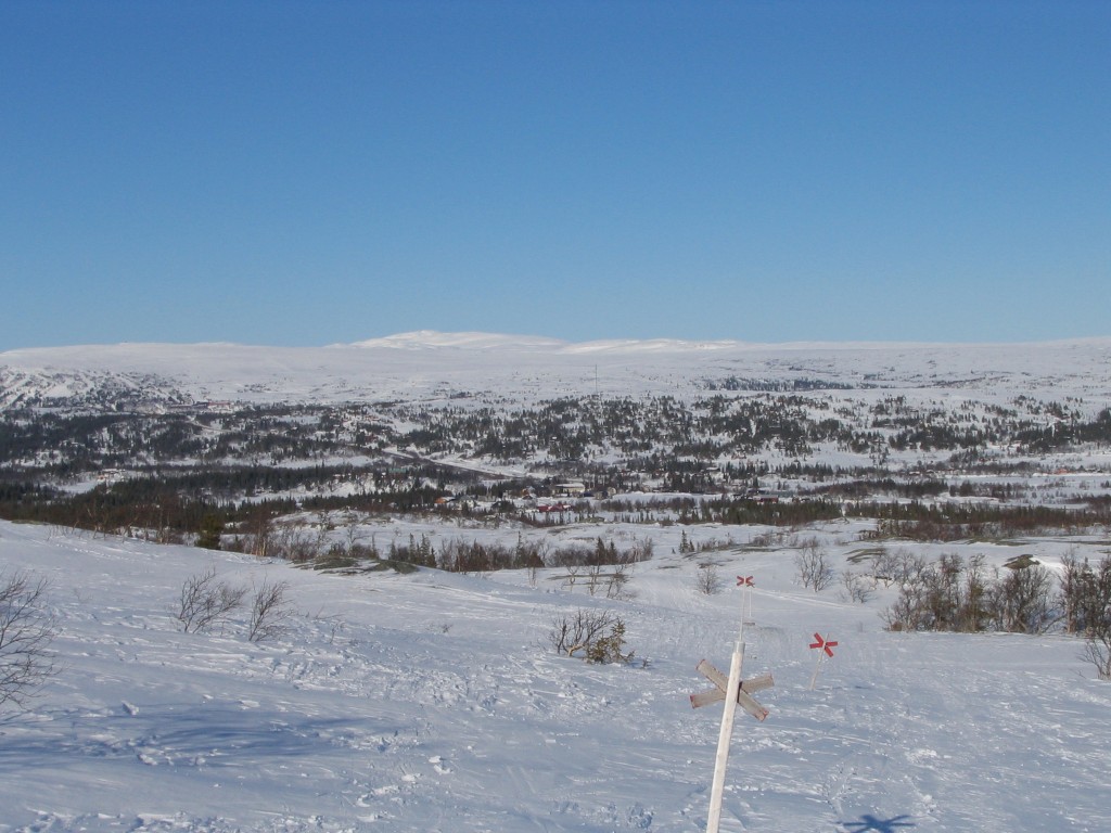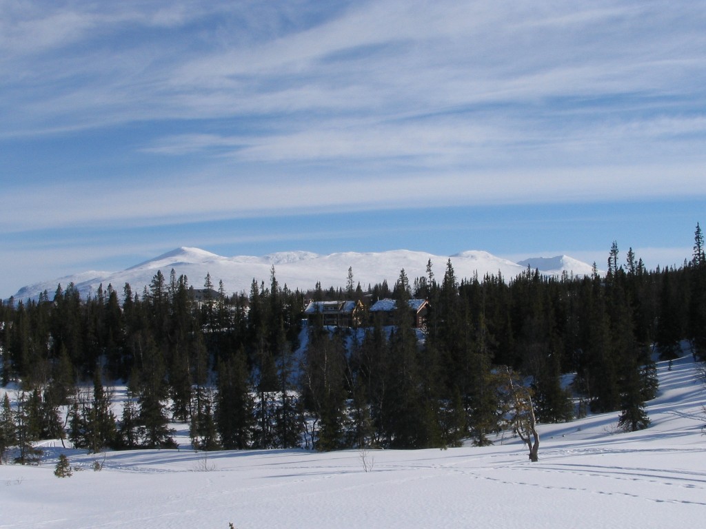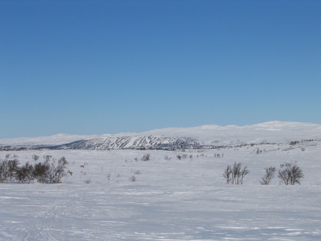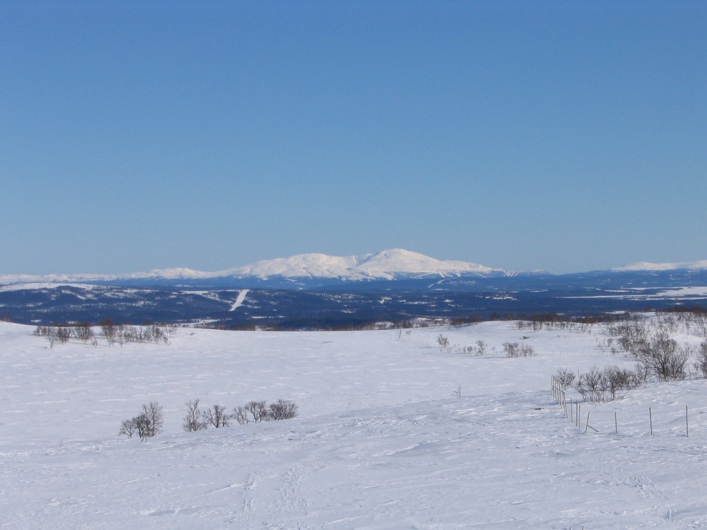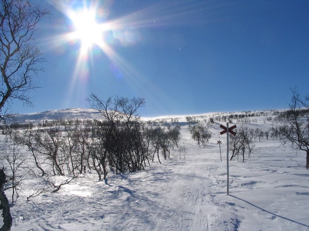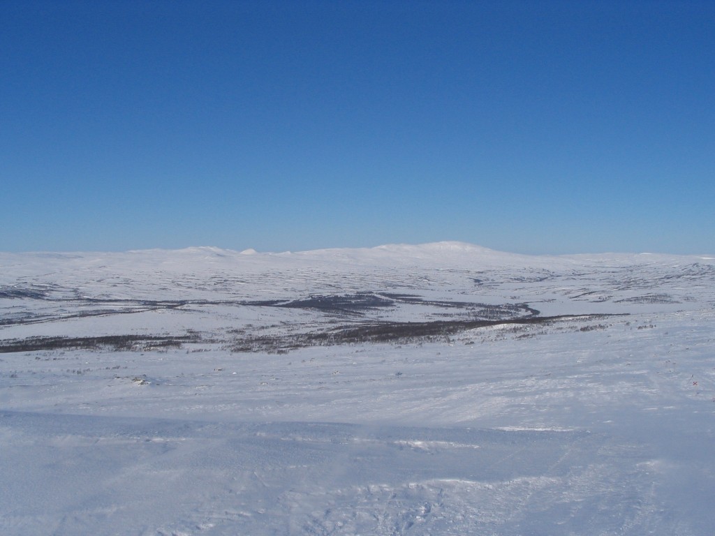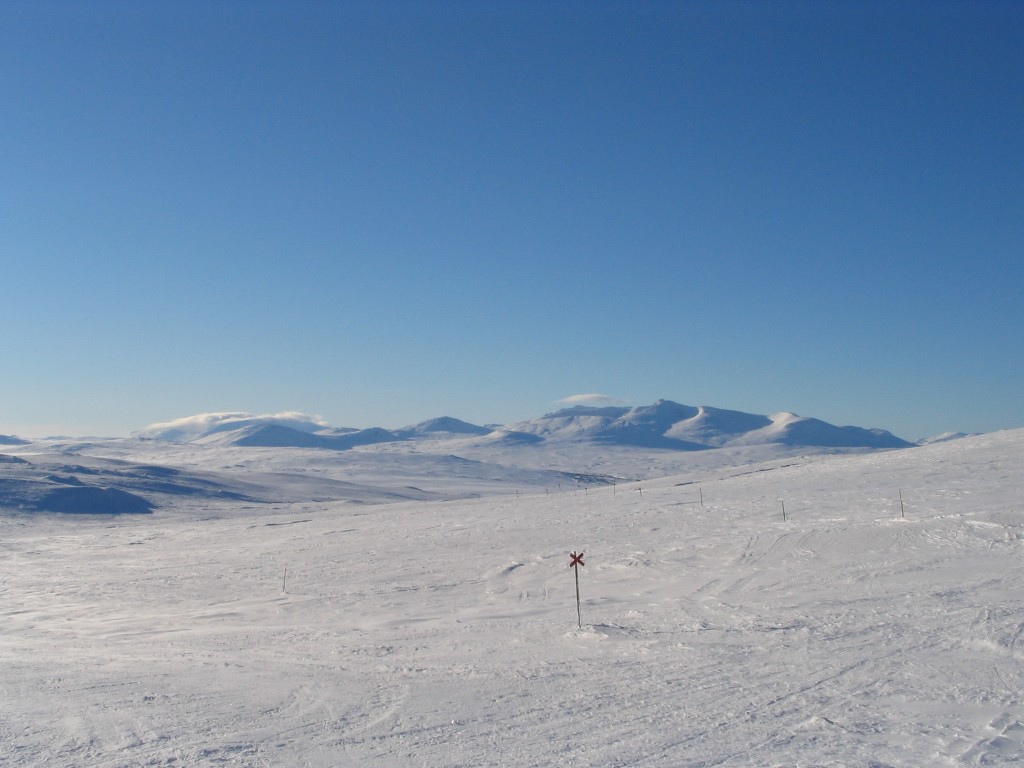 About a quarter to two in the afternoon, the discontinued breeze grew back, so I found it preferable to pack up and continue. Just a bit further down, the envious women were searching for a camp site of their own beneath a crest, after which I had a great downhill run to the crossroads above Storvallen – there's a whole bunch of skiing tracks and marked trails around there, but the main touring trail I was following made a bend around the village. In the forest, where it was calm again, I met a single gentleman before another nice downhill portion, but otherwise I didn't see anyone else before reaching the highway.