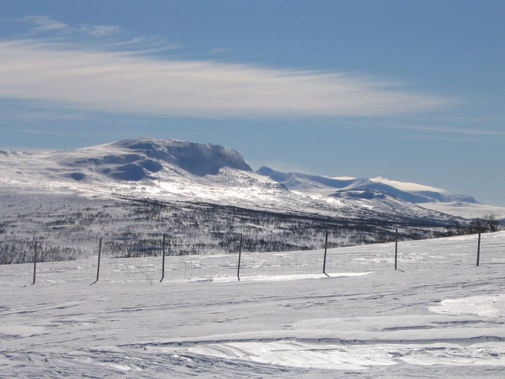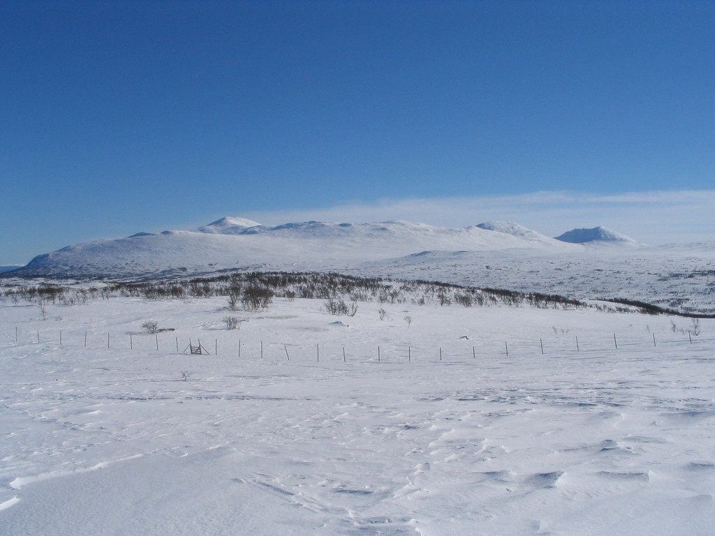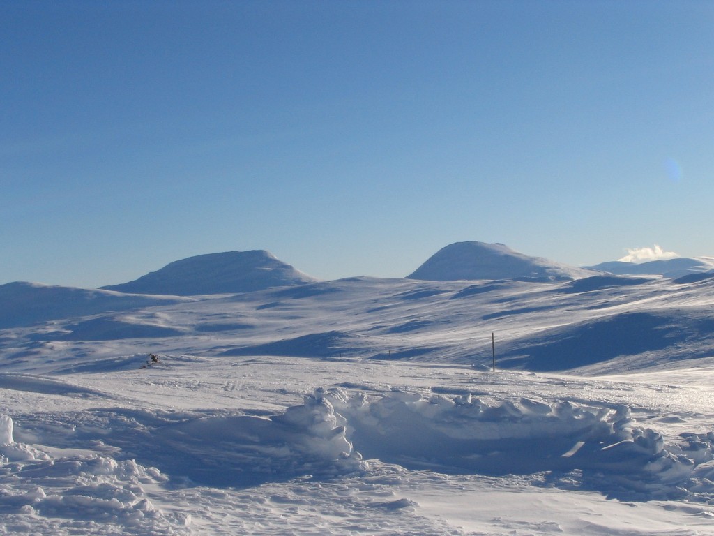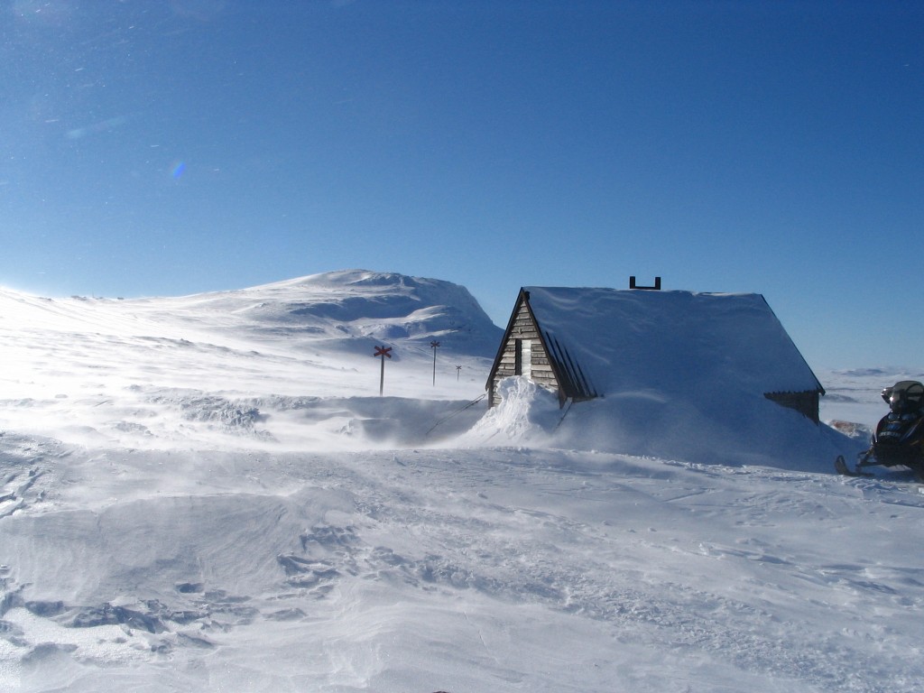 With the hard wind at my back, I began gliding down the mountainside, which after the first moderate slope turned into an arduous affair. The extensive abrasion had produced a base layer which was as near pure ice as snow can come and still be called snow, with conglomerations of hard-packed drift on top in most irregular patterns. What with both the relentless wind pushing me along and the substantial incline, I had to pick my way carefully, and I came close to falling several times. At the Gräslidfjället shelter some kilometers down, there was a snowmobile the driver of which apparently was a maintenance worker checking up on the building. From there on, the condition of the trail was better, so that I could hold a more direct course downwards.