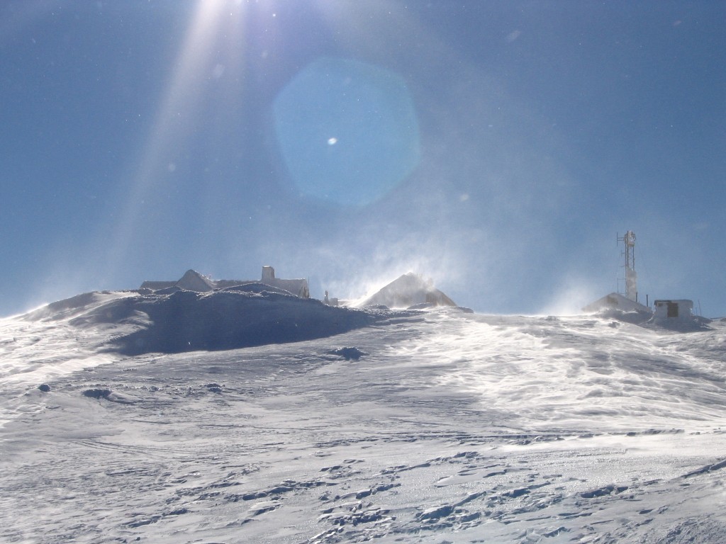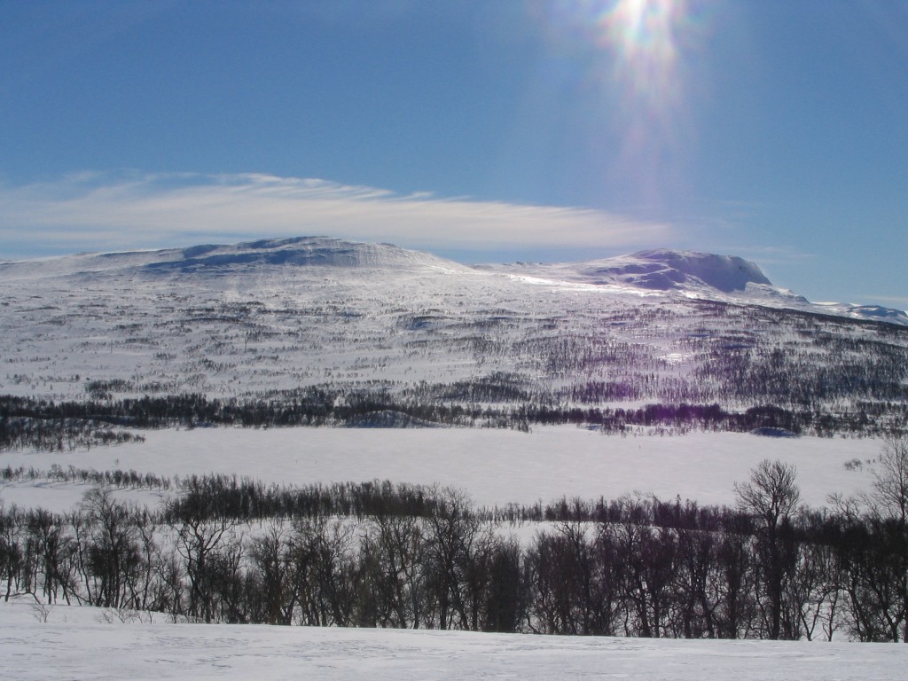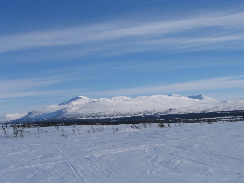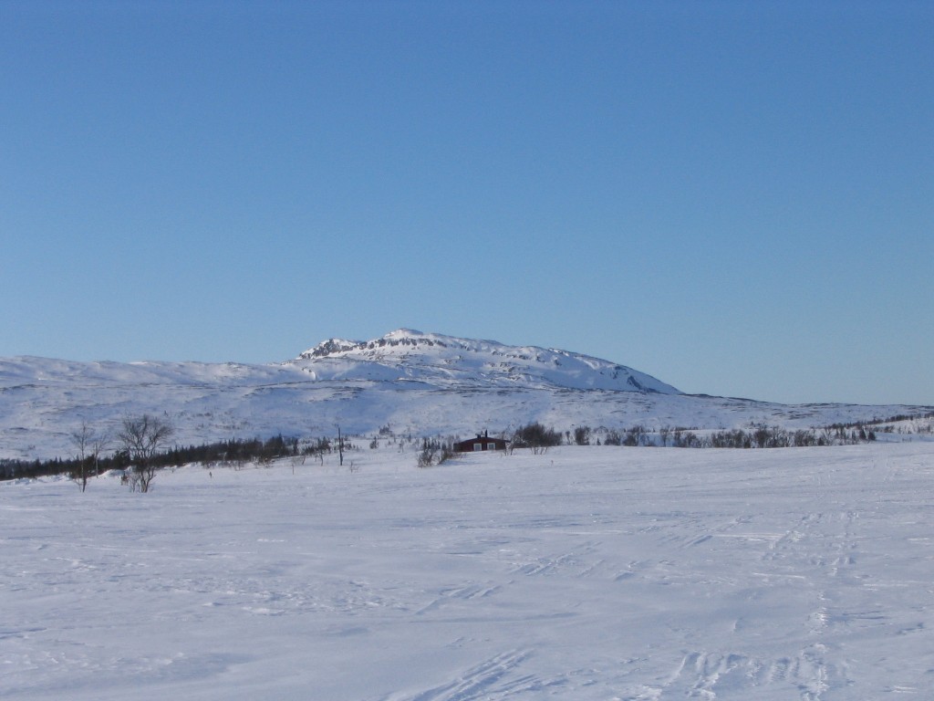 With the hard wind at my back, I began gliding down the mountainside, which after the first moderate slope turned into an arduous affair. The extensive abrasion had produced a base layer which was as near pure ice as snow can come and still be called snow, with conglomerations of hard-packed drift on top in most irregular patterns. What with both the relentless wind pushing me along and the substantial incline, I had to pick my way carefully, and I came close to falling several times. At the Gräslidfjället shelter some kilometers down, there was a snowmobile the driver of which apparently was a maintenance worker checking up on the building. From there on, the condition of the trail was better, so that I could hold a more direct course downwards.