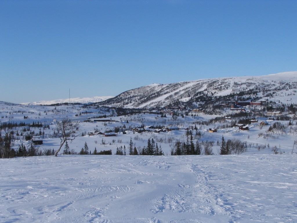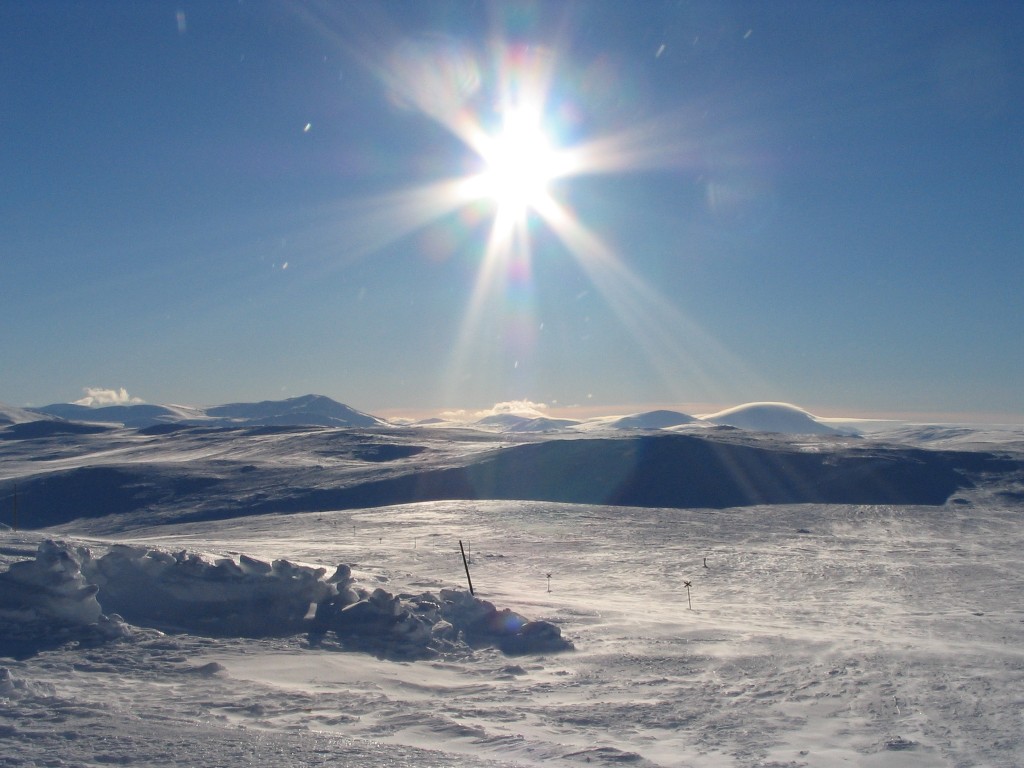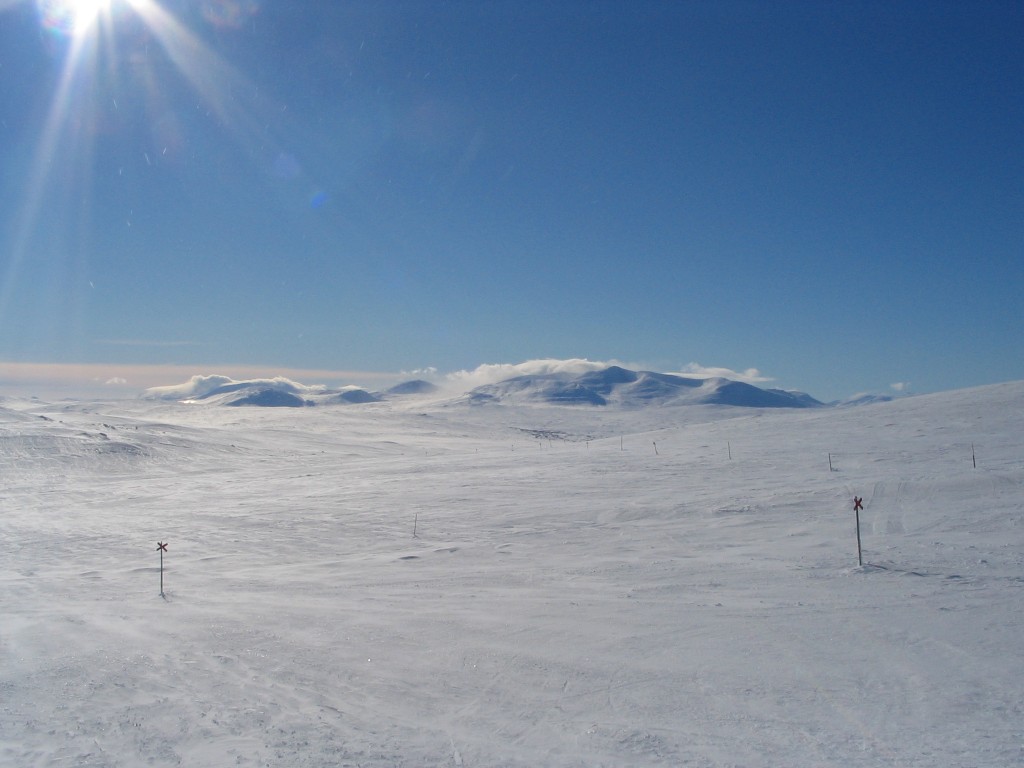 Down in Enan's vale the wind was all but nonexistent, and the clothes which were barely enough to keep me comfortable up in the tempest were now too warm instead. As a result, I proceeded slowly, exerting myself as little as possible, until I was up on Rundvalen where there was a fair wind again. I met two other skiers while up in the flat region, and then another three when the trail started descending. There were also a pair sitting in a camp beside the trail just before the trees restarted, and shortly thereafter I spotted an abandoned camp site a bit to one side and decided that it was time to stop myself.