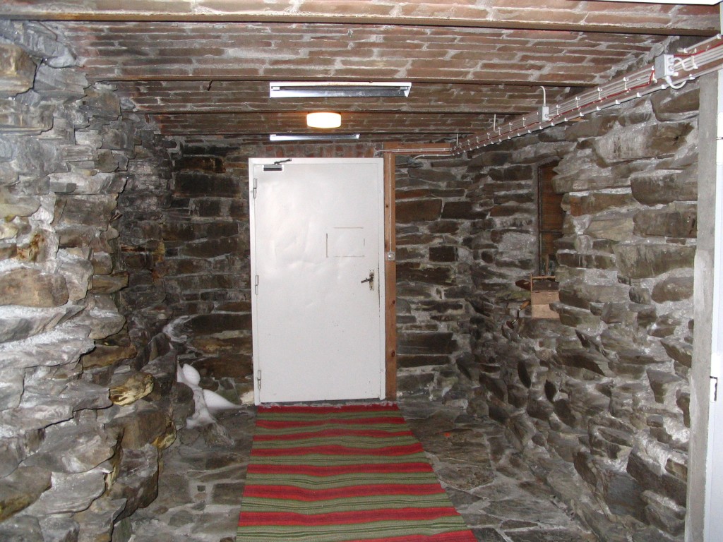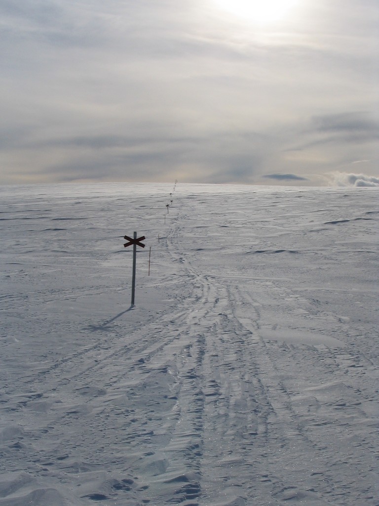 The last three kilometers up to the station were taxing; the wind was still blowing hard head-on, and visibility was very low. I stopped at every eighth marking pole or so, turned my back against the wind and panted for half a minute before continuing. When I reached the Gamla Sylen shelter less than halfway up, where the trail from Gåsen lands, I went inside to pause for real. There were three other men there, one of which was just on his way out – the first living beings I had seen since leaving Blåhammaren. I had a sandwich and some hot water, and having recovered most of my strength, I faced the storm once more; one of the men had left already, but the other lingered. After a while, I caught up with the one who had departed just before me; he was trying to change into a thicker pair of gloves, but had dropped one in the process, which the wind had carried a good bit down the slope. Luckily, I caught sight of it, and after returning it to its owner I continued on, and finally reached the station again at around 15:15.