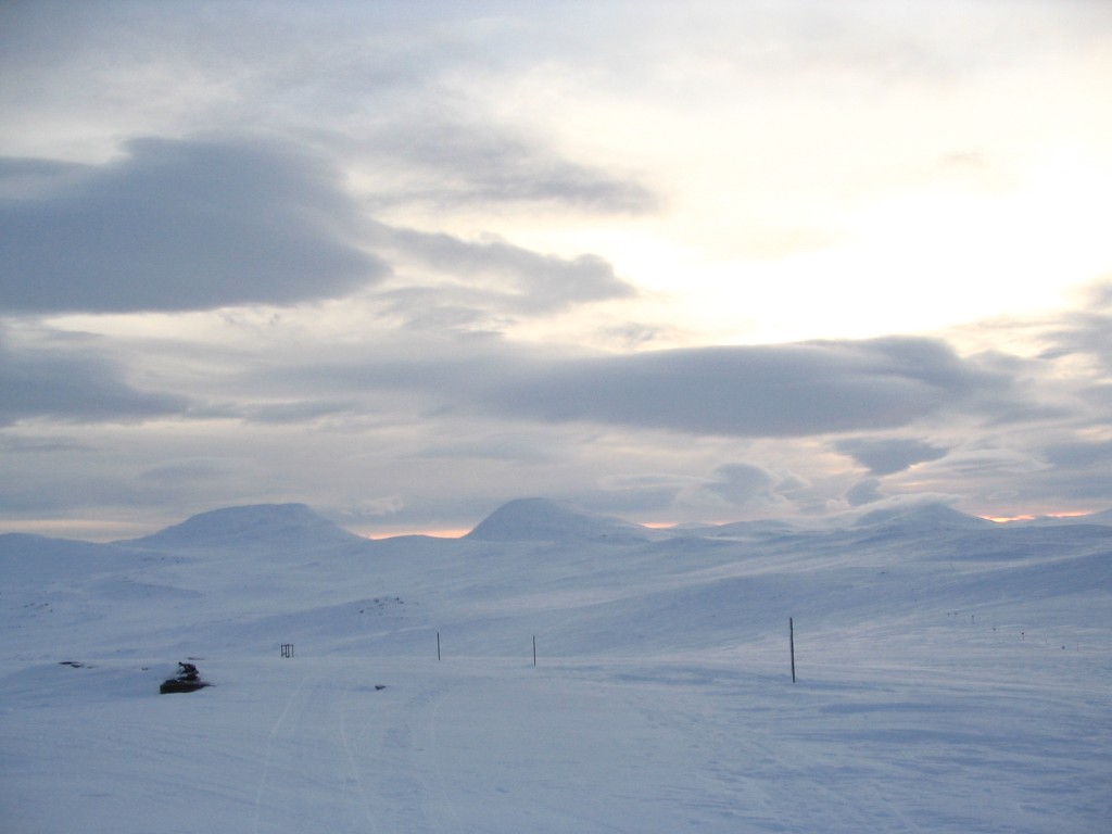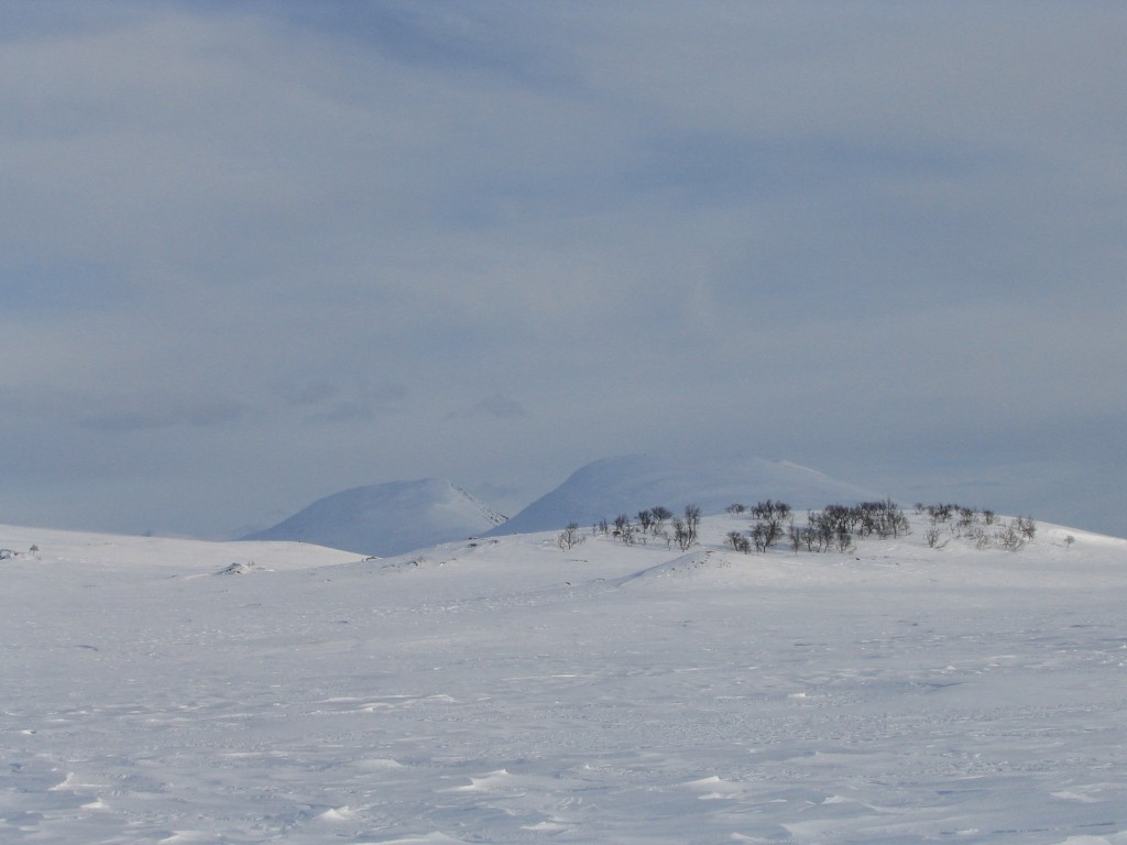 The wind was coming from the west, and so was not hindering my progress. Even though it was generally downhill the first few kilometers, the more local topography of the land together with the condition of the snow conspired to make gliding prolonged distances hard. Still, I went along with relative ease, getting nice views of the surrounding fjelds.