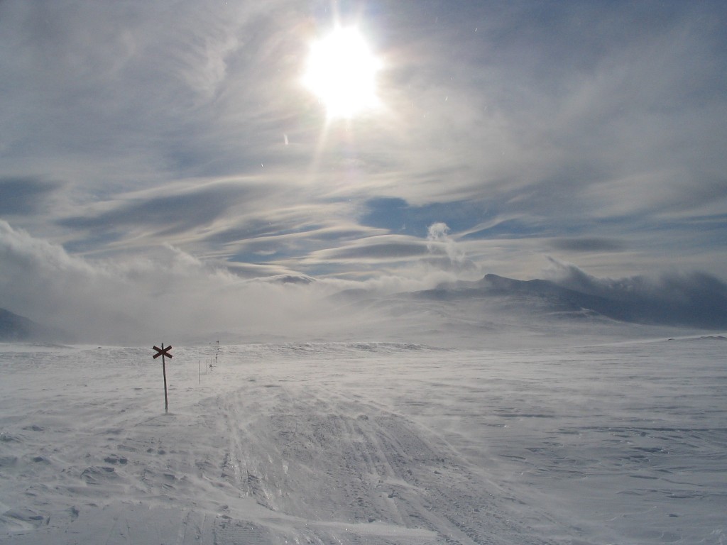 Just as I was leaving the shelter, however, the wind had restarted and had also changed direction, so that it was now blowing directly against my bearing, and low clouds were rolling in. A long uphill slope followed, and it grew more and more difficult to advance; snow was whirling up from the ground, but at least nothing fell from the sky. Up on the Enkälen plateau, I could just make out the Sylarna station through the haze, but it was growing denser all the time. With the headwind adding to the coarse snow, there was no gliding at all down into Enan's valley; I had to ski all the way.