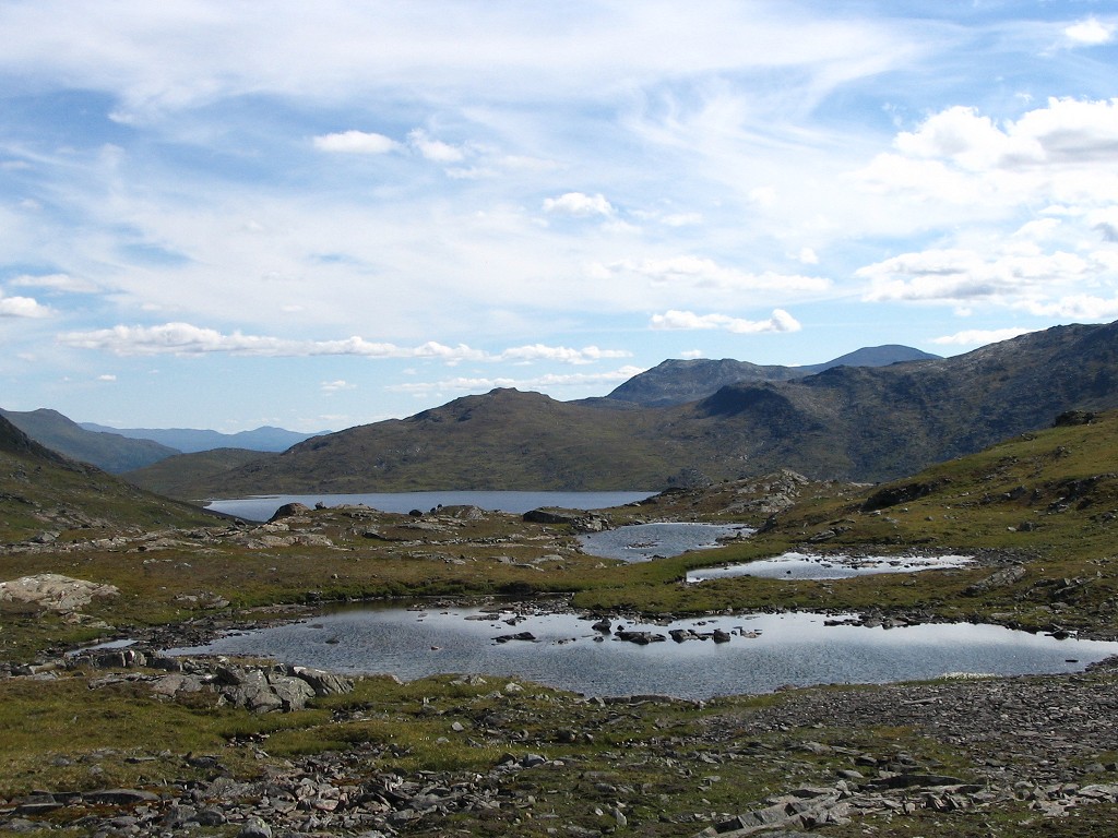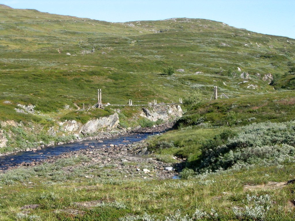 There were faint traces of a path at first, but as the incline grew steep it vanished. I cut across the slope, which was easy enough, even though there were some thickets of varying height and density – nothing that really worked as an obstacle, however. I passed another brook ravine very similar to the one from the day before, and after that I noticed a few cairns below me – they didn't form a distinguishable continuing line, though, and there were no signs of a path either, so I thought nothing more of it. I reached Buokkekjĺgĺsj at the place where it has formed a small pool, and then followed it upstream – at a distance, as required by the lay of the land. When I reached another small pool close to the pass point shortly after 11:45, I decided it was time for lunch.