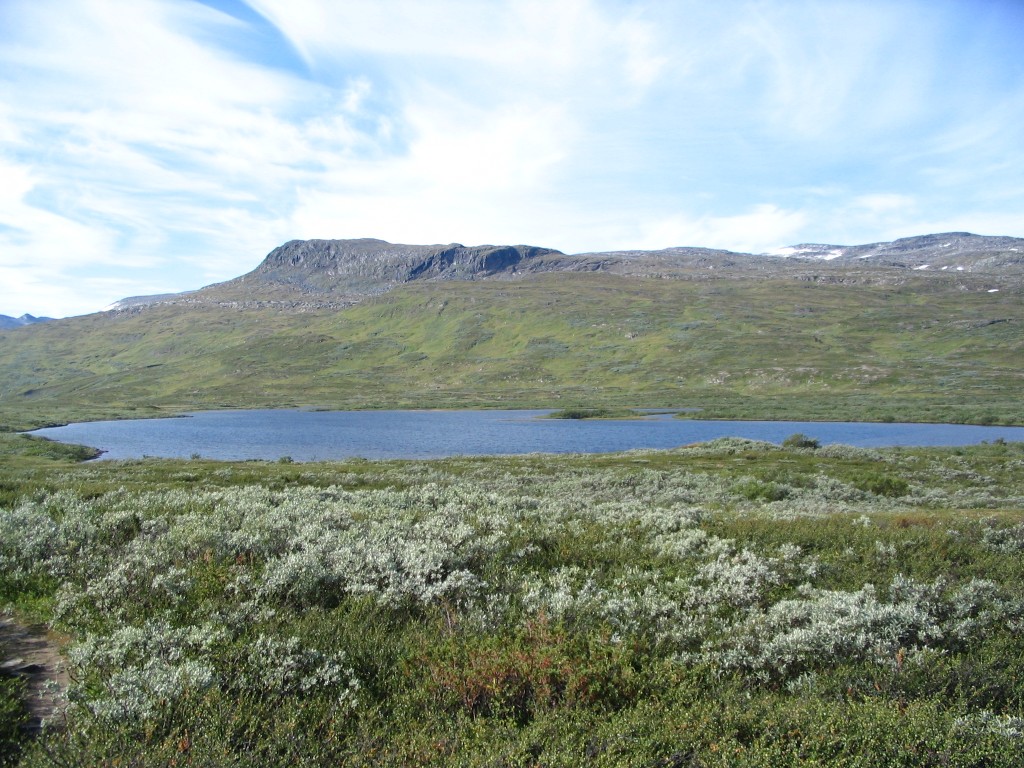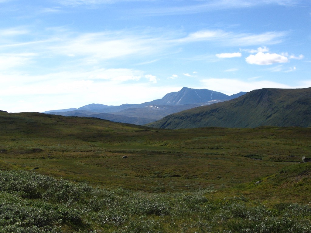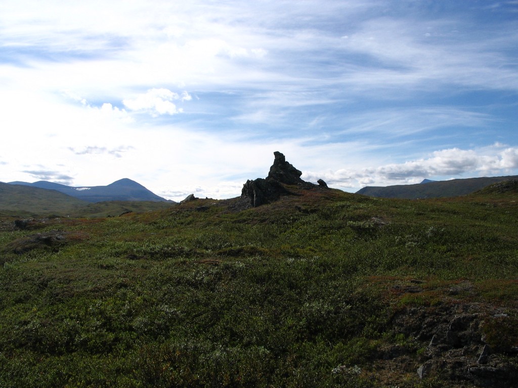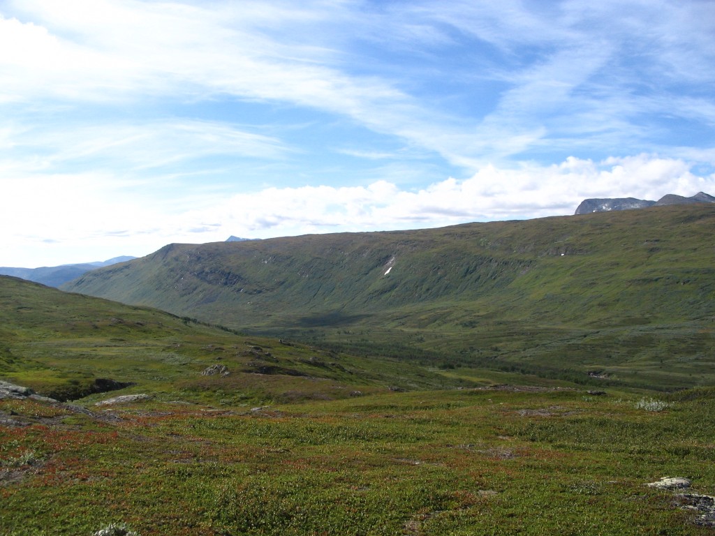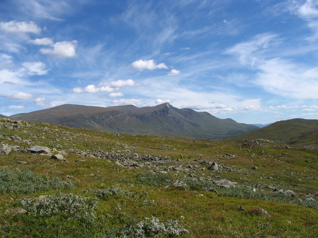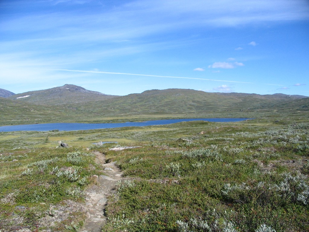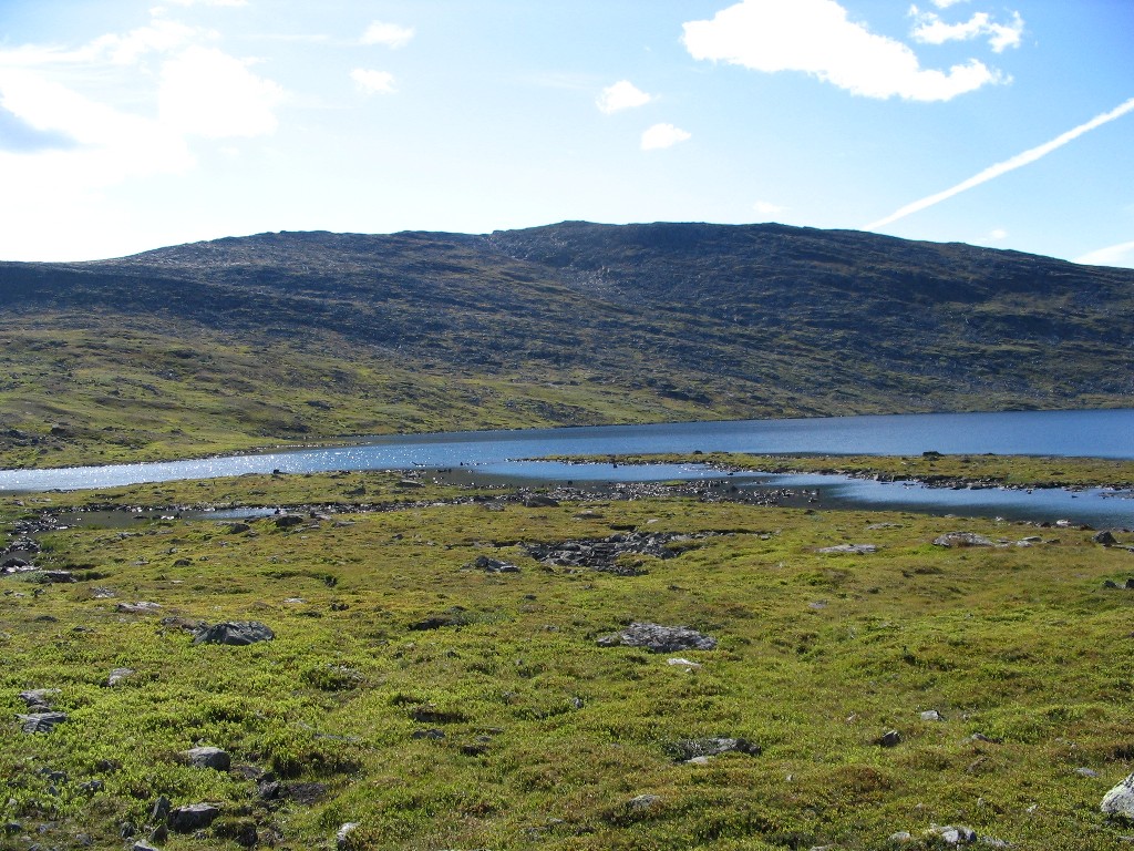 The further I descended the more bushes and low vegetation appeared on the ground, and the final bit to the buildings I followed an old and partially overgrown path through the thickets. There were people present in some of the cottages, but none seemed in the process of leaving. I stopped to dispose of the garbage I had produced since Tuottar and paid a visit to the privy, and then I continued along the southbound trail, where progress was very easy. Some more clouds had entered the sky, and the sun was slightly dampened by the thinner of them, which in conjunction with a moderate wind made walking comfortable. Suddenly I became aware of a large bird circling above me, and I identified it as a falcon; it perched on a rock not too far away, but unfortunately it was too far away to get a good shot of it, and it lifted again before I could get any closer.
