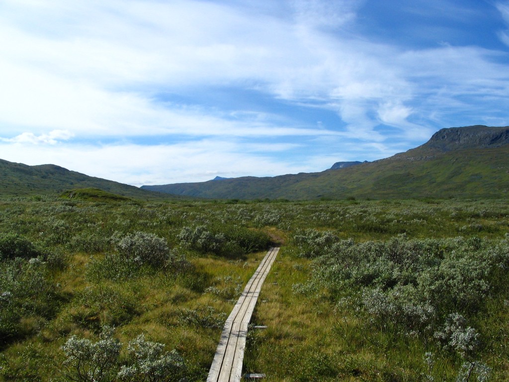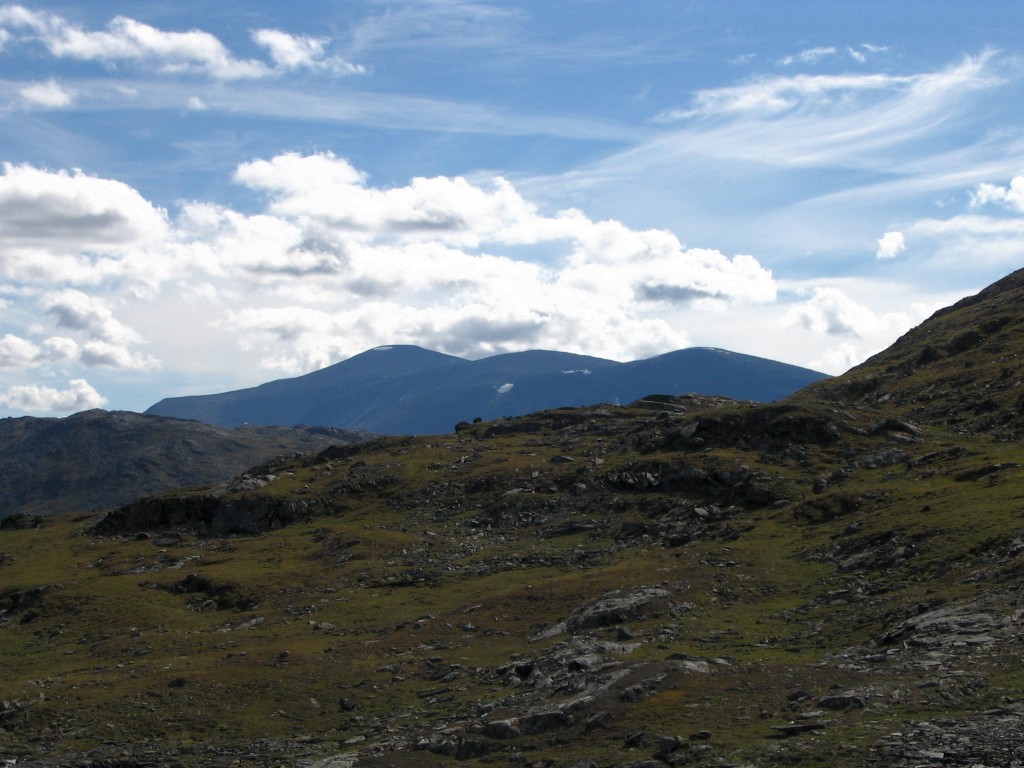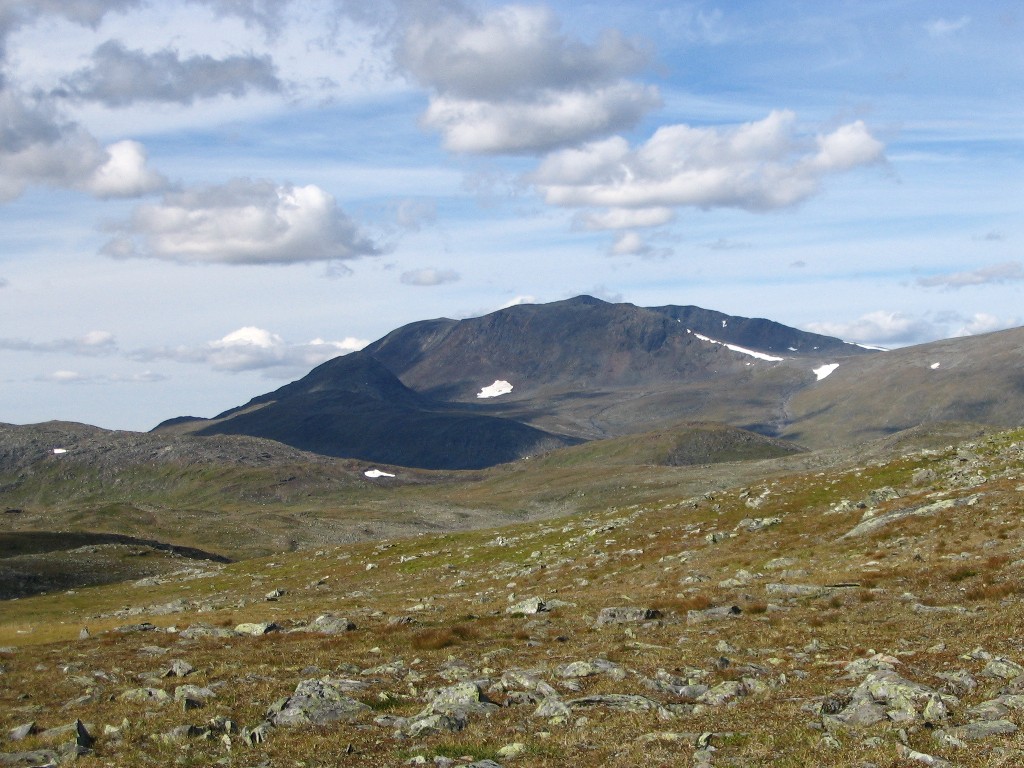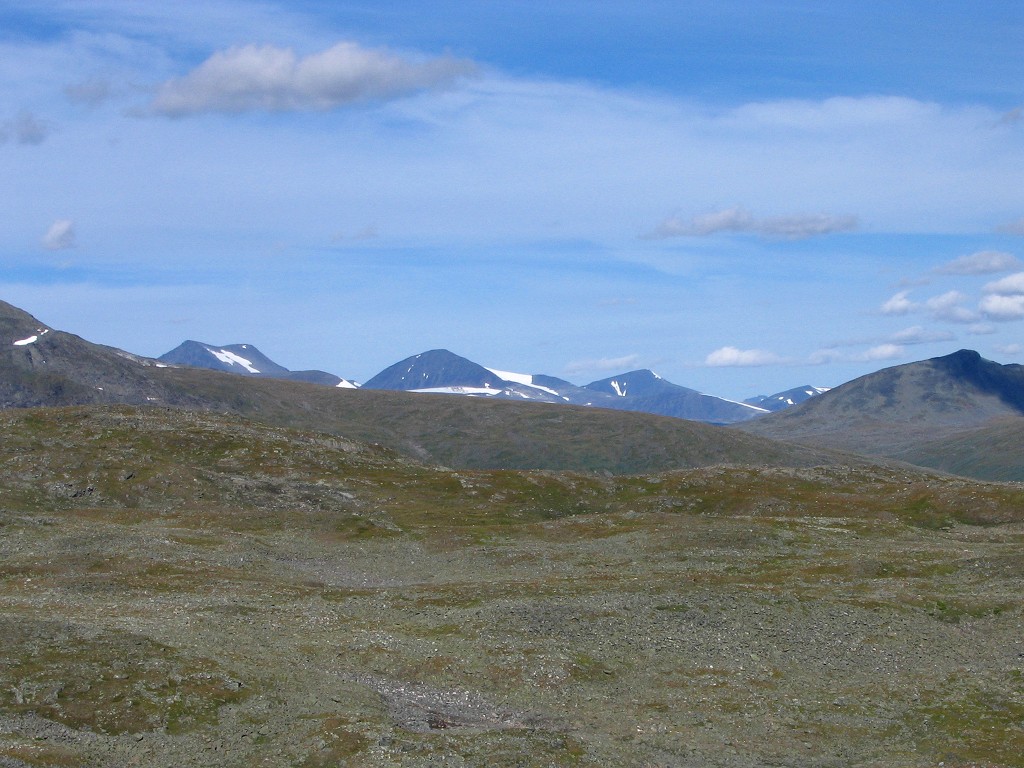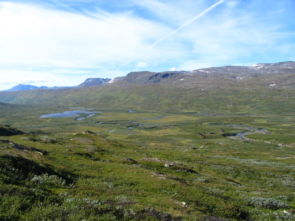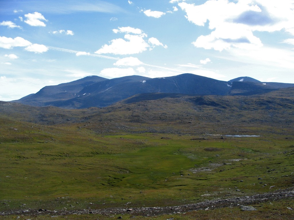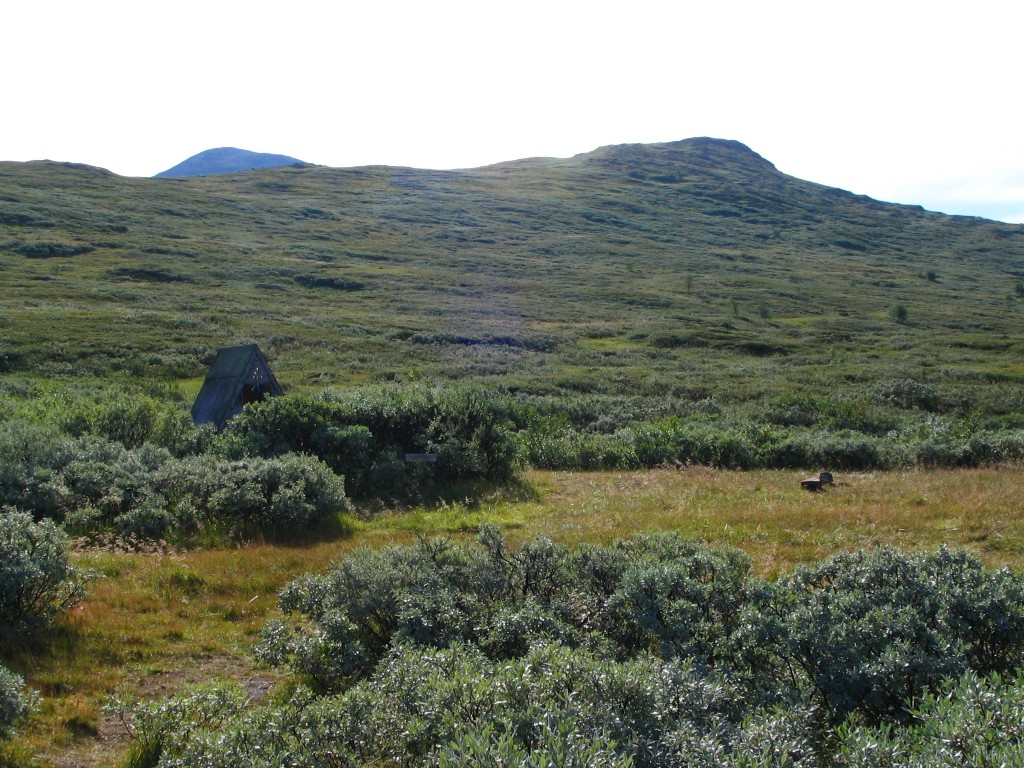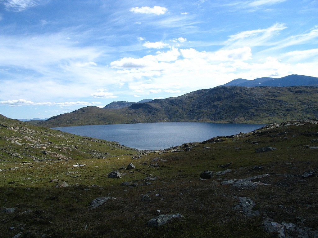 The further I descended the more bushes and low vegetation appeared on the ground, and the final bit to the buildings I followed an old and partially overgrown path through the thickets. There were people present in some of the cottages, but none seemed in the process of leaving. I stopped to dispose of the garbage I had produced since Tuottar and paid a visit to the privy, and then I continued along the southbound trail, where progress was very easy. Some more clouds had entered the sky, and the sun was slightly dampened by the thinner of them, which in conjunction with a moderate wind made walking comfortable. Suddenly I became aware of a large bird circling above me, and I identified it as a falcon; it perched on a rock not too far away, but unfortunately it was too far away to get a good shot of it, and it lifted again before I could get any closer.