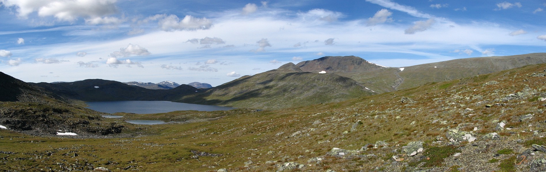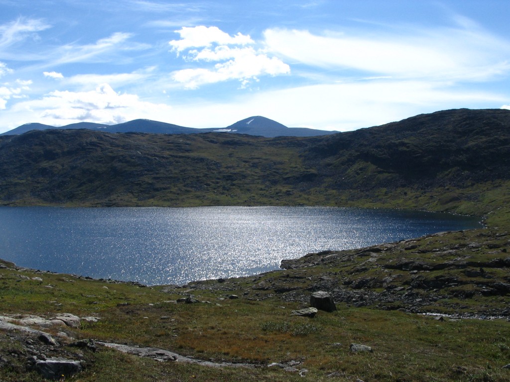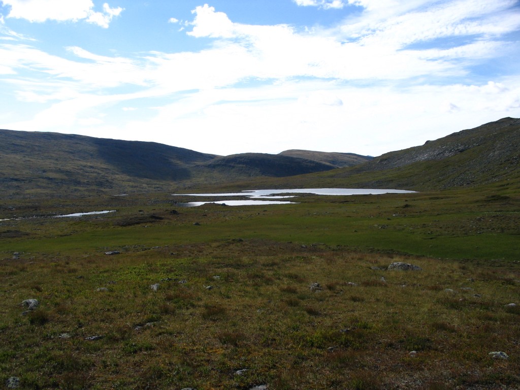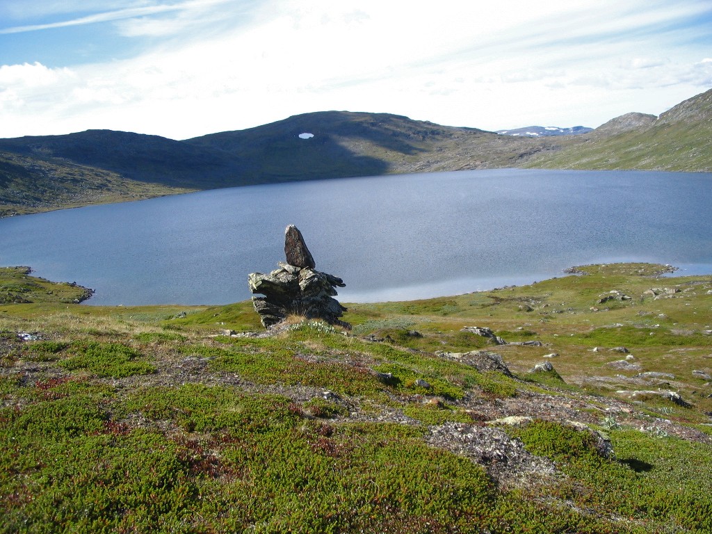 Up by the small tarn that lies in the pass it was rather windy, and the path suddenly sprang back into existence with a vengeance; seldom have I seen such an unmistakable directional guide in the ground. But, just as before, it withered out into oblivion after only a short distance. Just then I saw a large reindeer not far ahead, which was the first one I had seen all day; that felt somewhat unfamiliar considering the experience of the past few days.