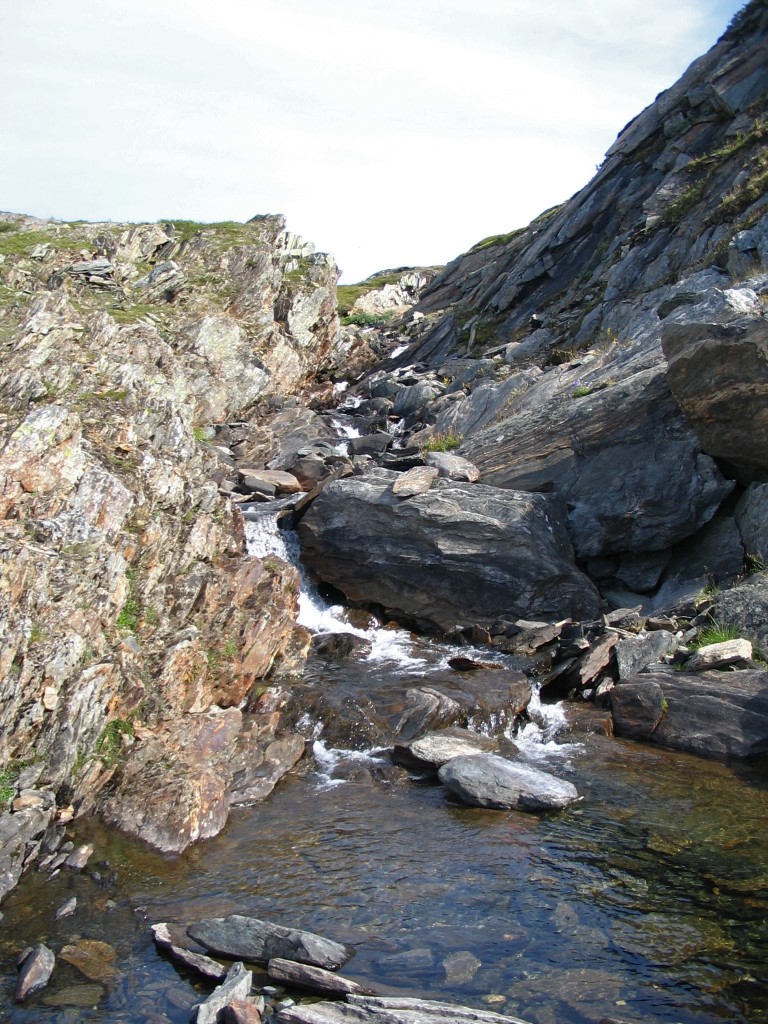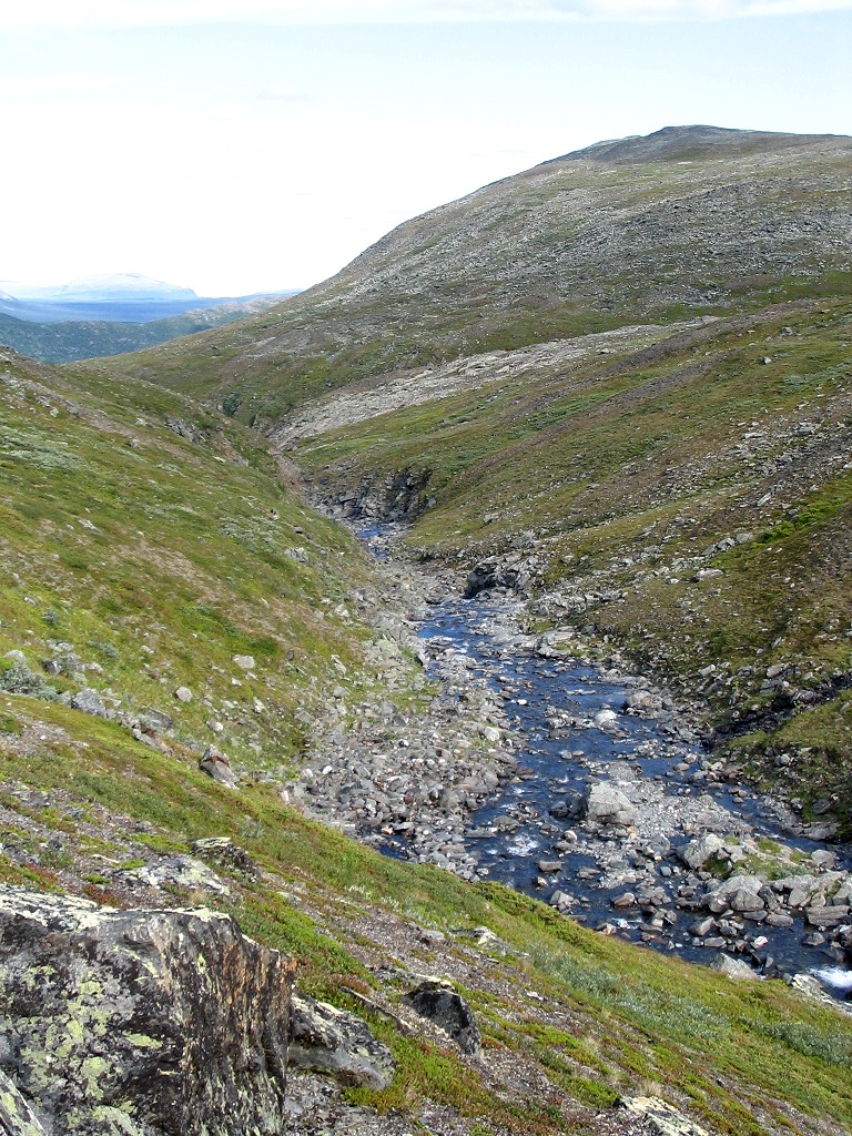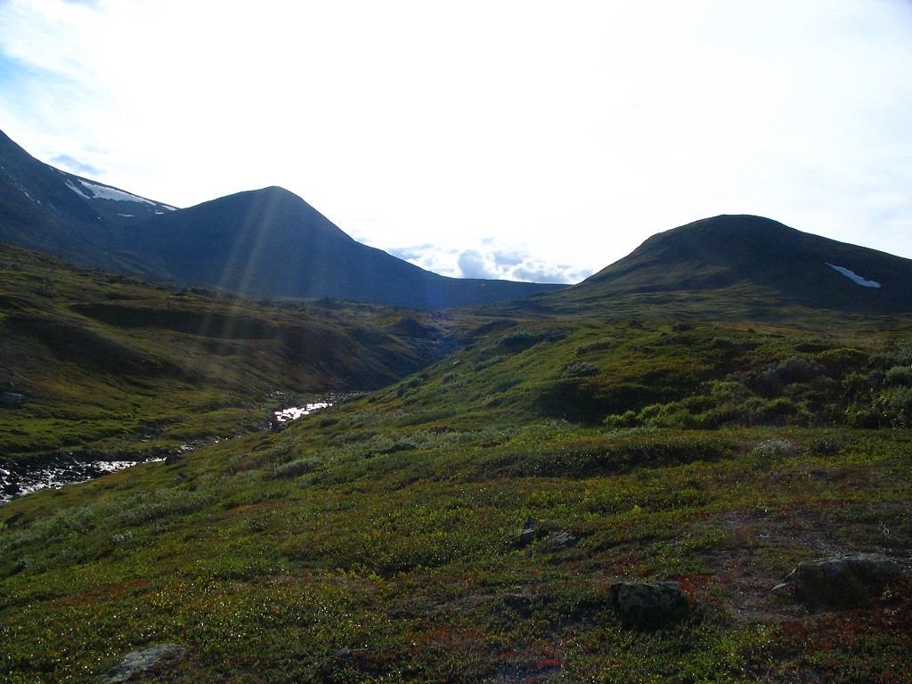 I followed the contour of the undulated landscape of Slihtavágge so as to minimize vertical displacement as I continued towards the next pass west of Ruonas. I came up from the west and then passed east of the two pools in the saddle itself, and continued down into Ruonasvágge in a southeastern direction. That slope was fairly steep at places, and there was yet another faint-path-which-ended, after which I turned down towards the stream at the bottom of the valley. The sides of this stream were also rather steep (and uneven), so suitable camp sites were somewhat hard to find, but I was fortunate enough to walk straight onto a patch of level heath up in the slope, where the pattern of stones strewn about clearly indicated that someone had camped there (long) before. Since this place was also adjacent to a small but steady tributary trickle, I ended the stage of the day there at around 15:15.