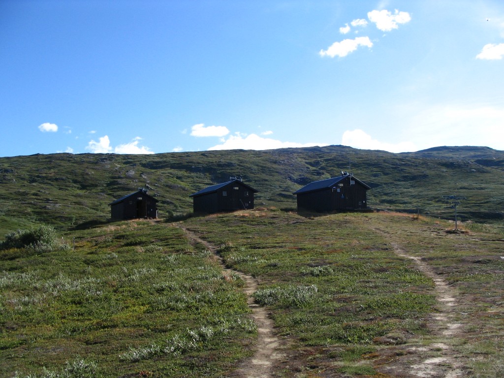 The early morning was a bit cold, and I put on an extra t-shirt for the final hour or so. I awoke again around 7, and got up a while later; the sun was shining from a blue sky and it was perfectly calm, but there were dense cloud sheets in the southwest. I went outside to have breakfast in the beginning warmth – and beginning wind – and I observed the morning passes of the Stáloluokta chopper again as I struck the tent. Before the time was fully 09:15 I had packed up everything and set off down the slope, heading for the cottages below.