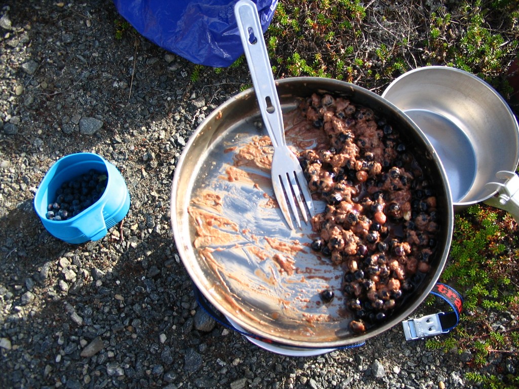I prepared dinner as well as an improvised dessert made up of chocolate and blueberries, which turned out rather well. Afterwards the cloud in front of the sun attenuated until it finally drifted off entirely, and since there was next to no wind it was very hot for a while. I replenished my berry supply and then read in my book outside in the shadow of the tent. Later another bank of clouds approached from the west, enveloping the sun again, and I went inside. Dark clouds kept pouring in while I struggled with a crossword or two; soon there was a substantial cover overhead, and a few raindrops began to fall as the wind increased.