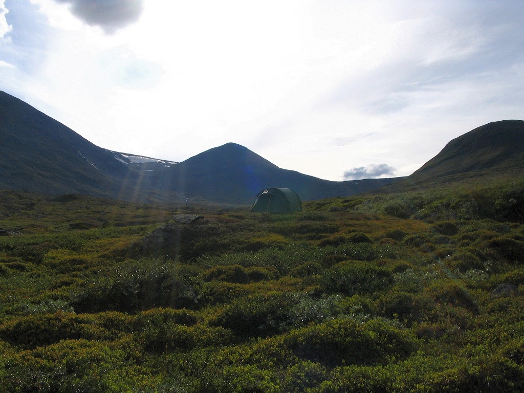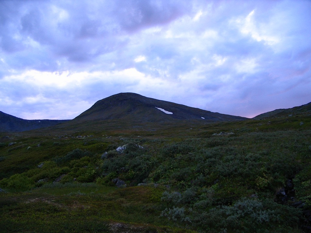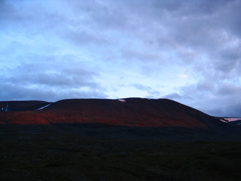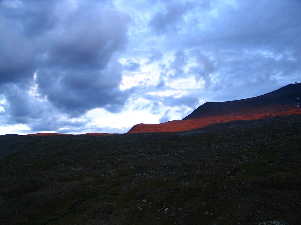 This turned into a continuous rain which kept at it for a while, but then it seemed to diminish. That was, however, only a ruse, for without warning or provocation it returned many times as forceful as before. I read inside, listening to the rattle of the rain on the canvas, which again appeared to be receding after some time – and then it stopped for real. The cloud system responsible was heading towards the east and the parts remaining above were decidedly thinner; things looked better to the south, but worse to the north. Since it was evening I had my snack, and it became apparent that there would be no further rain; the clouds broke apart, letting the setting sun paint the towering mountainsides of Darregájsse a crimson red. It was still warm and only a light wind was blowing when I lay down to read at 21:45.