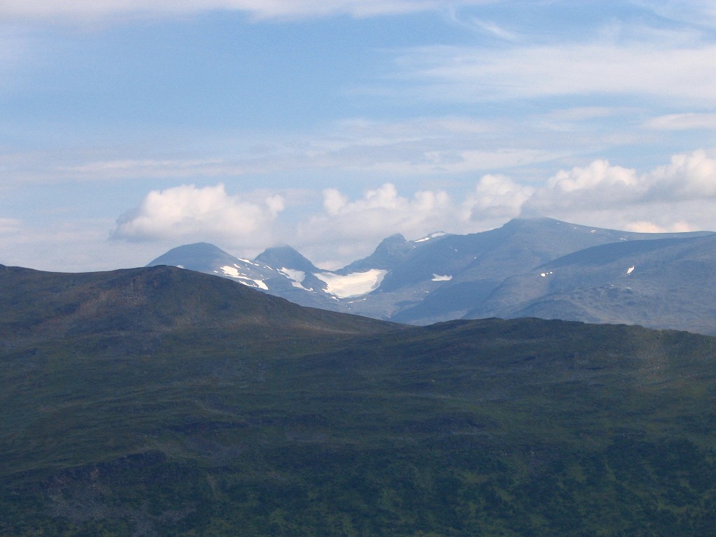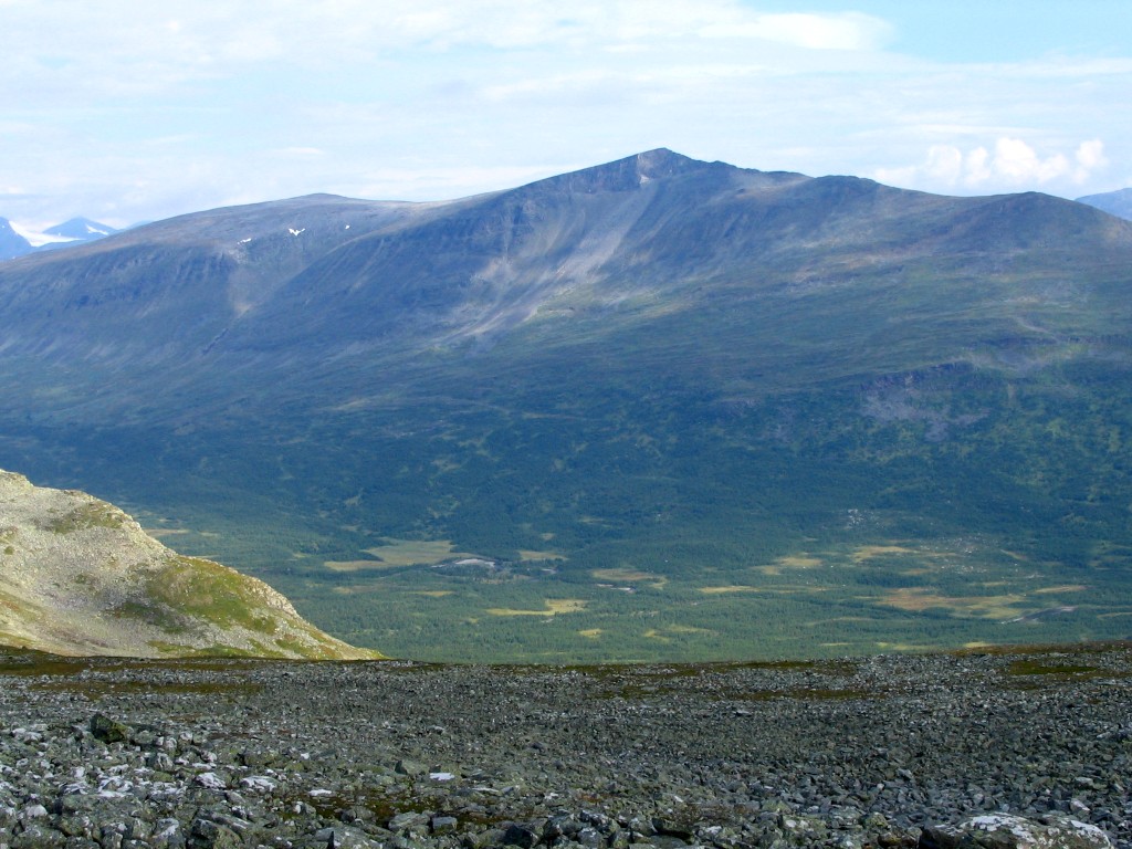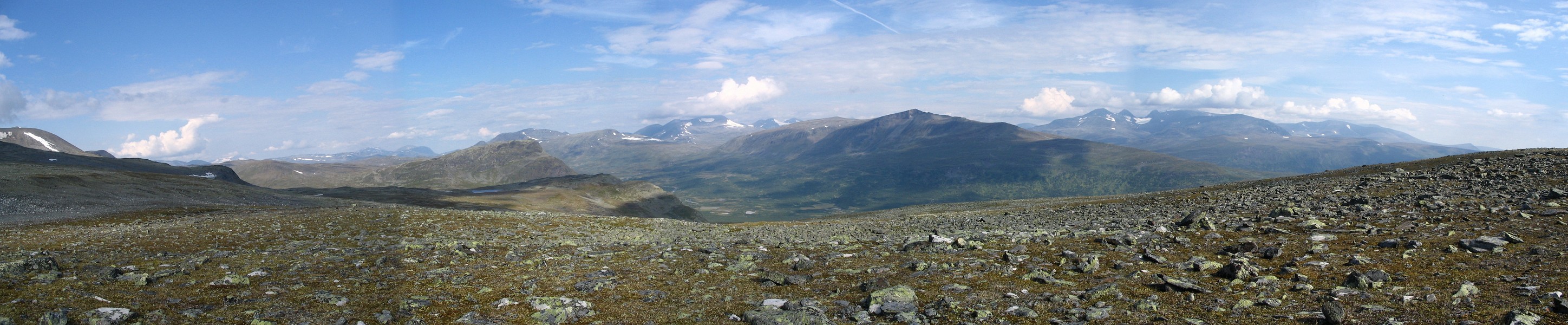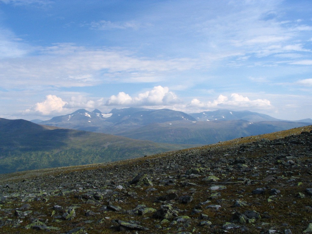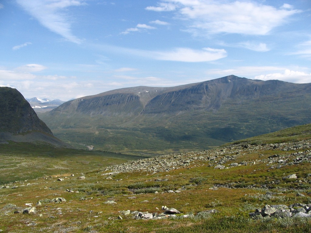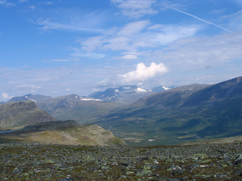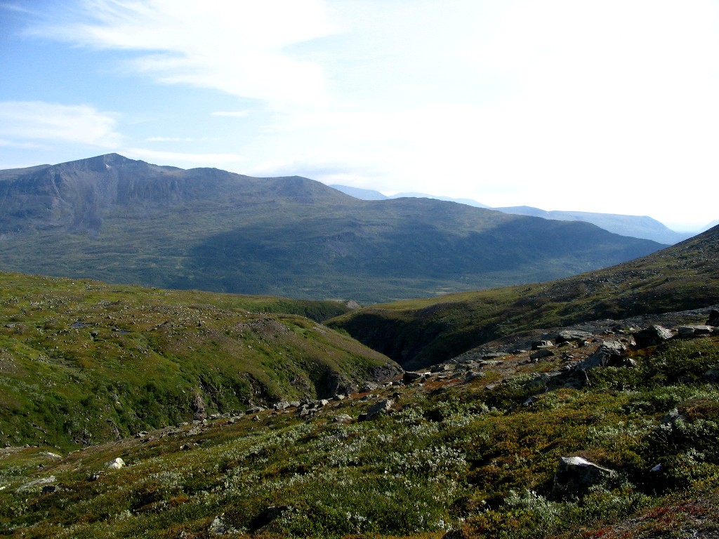Then a most welcome event occured: a cloud passed in front of the sun. It had been very warm for quite some time, and the resulting temperature drop felt awfully good. The ground grew a bit rockier as I proceeded upwards, and then I encountered the trio. It consisted of three young men of southern origin (Dalarna, judging from their accent), with whom I spoke for a while. They were a bit worried about the availability of water along their future route, seeing as how they had had trouble finding it after exiting the forest close to Kvikkjokk, and I could assuage their fears in that regard. We then went our different ways, and mine was intersected by a rock field followed by more easy ground. Sights all around remained marvelous, but I was now nearing the stony entrance to Vállevágge, where Vallespiken would effectively cut off the east.