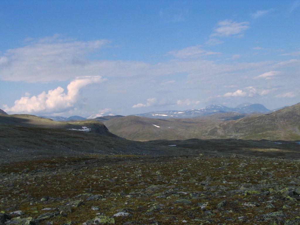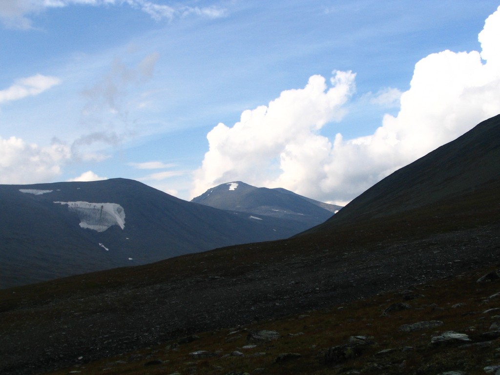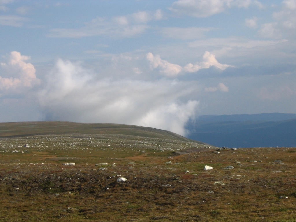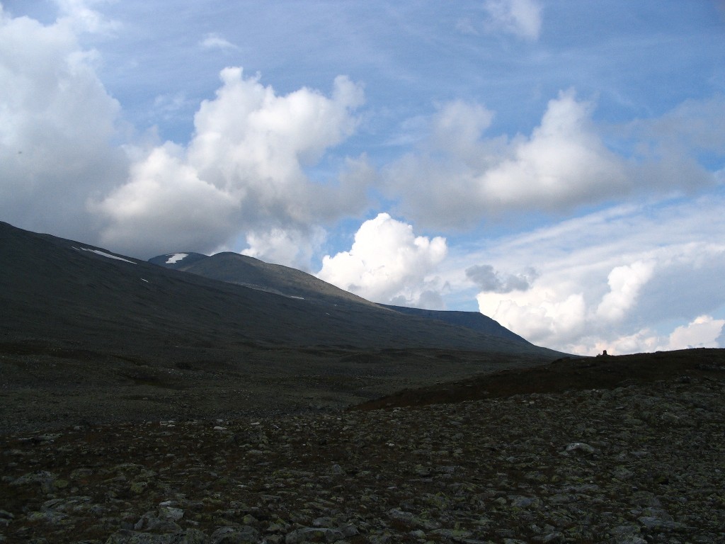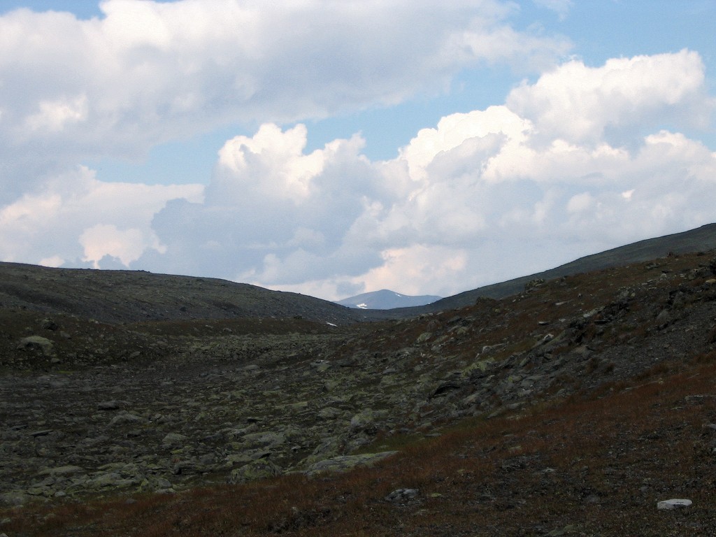 It turned out that the person I had seen earlier was also having a break behind a small hill a short distance downstream – and he also turned out to be two guys. It was sunny and warm, and some fairly large clouds were drifting by. I had some reindeer meat as a "dessert", and then I saw another wanderer coming up the valley. He stopped by the others and spoke with them a bit, and then he passed me by. The sun had been clouded by then, and I prepared to resume my journey.