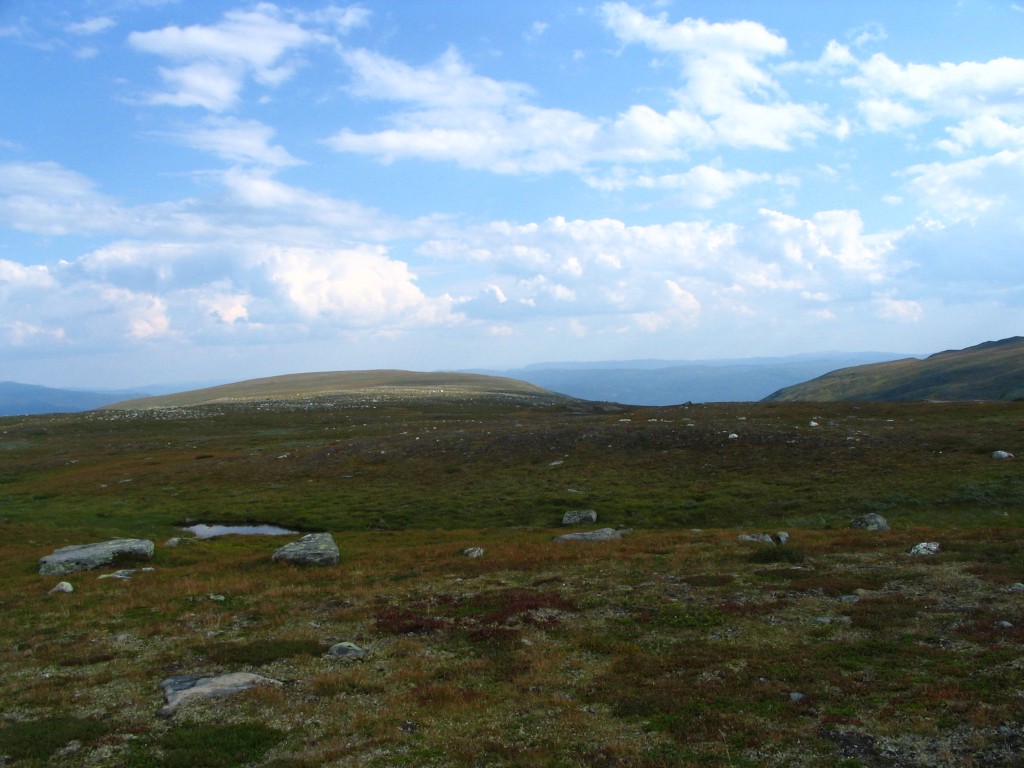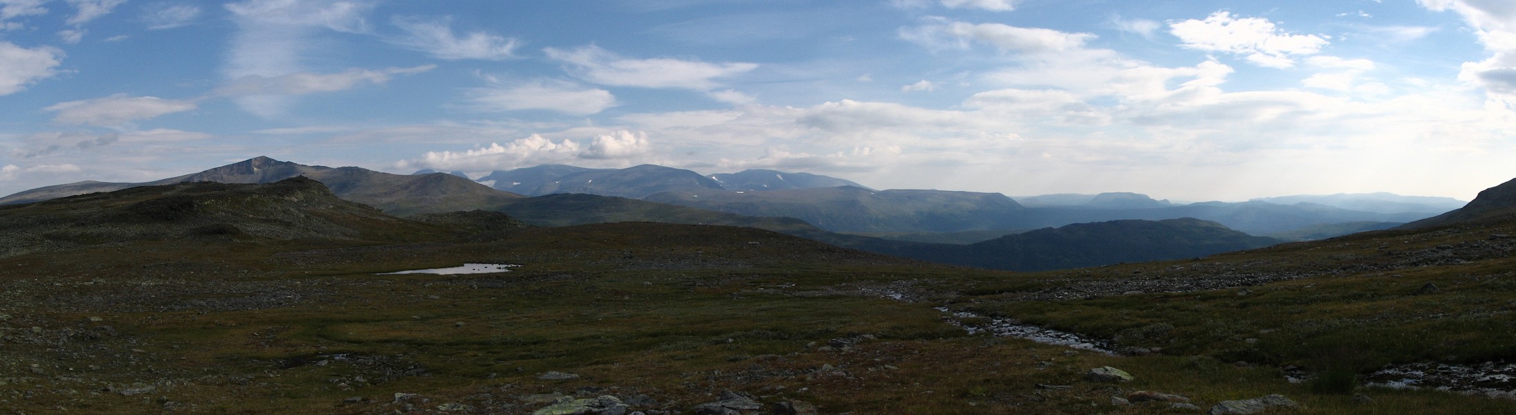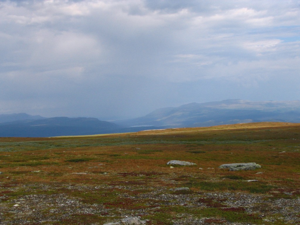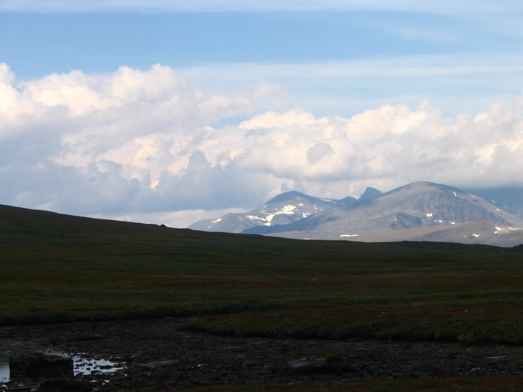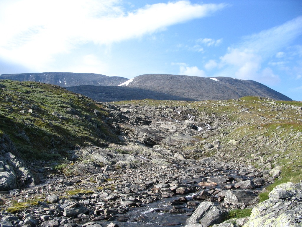 It turned out that the person I had seen earlier was also having a break behind a small hill a short distance downstream – and he also turned out to be two guys. It was sunny and warm, and some fairly large clouds were drifting by. I had some reindeer meat as a "dessert", and then I saw another wanderer coming up the valley. He stopped by the others and spoke with them a bit, and then he passed me by. The sun had been clouded by then, and I prepared to resume my journey.