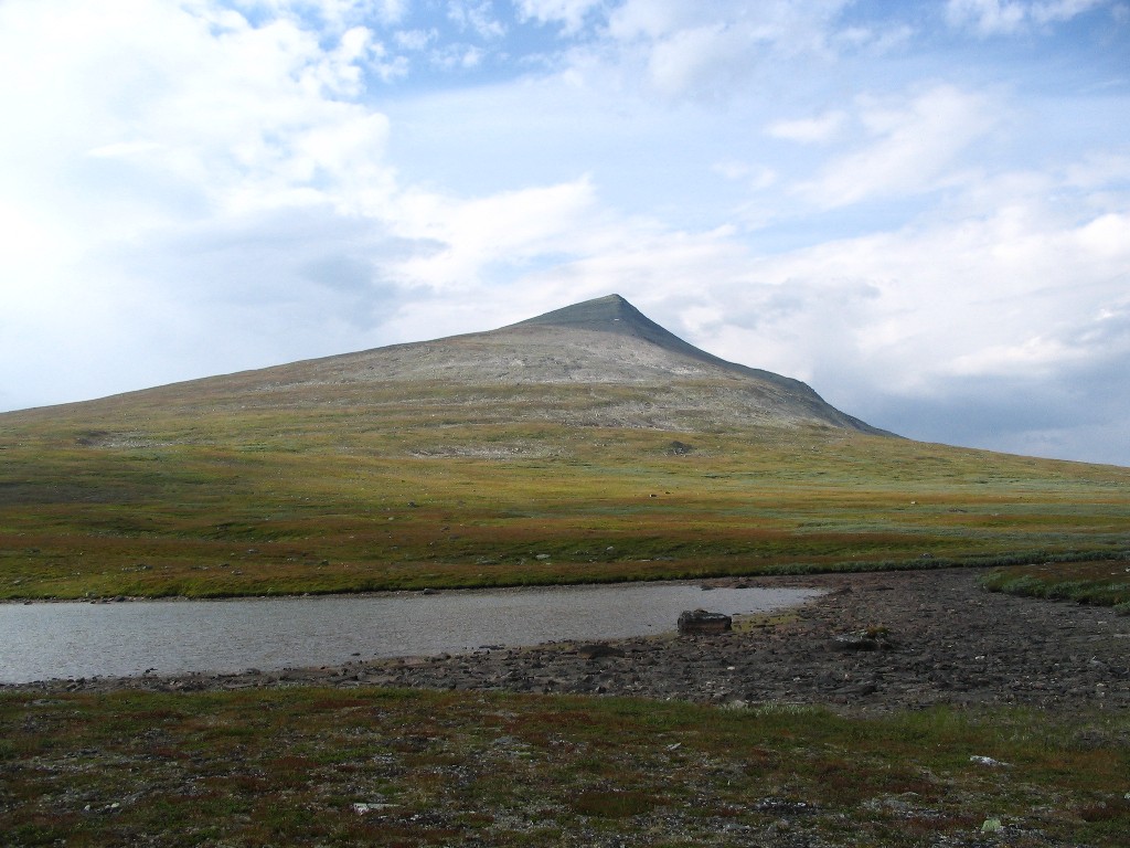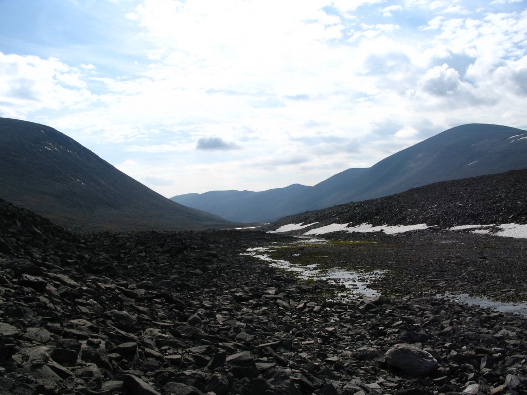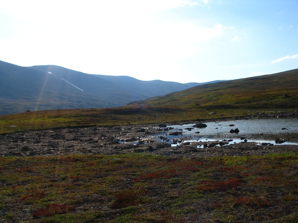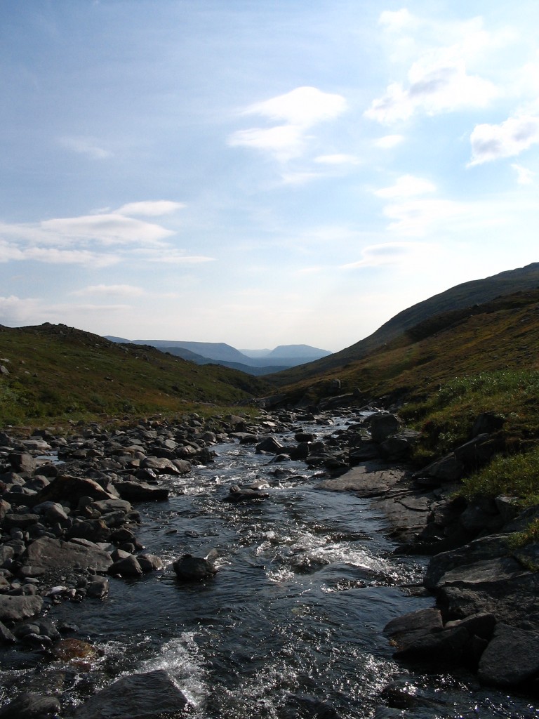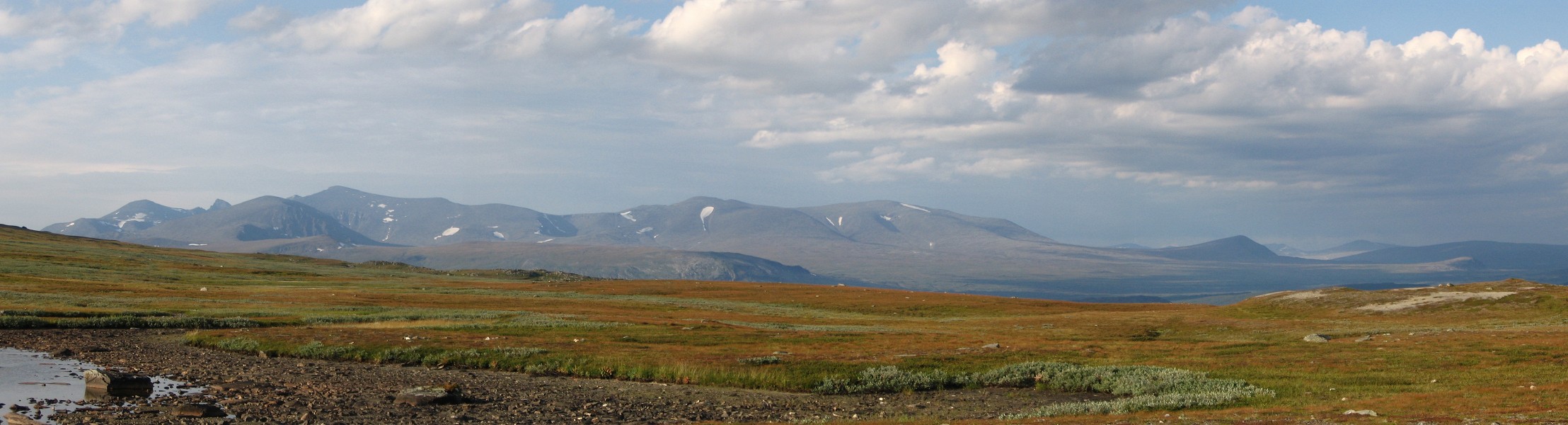 It turned out that the person I had seen earlier was also having a break behind a small hill a short distance downstream – and he also turned out to be two guys. It was sunny and warm, and some fairly large clouds were drifting by. I had some reindeer meat as a "dessert", and then I saw another wanderer coming up the valley. He stopped by the others and spoke with them a bit, and then he passed me by. The sun had been clouded by then, and I prepared to resume my journey.