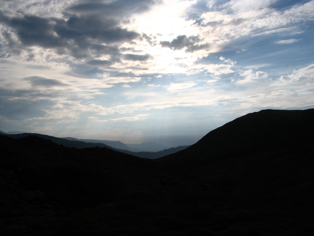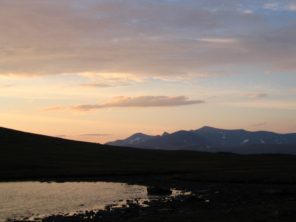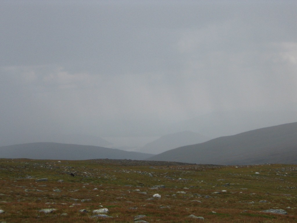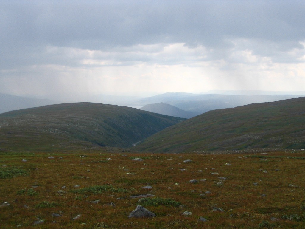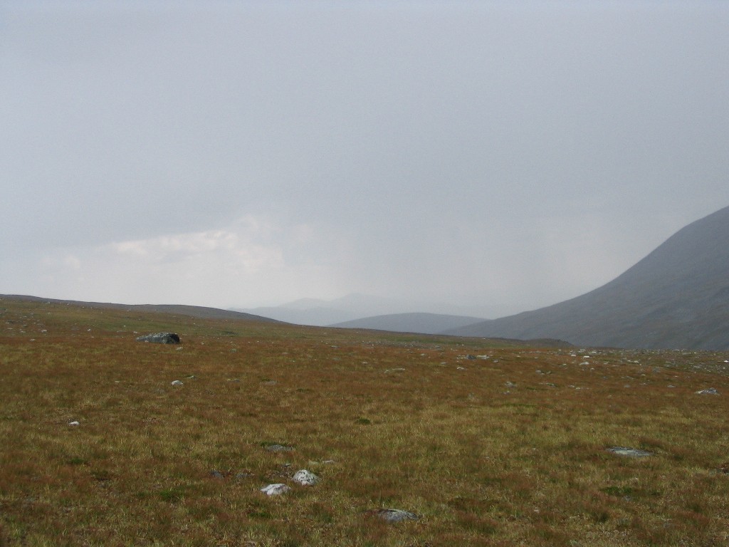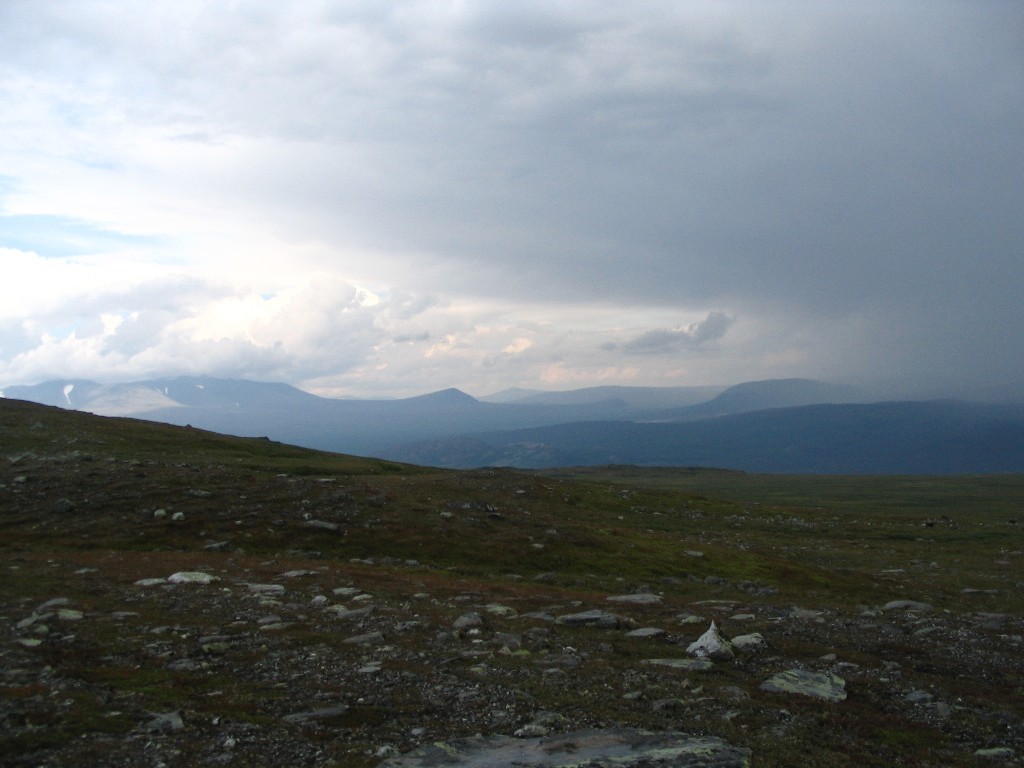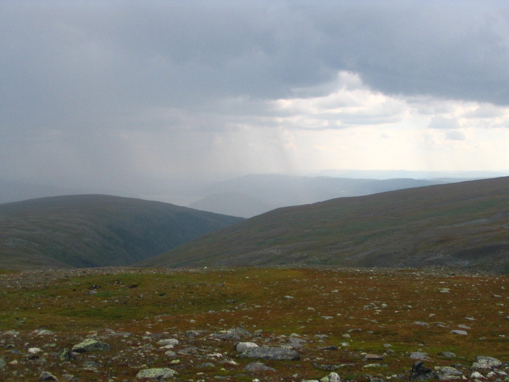 Very suddenly it started to rain, and a very strong wind came into being. Fortunately it had now come full circle, so it hit the tent from the right angle, but it still felt as though it might well fly away any second. It didn't, of course, and during a short time of lesser wind strength I made a quick run outside to check on the guylines, finding them all in order – there's Swedish quality for you... It was nice and clear to the southeast, but a very nasty cloud was pouring out of Vállevágge; my position just at the opening of the valley was evidently quite exposed. The roar and pour kept at it for some time, with the same degree of onslaught, and I just waited it out inside, perfectly snug.
