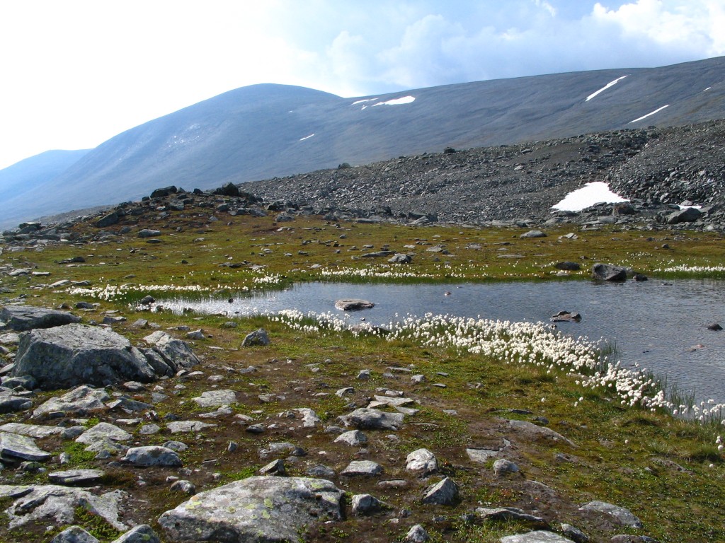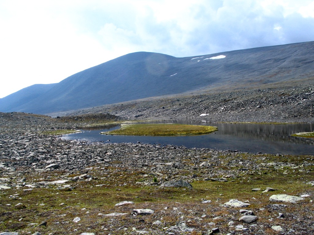 I climbed the eastern slope a bit as I entered the valley, since the rocks were easier there, and maintained that elevation until I had to go down to the newly formed Vállebäcken. I proceeded both in and right beside this stream, as it was rather stony all around at first, but then ground conditions improved and I could walk more freely. I saw another person a bit ahead, but a low rise soon hid him/her again. A rock field followed, and then yet another of those unreliable footpaths, before I reached a small pool with an even smaller islet in it – both of which are marked on the map – where I sat down on a large rock to eat after 11:30.