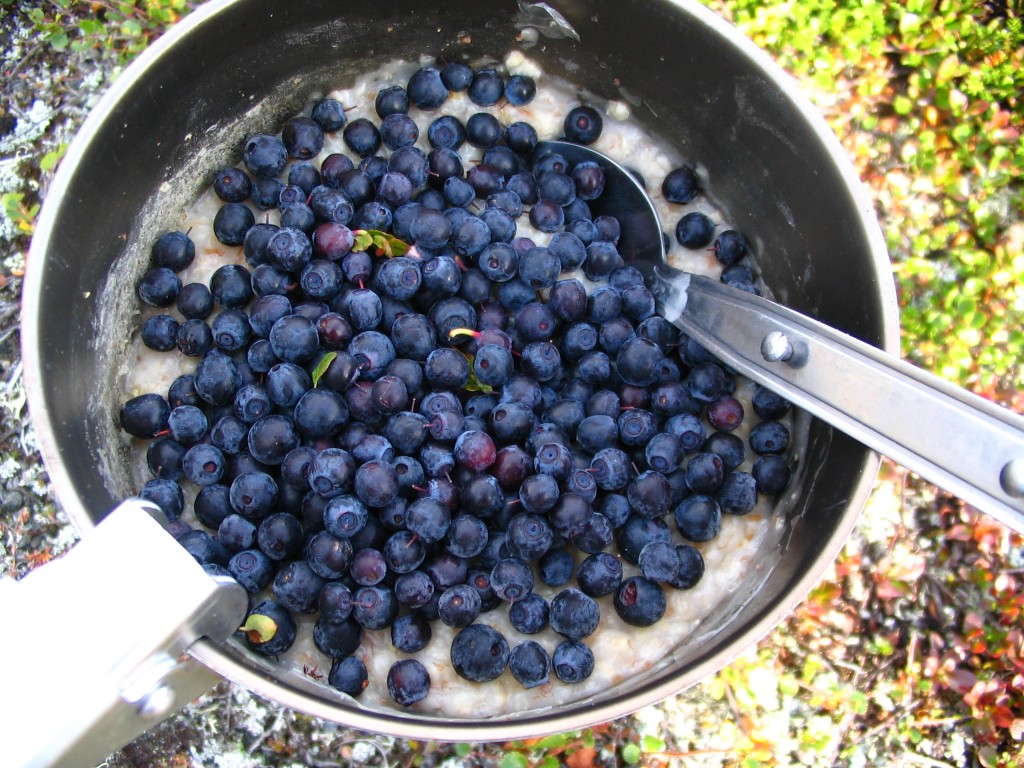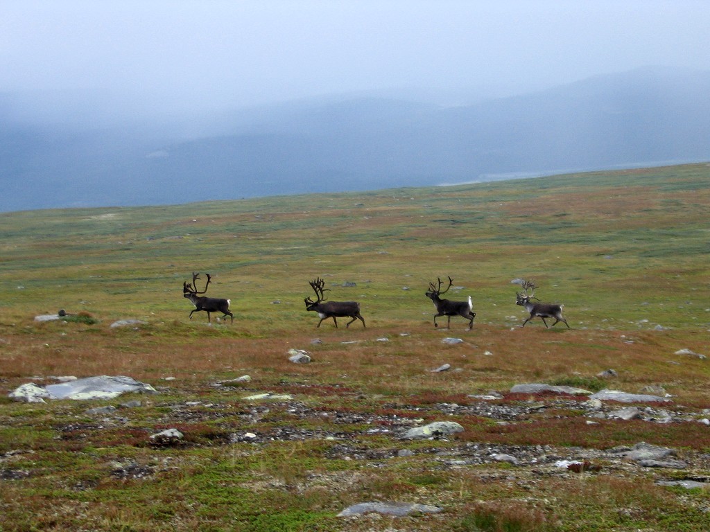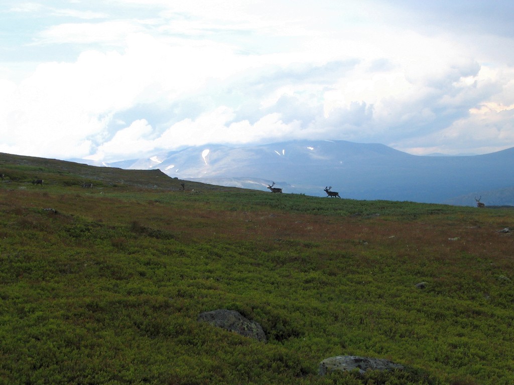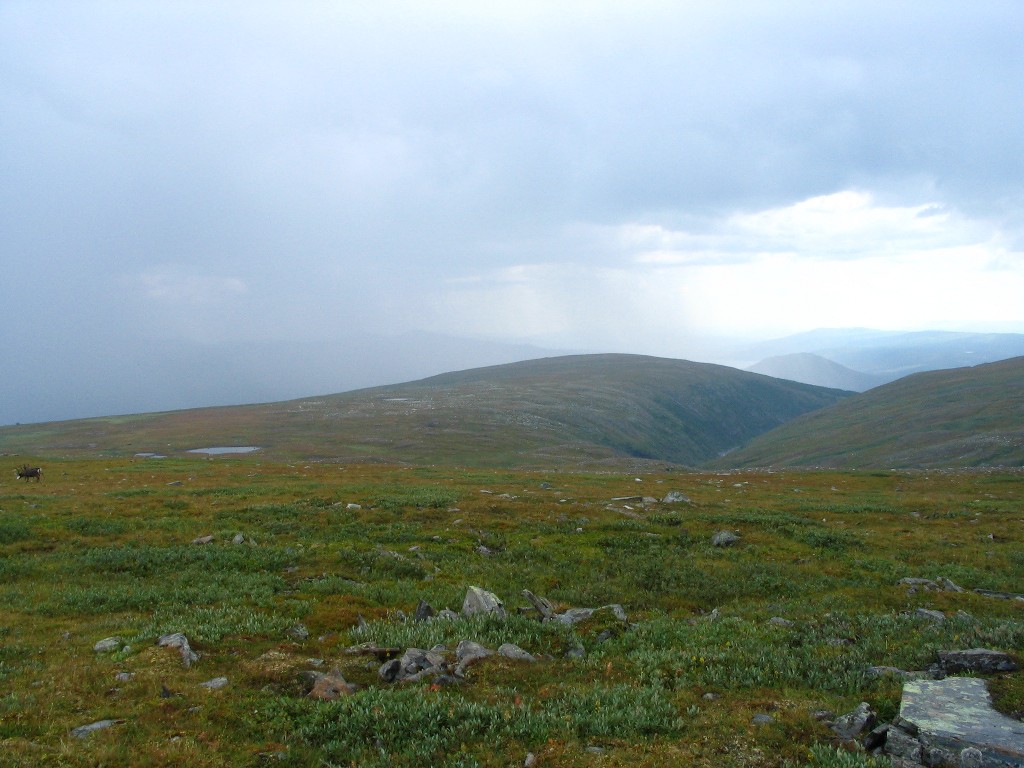I was partially clear and calm when I got up at 07:30, and there was a decidedly fresh fragrance in the air. At first glance it appeared as though there was bad weather in the east, but the type and distribution of clouds were not consistent with that analysis; what I was seeing was in fact a sunlit distance haze. I had breakfast with blueberries in the outside freshness, and upon inspection I found the tent to be very nearly dry again. It was warm in the sun, but when the drifting clouds temporarily obscured it the temperature fell quite noticeably. More clouds were coming in from the southwest, but it remained semi-clear above, and the eastern haze gradually lifted. I finished the last of the berries and struck the tent while the weather improved a bit further, being regarded by a lone reindeer a little bit up the slope.