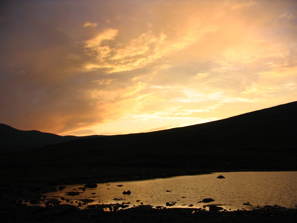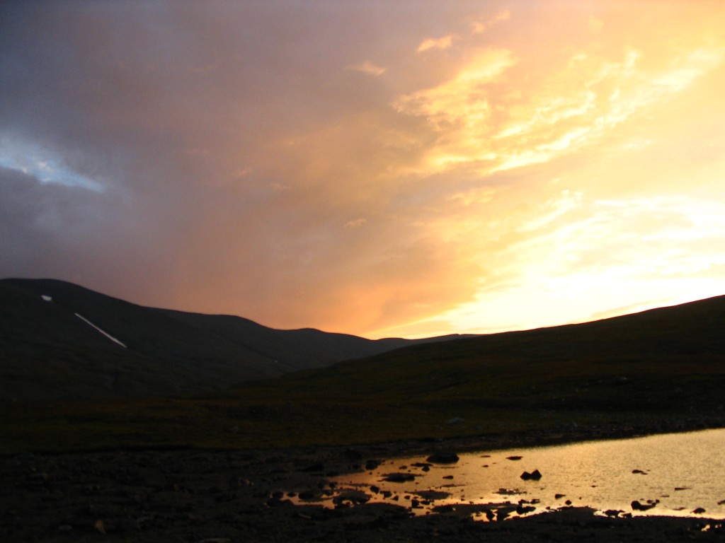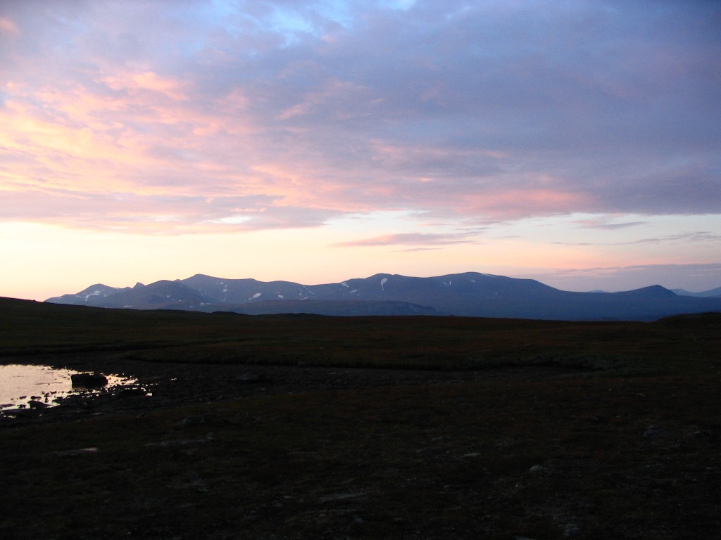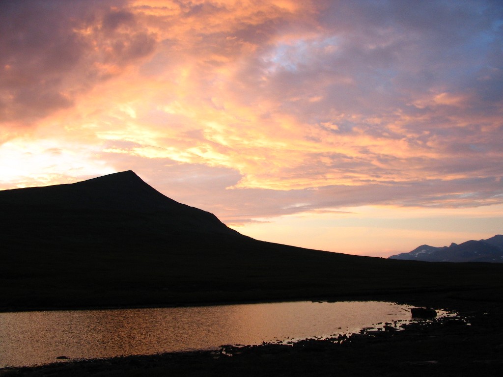 It was now raining in full, and it was also rather windy. I tried my mobile phone, and it could just make contact with the net, but it was too feeble to make calls. When the rain stopped (which it soon did) I went out in search of a spot with better signal strength, which I found, and proceeded to reserve a train ticket home – seats were all they had left, and not many to boot, so that would have to do. Then the sun returned, but it was apparently at the price of losing the north, as it were. It was warm again, and I had some reindeer meat and chocolate, played solitaire, and read for a bit outside. It had gotten rather dark over Sarek, but it remained fair enough (and somewhat windy) at my location. I read some more inside, during which I heard some distant thunder, and then I went outside again to make dinner.