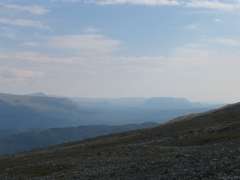 I followed these for a bit, but as the terrain started sloping down towards Vállevárre I found my own way, while all the time being observed by reindeer. The east looked rather bad, but it was clear behind me and to the north, as it had been all the time; it was obviously only the lower areas around Kvikkjokk that were affected. I headed for the northernmost of two pools marked on the map, since I knew both from the trio I had met earlier and from research that finding water on Vállevárre is next to impossible – I had seen that both pools indeed still had water in them from up the slope already.