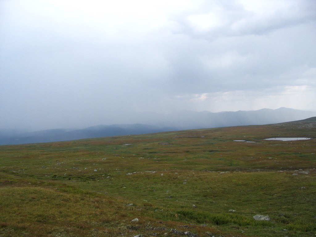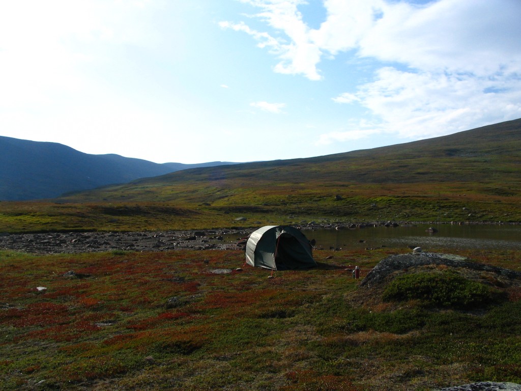 Just as a few drops started falling at 14:45 I stopped by the southeastern shore of this pool, which looked sizeable enough to be usable as a fresh water source – especially since I would mostly need its water for boiling anyway – but I dumped the pack to go in search for the brook the map claimed would lead from the pool down to Vállebäcken, to see if I could find running water. Not surprisingly, it was dried out as well, but at least I found a few cloudberries in the process. When I returned the drops had stopped, and I started pitching the tent. More drops came as I was fixing the guylines, but I made no haste, and I was just finished when the density of the falling water increased.