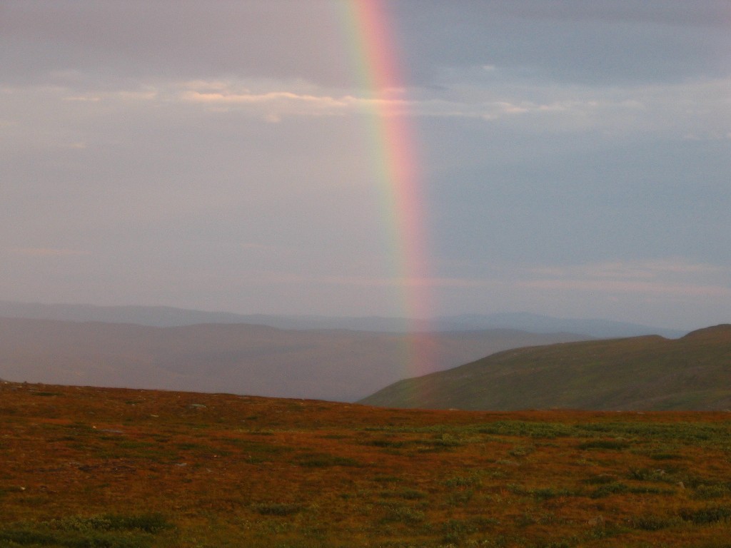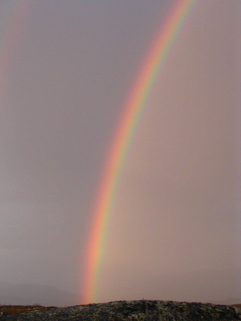 The wind decreased somewhat, but the rain increased to match instead, and I continued to read in my book as the wind tried to decide whether to be strong or weak. Finally the mini-storm broke and light returned – and upon peeking out of the tent I found myself looking at the most incredible rainbow I have ever seen! The high water content of the air obviously reflected considerably more light than your average rainfall residue, and behind it the heavy rain had passed on towards the southeast.