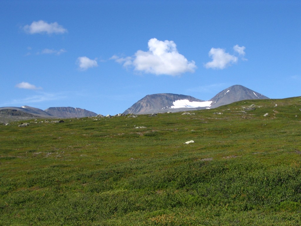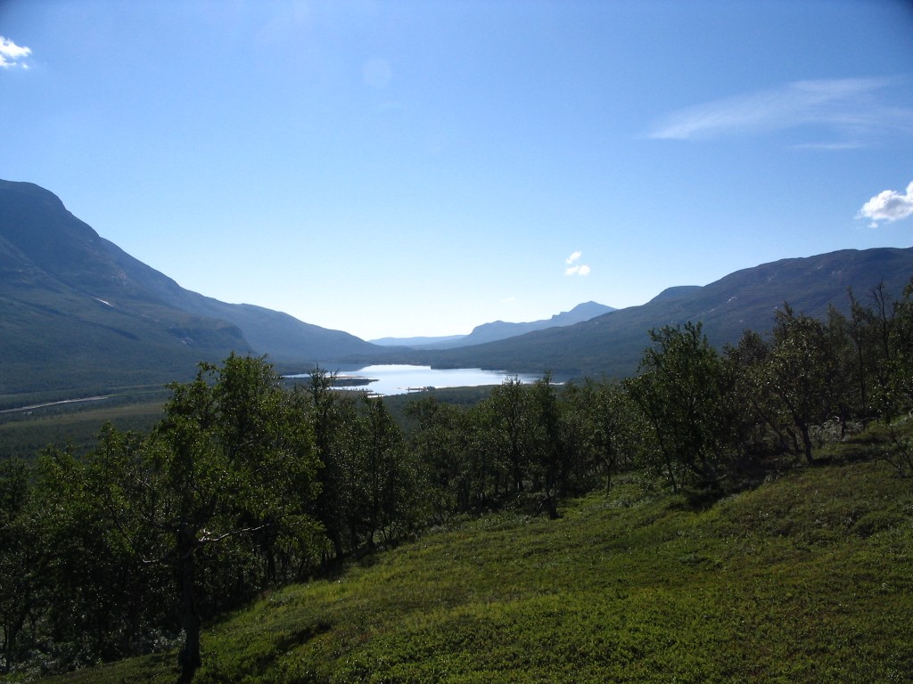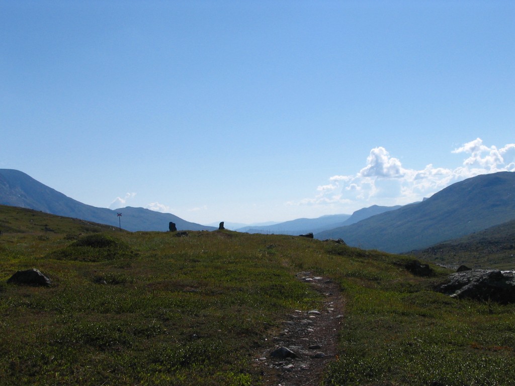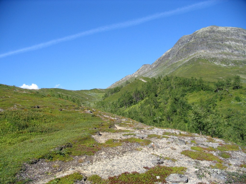 The trail was continually good through the forest, which mitigated the merciless sun somewhat. Soon, however, as the terrain started to rise up into Gurávágge, the trees came to an end and things got warm indeed. I took off my hat to get some relief, but truth be told, the far-reaching views that opened up had my mind occupied. After I had passed the first, steeper portion of the slope the land took on a character which I classify as "typically fjeldlike" – a configuration I find most pleasing in all respects, and walking was a delight.