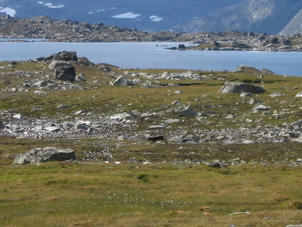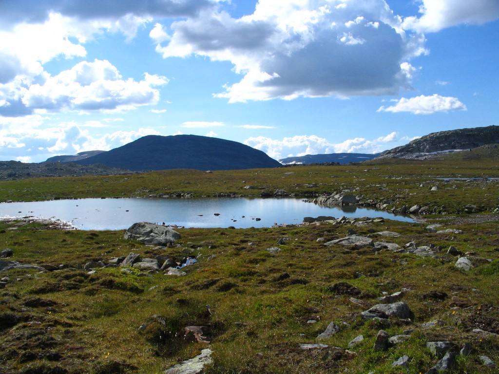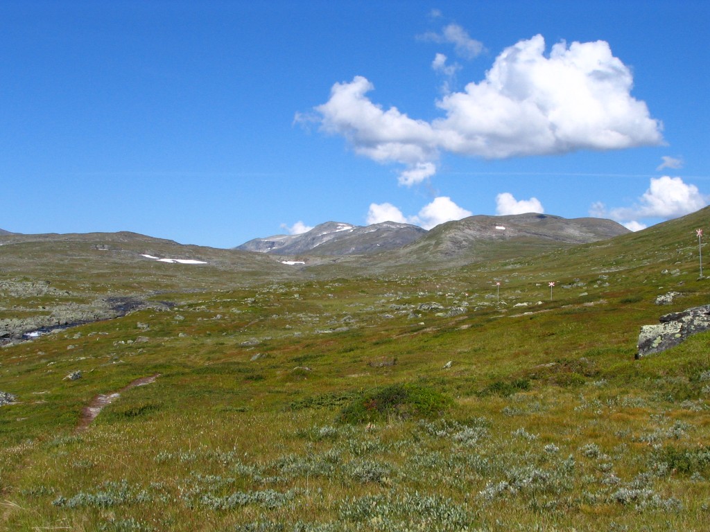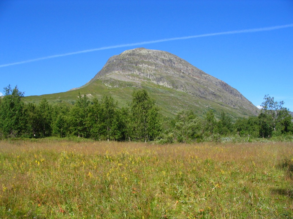 The trail was continually good through the forest, which mitigated the merciless sun somewhat. Soon, however, as the terrain started to rise up into Gurávágge, the trees came to an end and things got warm indeed. I took off my hat to get some relief, but truth be told, the far-reaching views that opened up had my mind occupied. After I had passed the first, steeper portion of the slope the land took on a character which I classify as "typically fjeldlike" – a configuration I find most pleasing in all respects, and walking was a delight.