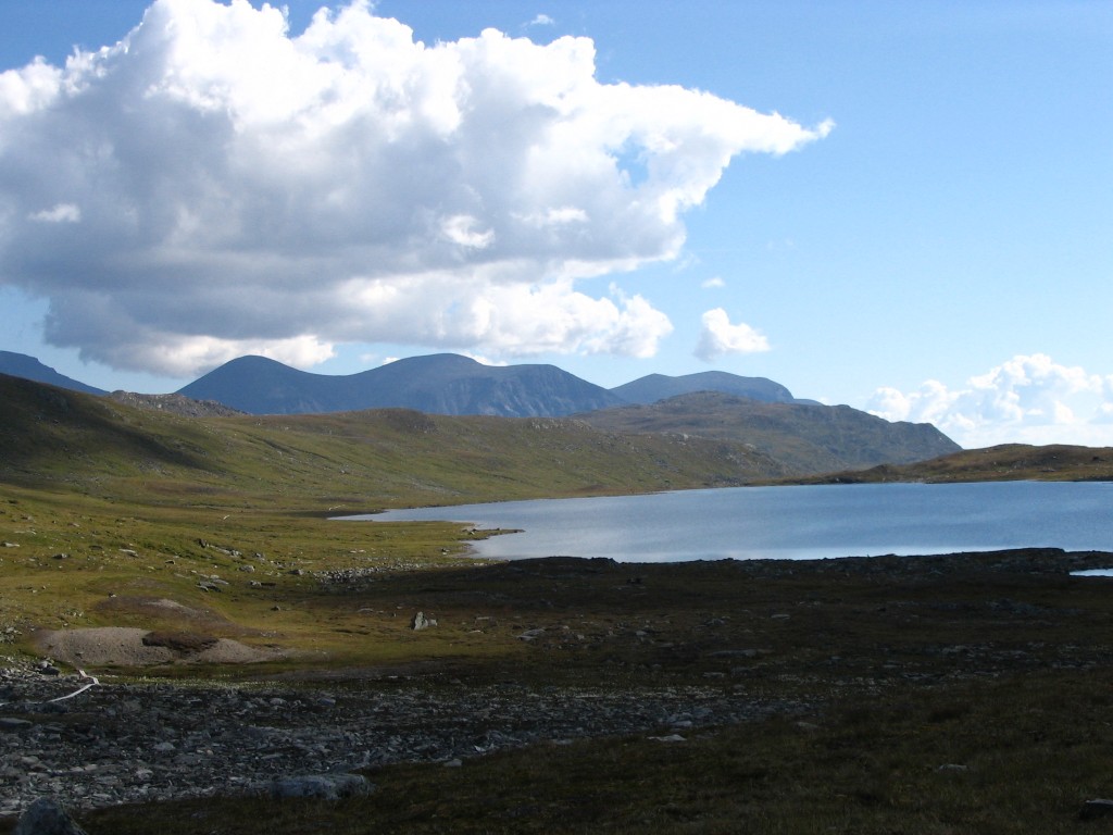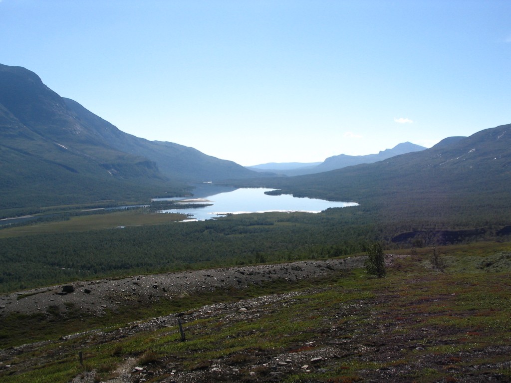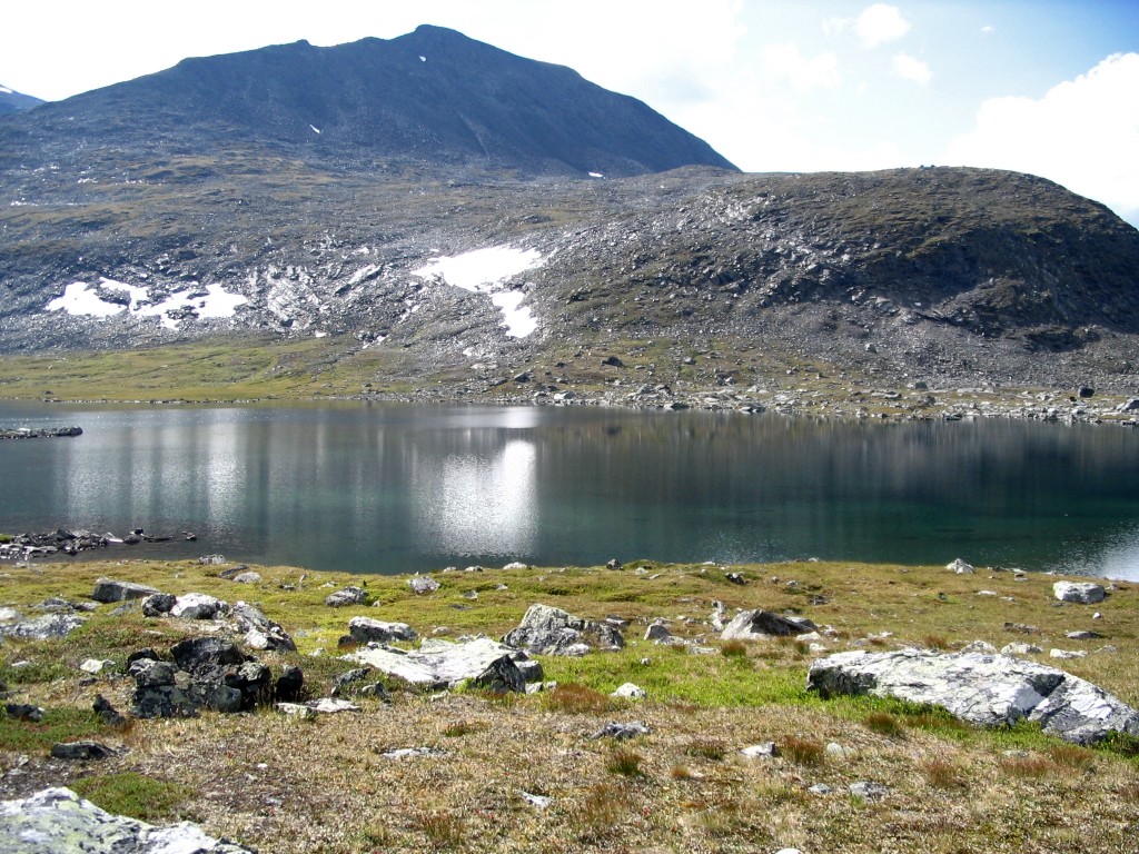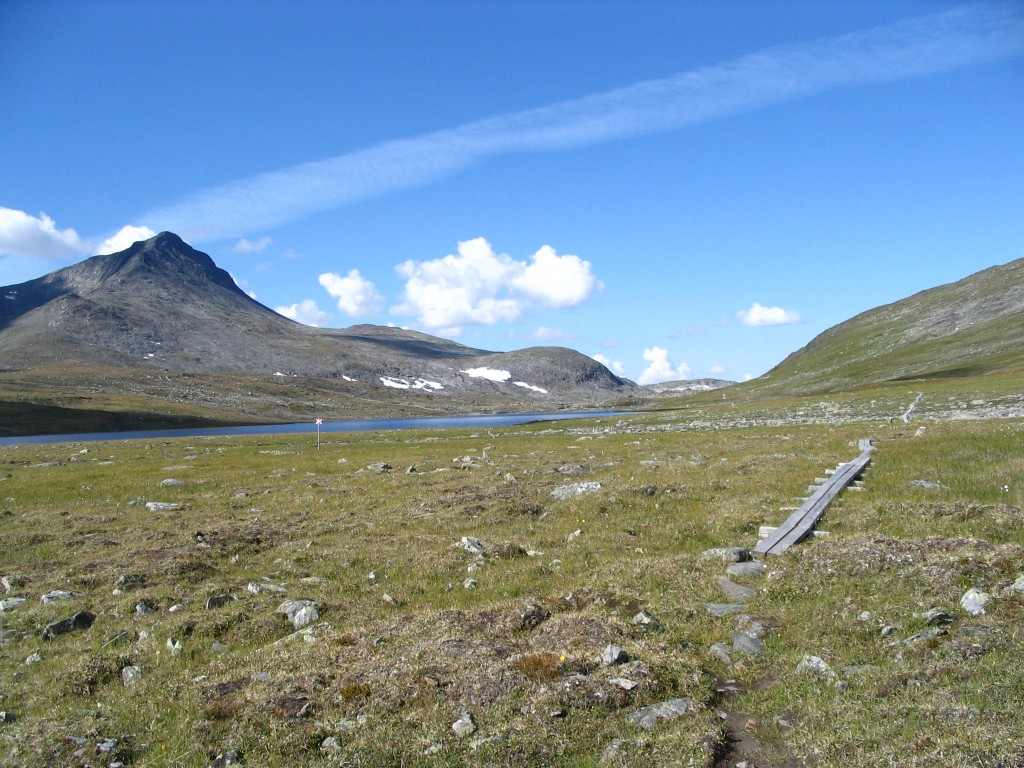 The first bit after the shelter consisted of a rock field which demanded some care, but then ground conditions improved. It was warm at first, but the wind soon picked up again, bringing the perceived temperature down to a comfortable level. There were some duckboards here and there, and the path was mostly easy, but it was stonier between the lakes. It was also stony in the little pass of sorts just before the descent into Vájmokvágge, but once I was over the crest it was nice grassland sprinkled with rocks. From that location I also had a fantastic view over the large lake Vájmok in the immediate area, and some of the peaks of the Sulidälbmá massif in the distance.