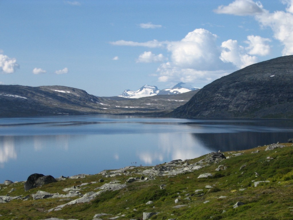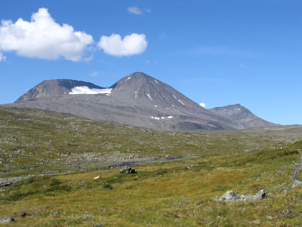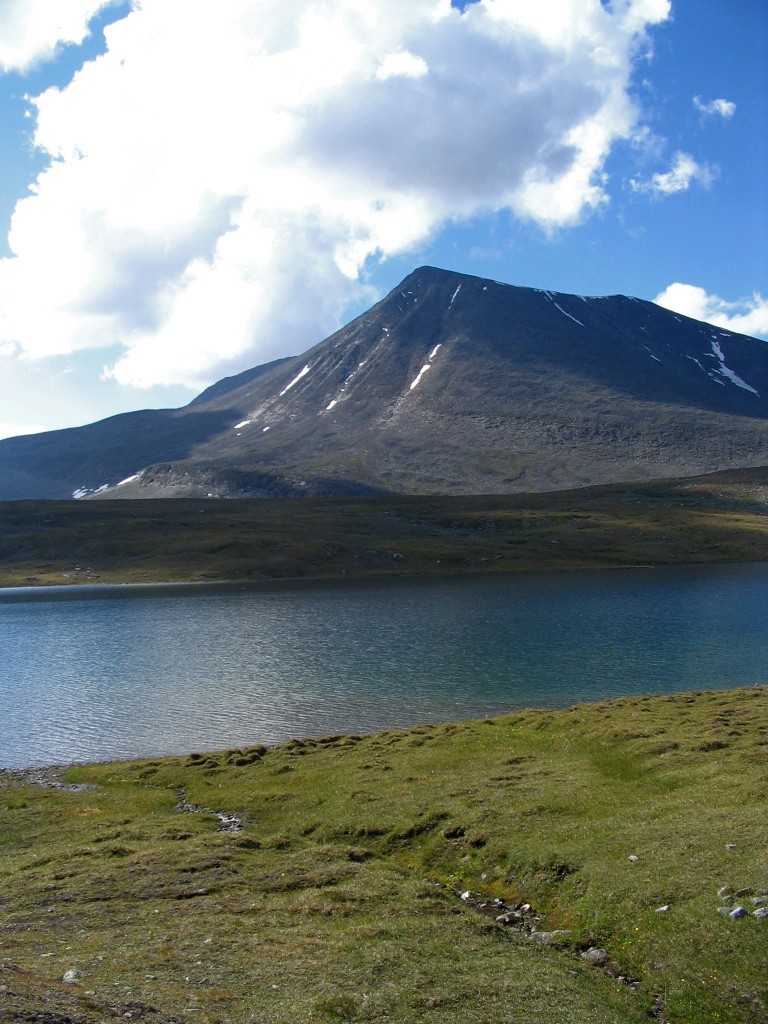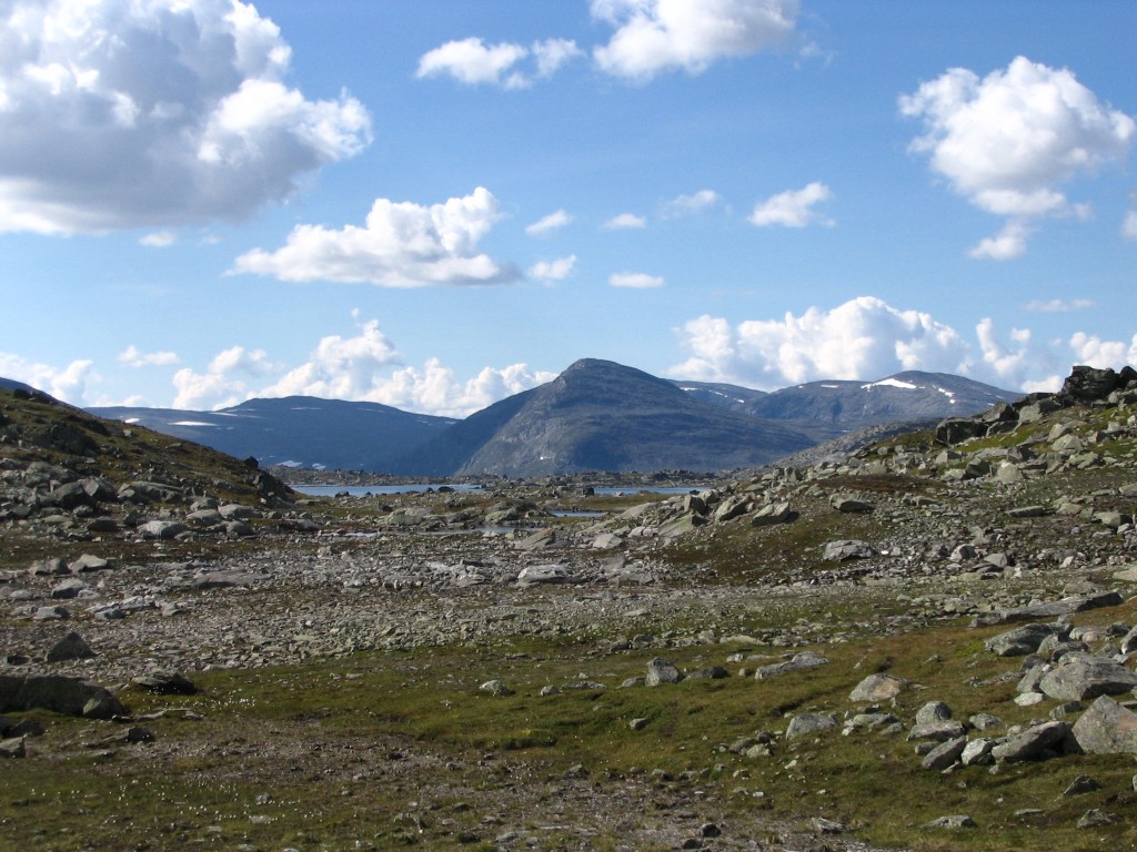 The first bit after the shelter consisted of a rock field which demanded some care, but then ground conditions improved. It was warm at first, but the wind soon picked up again, bringing the perceived temperature down to a comfortable level. There were some duckboards here and there, and the path was mostly easy, but it was stonier between the lakes. It was also stony in the little pass of sorts just before the descent into Vájmokvágge, but once I was over the crest it was nice grassland sprinkled with rocks. From that location I also had a fantastic view over the large lake Vájmok in the immediate area, and some of the peaks of the Sulidälbmá massif in the distance.