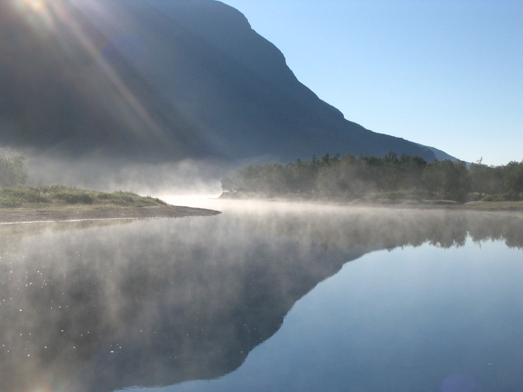 Once sleep came over me there were no problems, and I actually awoke refreshed at 07:15. The morning was as fair and tranquil as the evening had been, with the added attraction of smoke on the water. I had breakfast outside while watching the mist dissipate, enjoying the quiet beauty of it all. I packed up my stuff, swept the hut clean and was ready to leave not two hours after I arose.