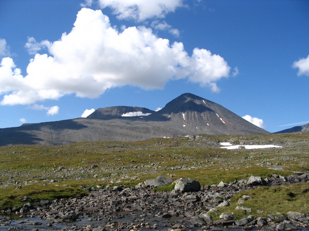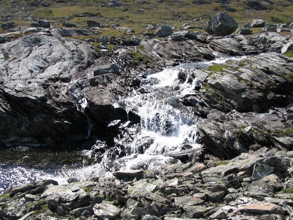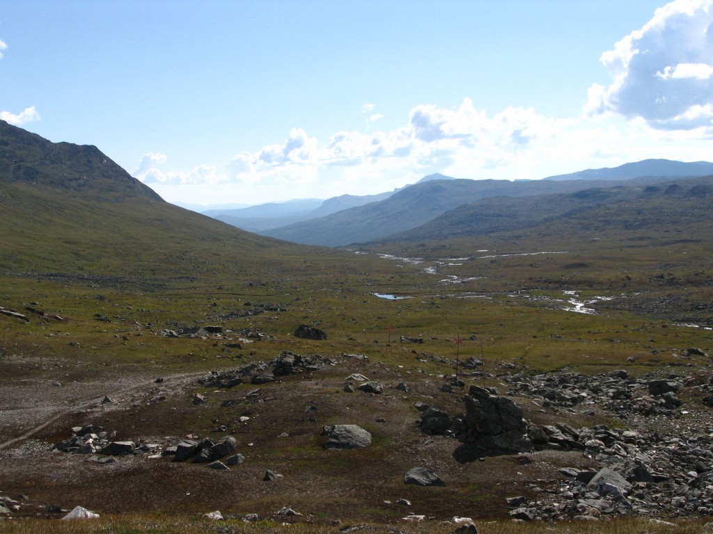 When the trail had stopped descending, going got tougher since the concentration of rocks was higher, and the terrain itself was very uneven. Another factor in the equation was that I could see the Vaimok cottage several kilometers away, which was psychologically trying (but not so trying as the northern approach to Alesjaure, which I took last year). The sun was mostly clouded during that portion, though, so I didn't have to worry much about the heat, but it reappeared in full when I had almost reached the cottage – an event which took place after 15:15 (the thermometer then showed 25°C).