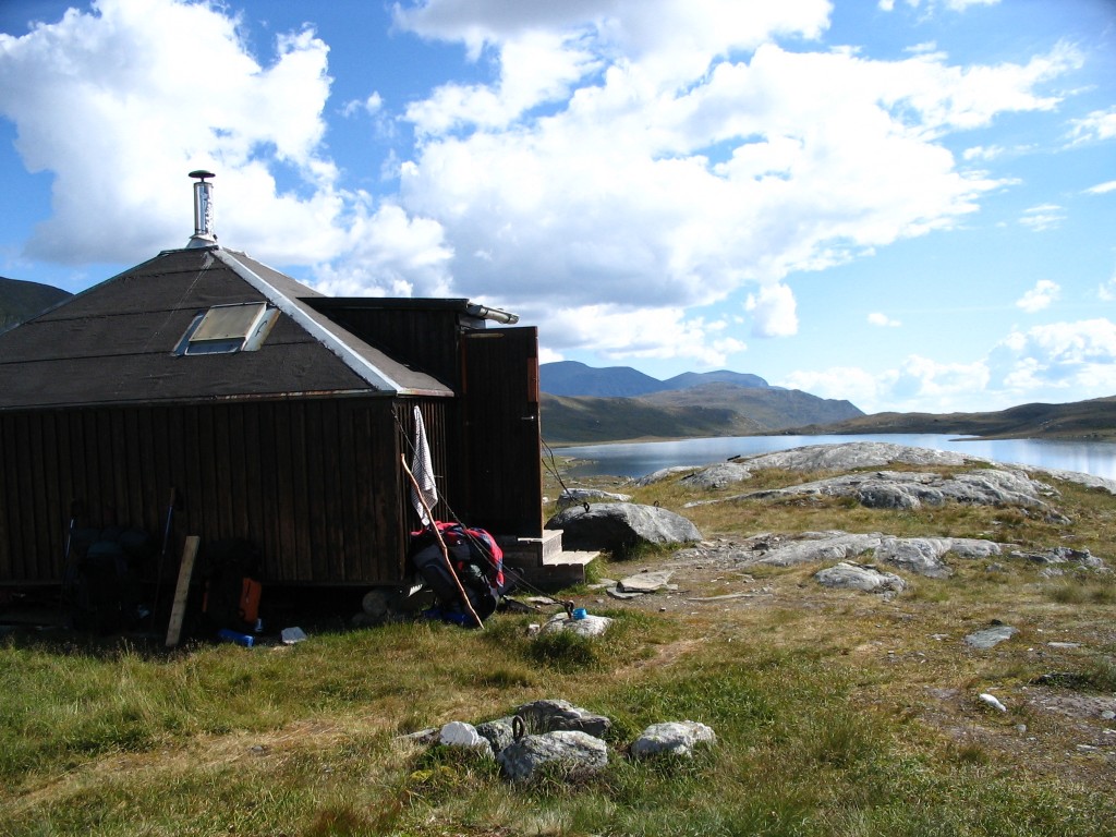 This shelter is of an unusually large kind, with a regular firewood heater, a privy, a storage shed, and even a swill disposal construction; it's obviously intended to function as a crude cottage if need be. There were a couple of fishermen present when I arrived, and although they had spread a fair amount of stuff around inside, their main place of residence was a tent close by. From what I gathered, their group had originally consisted of four, and they had been there for several weeks, with party members coming and going. The sun had just been clouded, for the first time that day, and together with the wind this made me seek the shelter of the shelter for my meal.
