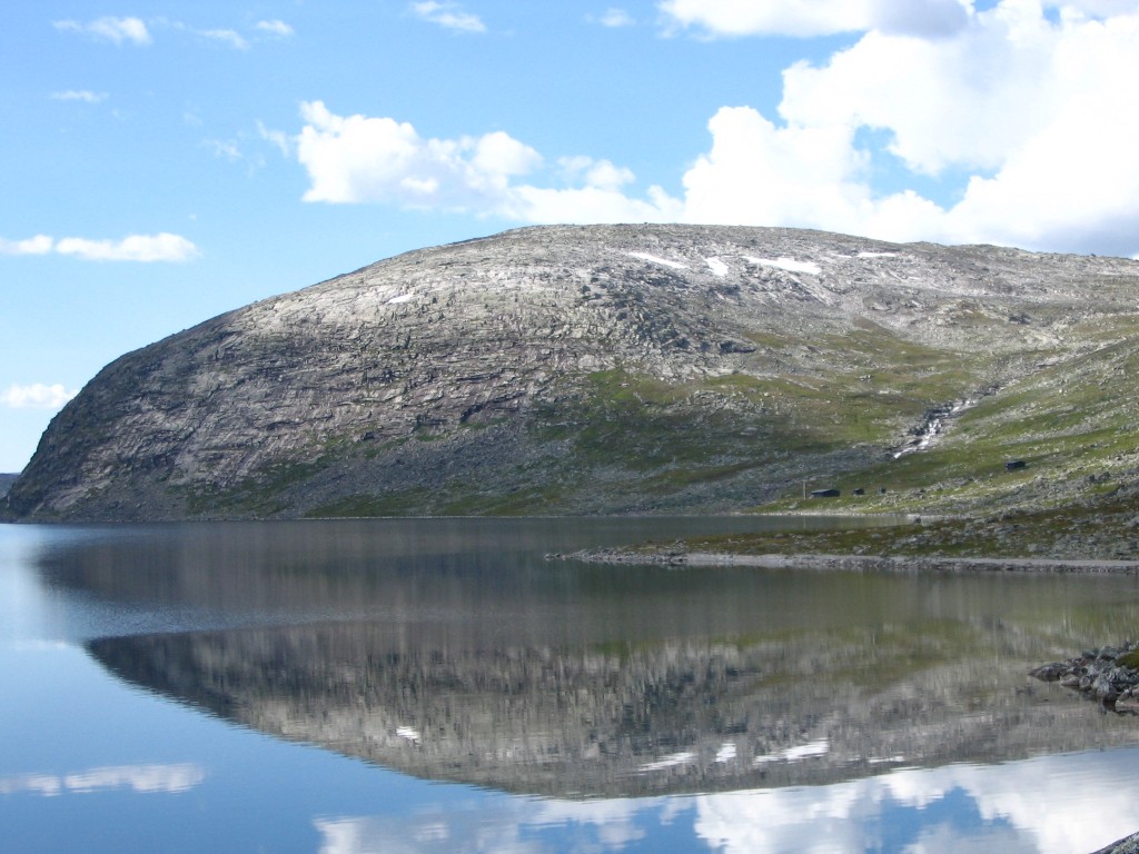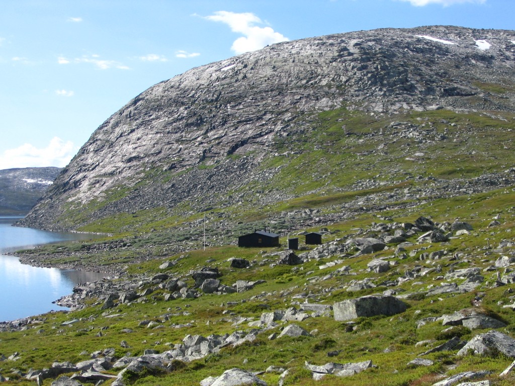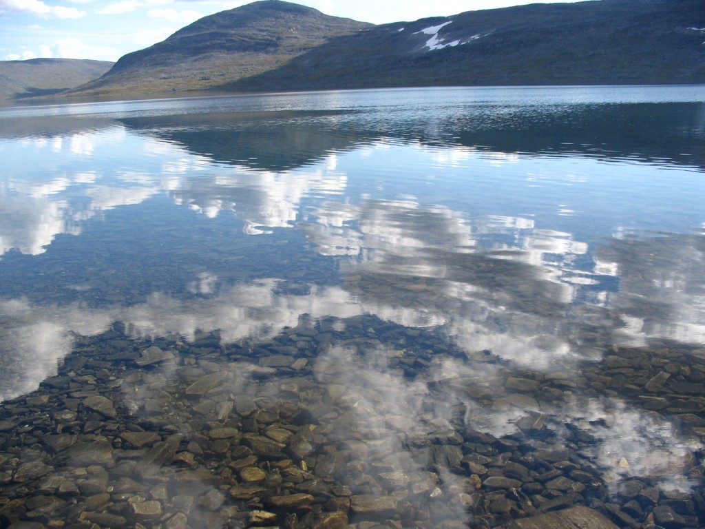 The warden was out on a day trip, expecting to return in the evening, and there was no one else around. I went down to the lake – which is one of Sweden's clearest, with a depth of vision of about 17 meters – and had a pleasurably cold wash of sorts. I knew that I wanted to stay in the cottage for the night, so I picked a room in anticipation, and went to fetch water. I then sat down to read in a Sámi book inside, and after a while of this activity I happened to glance out the window just as a pair of hikers appeared on the trail atop Vájmokbákte, heading down towards the cottage. They were, however, beaten to it by the warden, who returned earlier than presumed.
