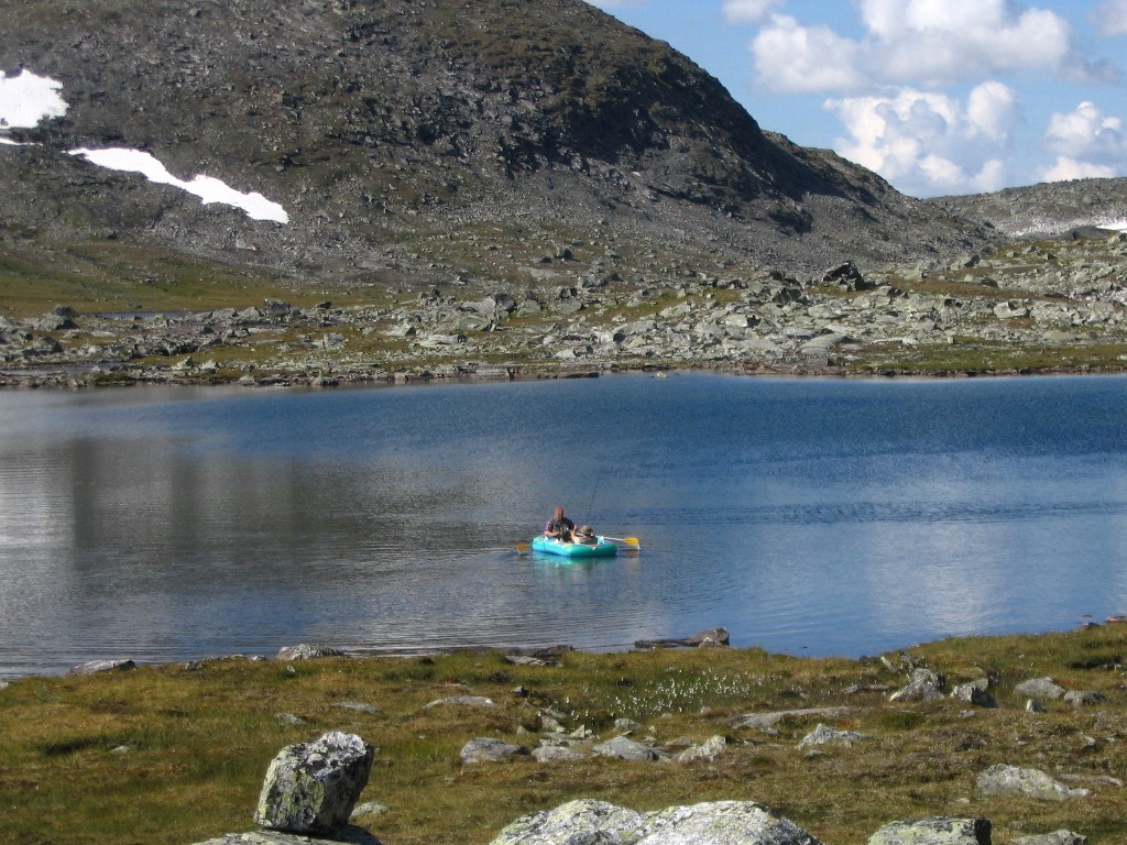 After I had eaten the couple caught up with me once more, and after a bit another two people came from the west, but they passed by without slowing. While the couple went down to the little stream to prepare their lunch, the fishermen did something unexpected – they brought out a skiff and paddled out onto the adjacent lake! I wonder how they decided which one of them was to carry that... For my part, I took it easy in the midday sun as the blocking cloud had passed.