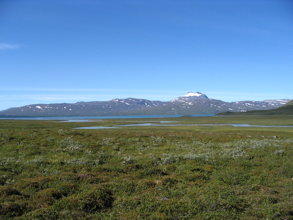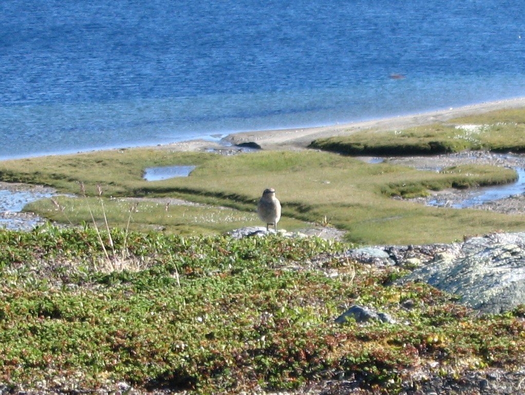 I forded the stream that flows down immediately east of Bieskevárásj without difficulty just above where it splits into many arms, and climbed up a bit on the other side. I looked things over, for a while considering to pitch the tent on one of the multitude of grassy islets formed near the lake (as can be seen, somewhat fuzzily, in the bird picture below), but decided against it; instead I found a very nice patch of mostly even heath a little bit upstream, close to the brook, and set about camping after 16:00.