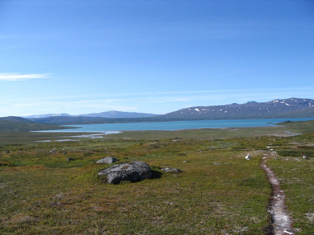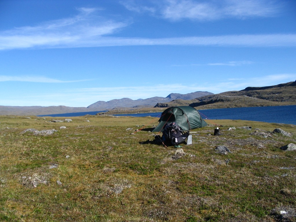 A bit later I saw the reindeer-watching huts at the eastern end of the lake, and as I got closer there were some paths which albeit still faint I could be reasonably sure had been made by human feet. The huts were all locked up, and there was nothing to indicate that their owners had been there recently. I passed them by, and went out to the edge of the cliff that separates Hádditjávrre from the considerably larger Råvejávrre, and scouted for a suitable camp site. When I thought that I had found one, I followed one of a large number of paths going around the rise atop the cliff, and then went straight down to the shore of Råvejávrre, which in that area consists of fine sand.