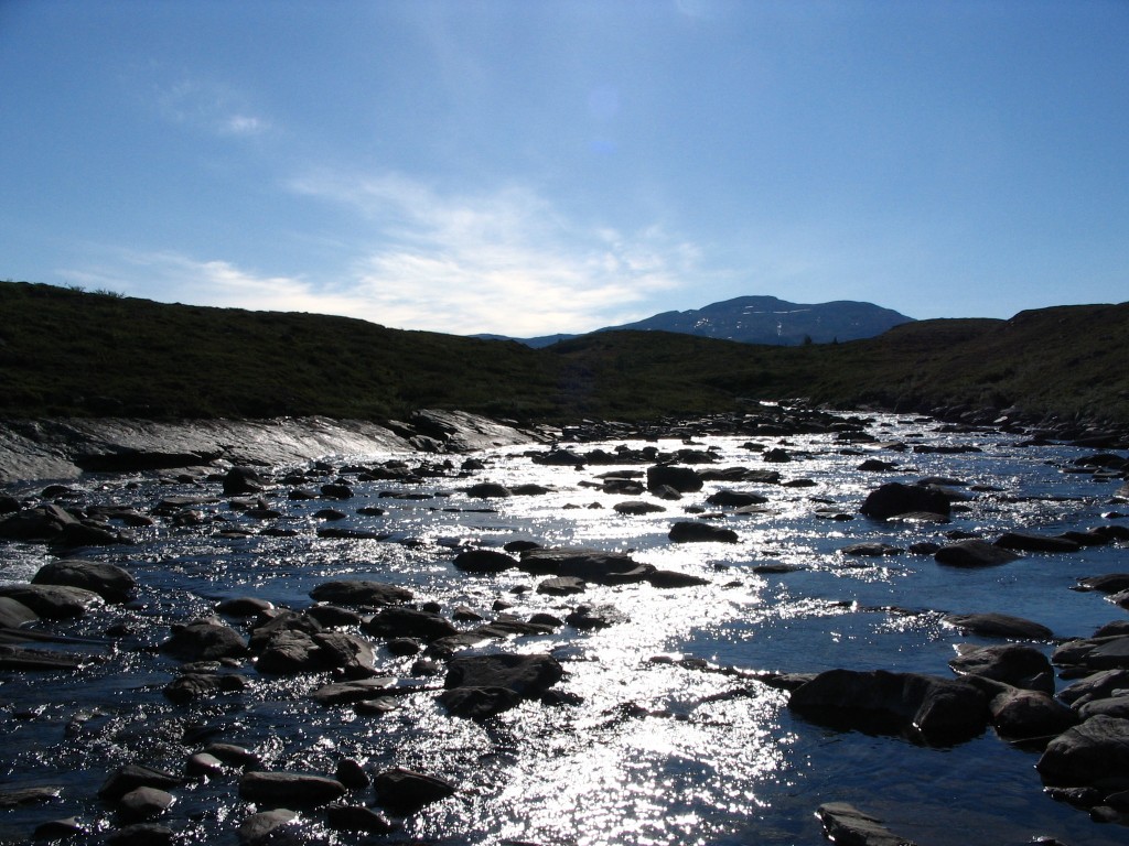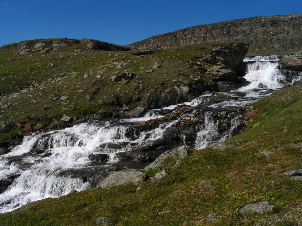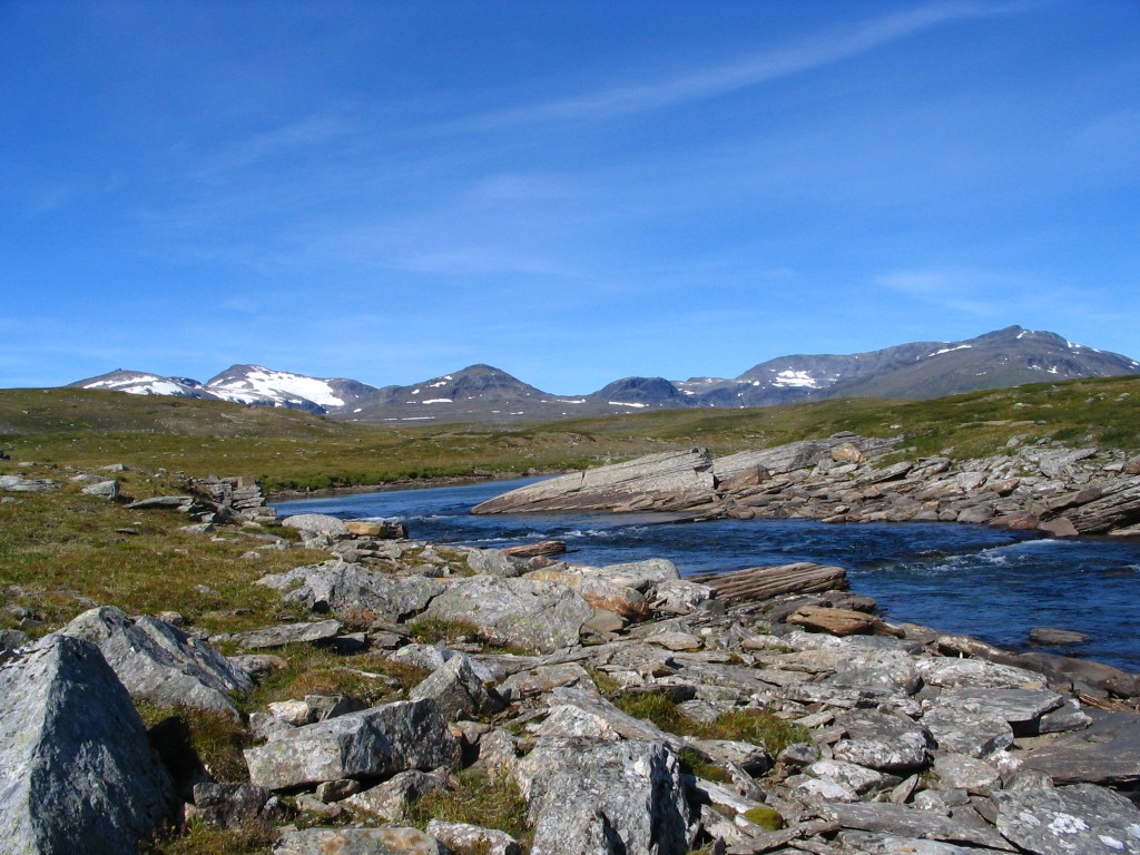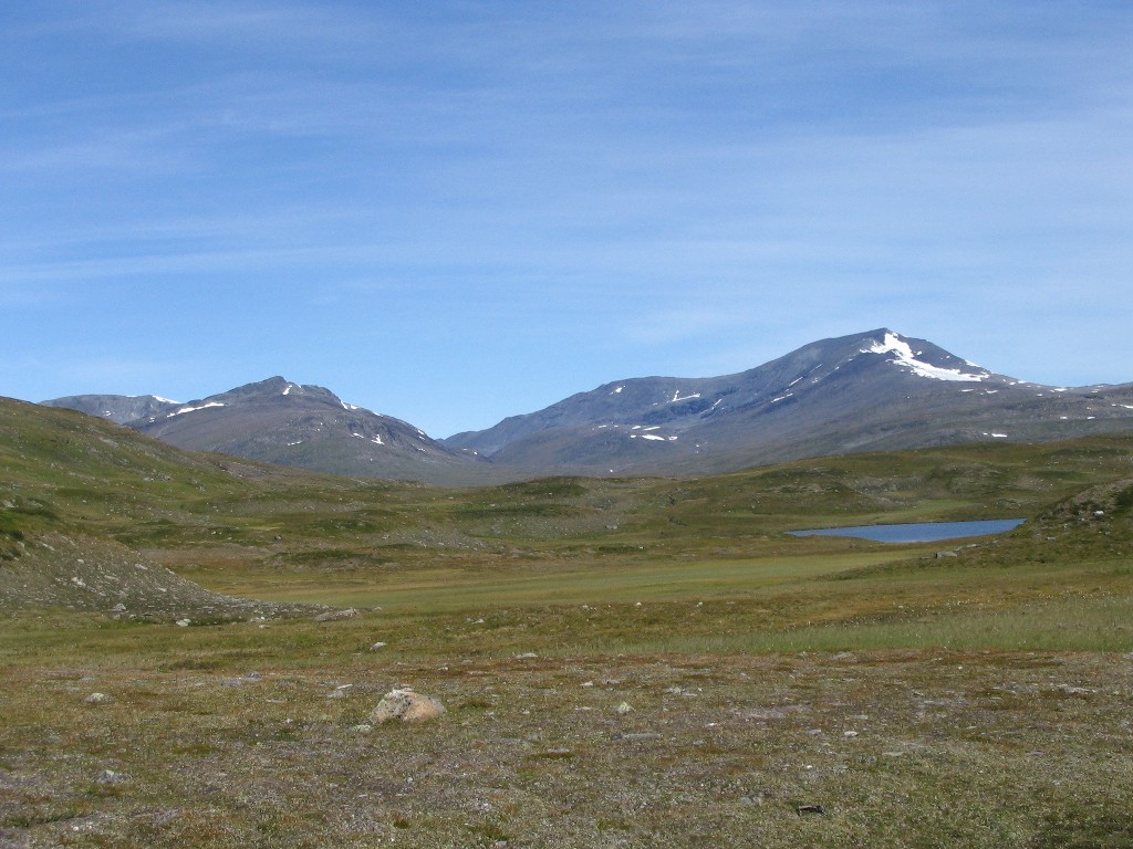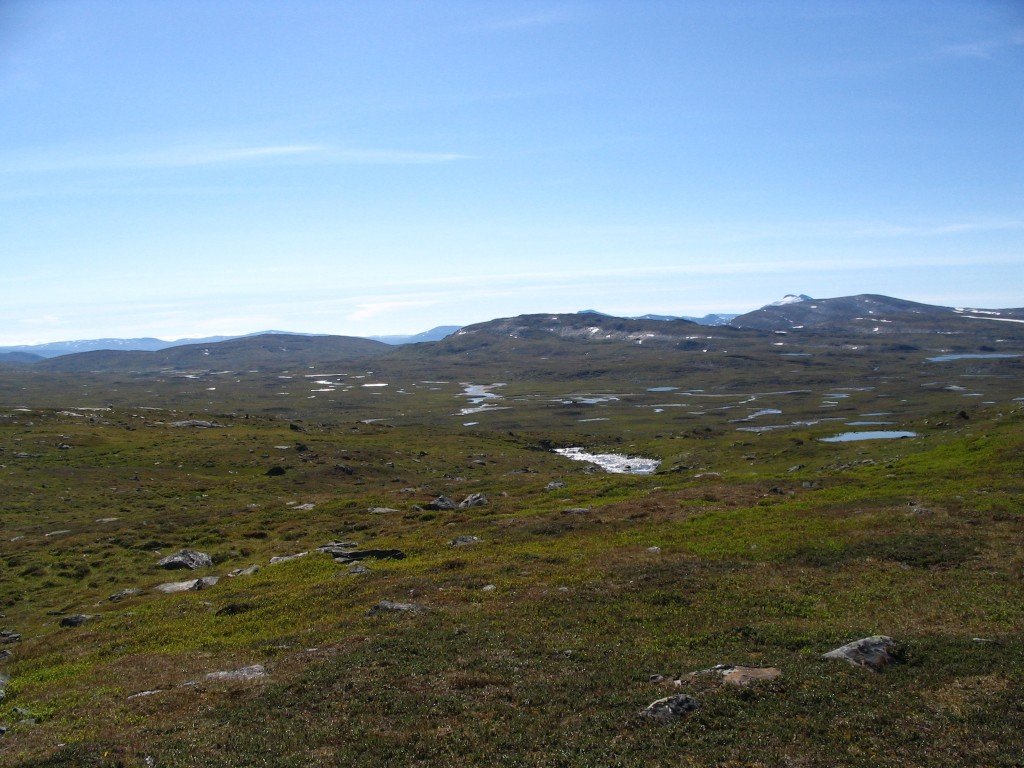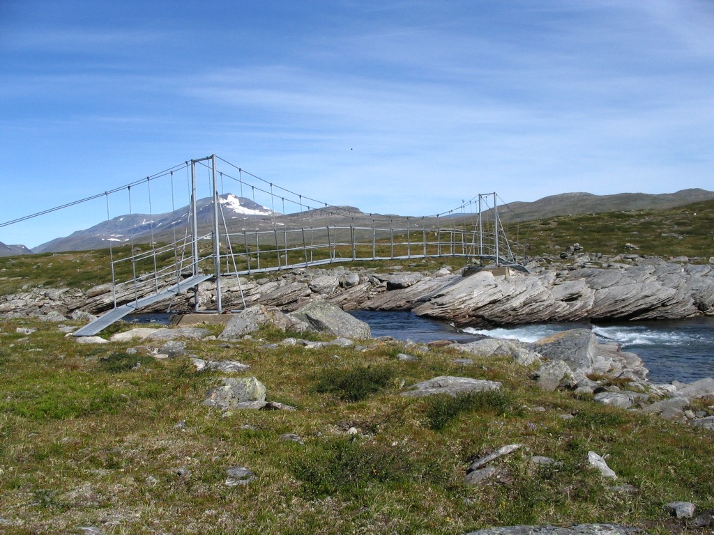 That didn't mean squat, though, since the low water levels made crossing the brook in question a simple matter of putting one foot in front of the other. I passed another none-bridge, and then found that the second marked bridge was also broken – this time it had even been pulled from its original setting and placed as a heap of timber a bit from the brook! Continuing was as easy as before, of course, and I soon found myself at the larger (metal) bridge over the significantly larger Varvvekjåhkå – that, at least, was whole. I sat down with my back to a rock on the western brink to eat just after noon.