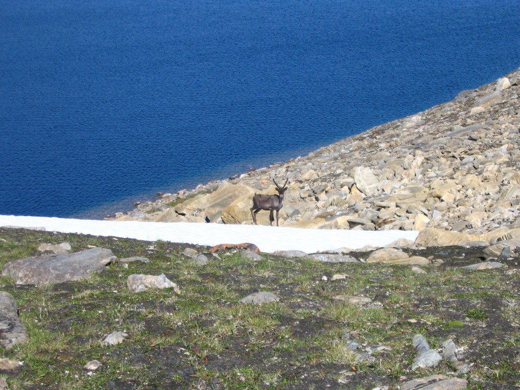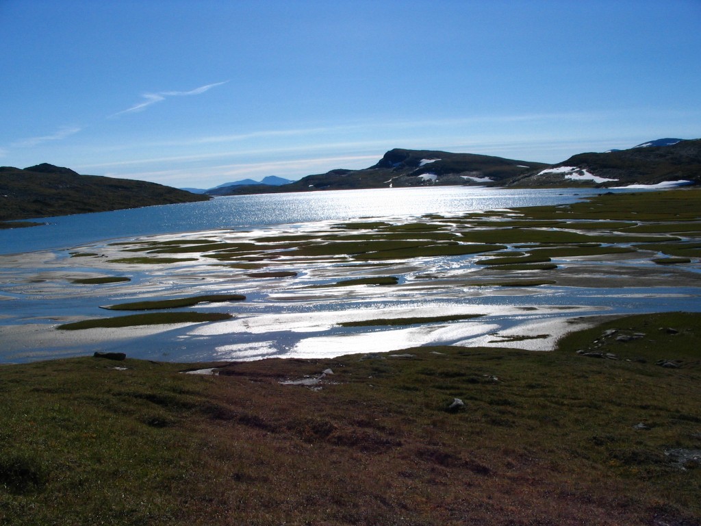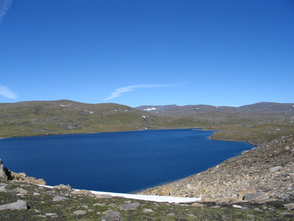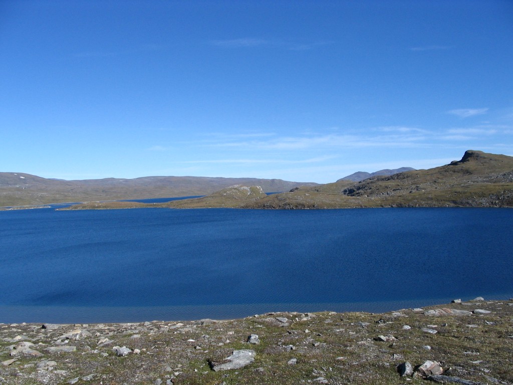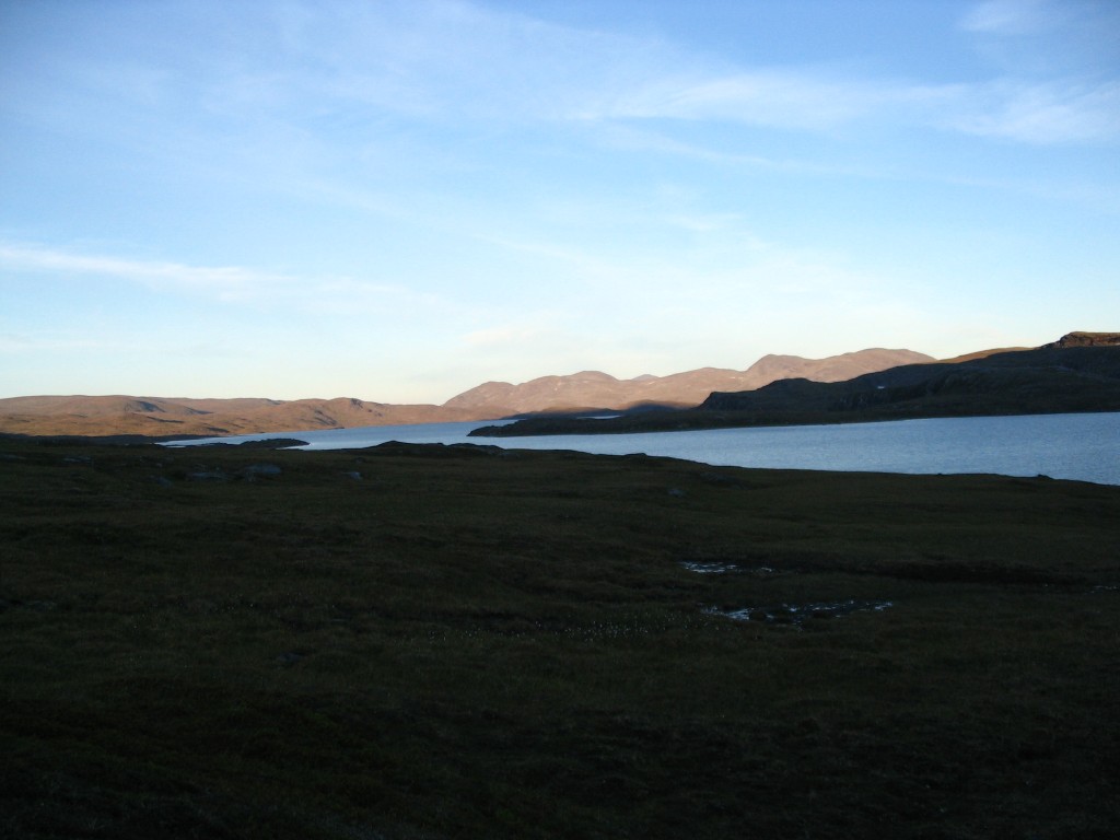 The terrain slanting down to the southern shore of the lake was very uneven, and after a while I descended to the water. A little ways later, in a patch of wet sand, I saw a number of reindeer tracks, but the ground was too dry and coarse in all other places to retain any kind of marks. Soon I had to climb the slope again, since the incline down by the shore grew too steep; going was not really difficult per se, but somewhat demanding just the same.
